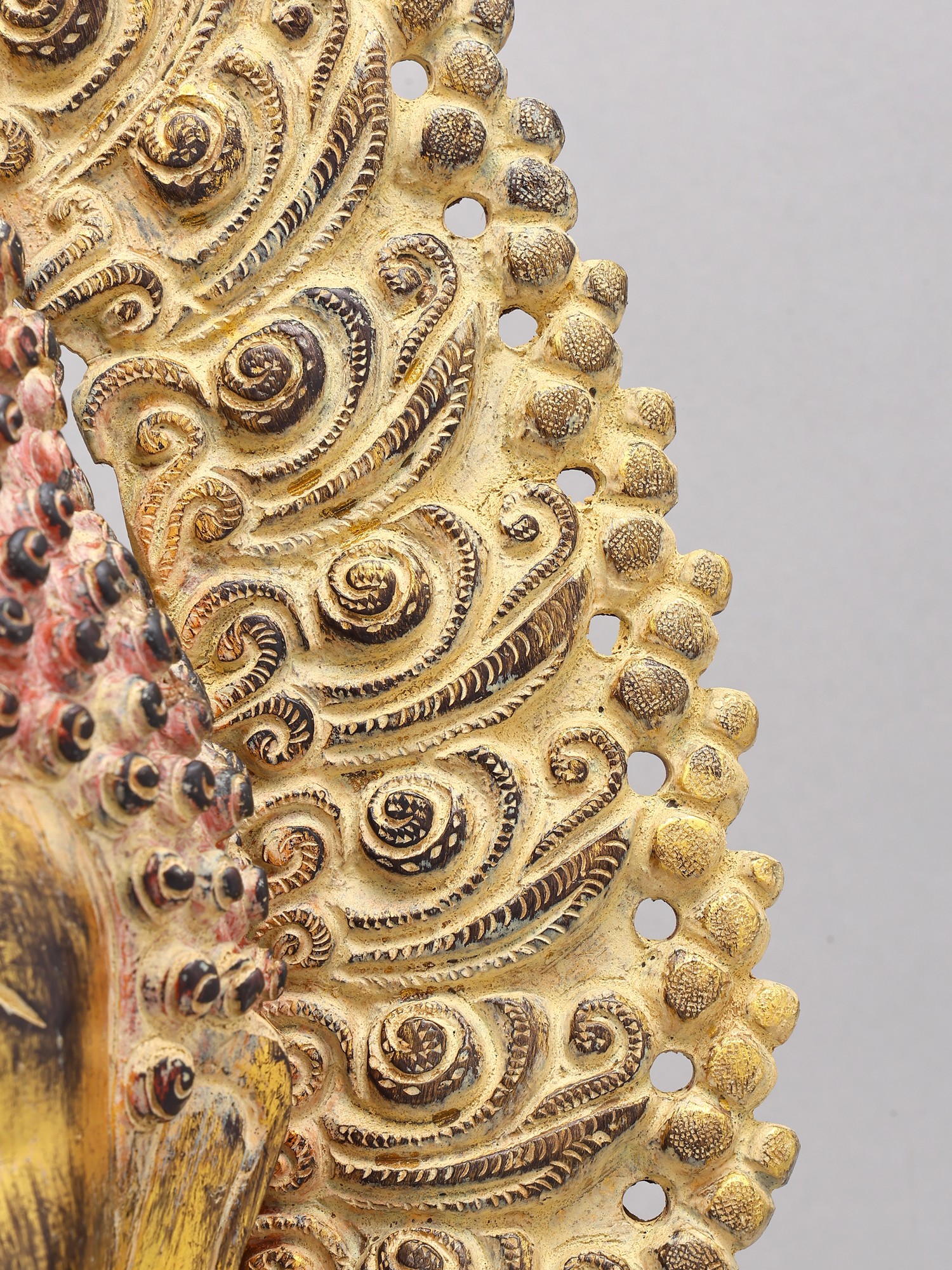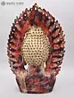 A massive head of curls, the silhouette of which resembles the traditional Buddhist stoopa. Below an unassuming decolletage, with the pleats of the robe thrown over one shoulder. The most striking aspect of this Buddha bust, however, is the elongated, densely carved aureole that starts at one shoulder and ends at the other.
