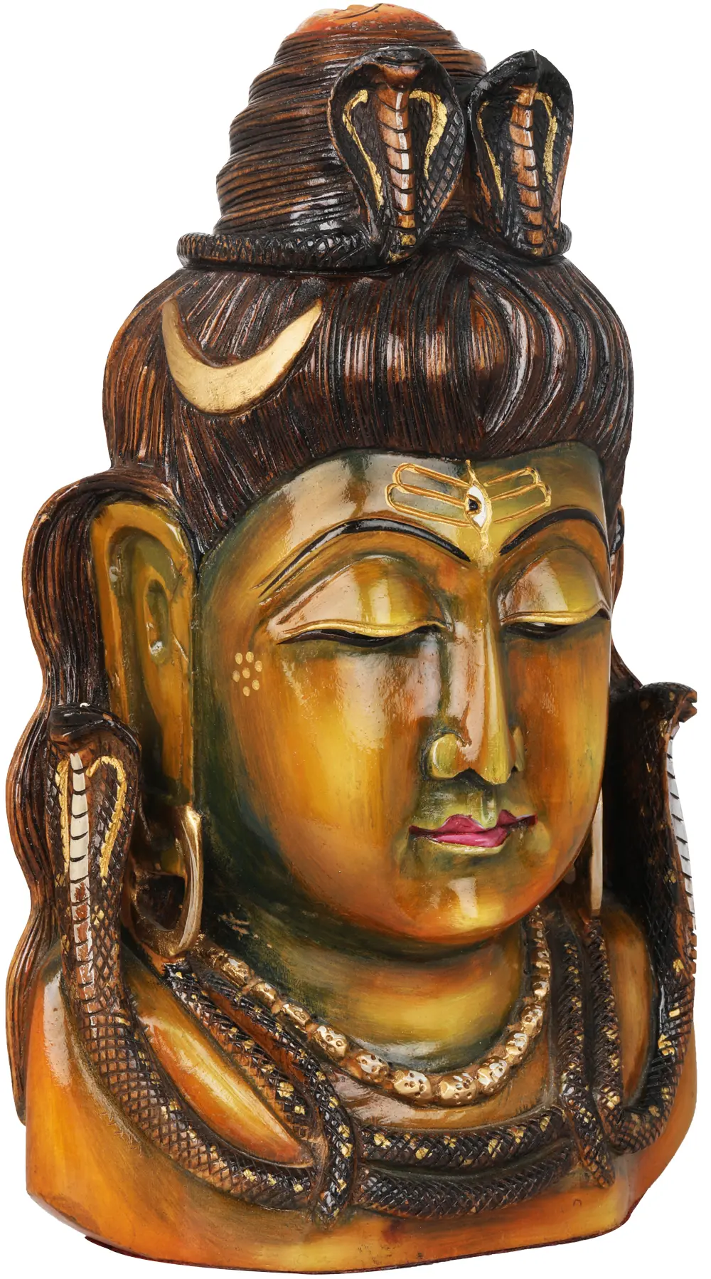 The bust is further enhanced by the depiction of a mala (garland) of rudraksha beads around the neck, a sacred seed traditionally associated with Lord Shiva. These beads are believed to possess mystical properties, offering protection and aiding in spiritual practices. The presence of the snakes coiled around the neck and chest, intricately carved with scale details, further emphasizes Shiva's connection to the primal forces of nature and his role as the destroyer of evil. The wood itself, a natural and organic material, adds a tactile dimension to the piece, grounding the divine representation in the earth's bounty. This handcrafted artifact is not merely a decorative item; it is a conduit for divine energy, a reminder of the profound philosophical concepts embodied by Lord Shiva, and an invitation to embrace inner peace and strength. It serves as a focal point for meditation and prayer, fostering an atmosphere of tranquility and spiritual awareness.