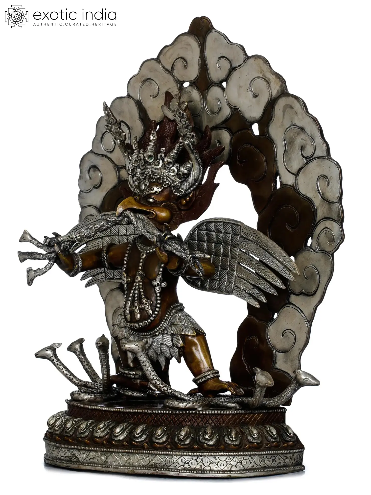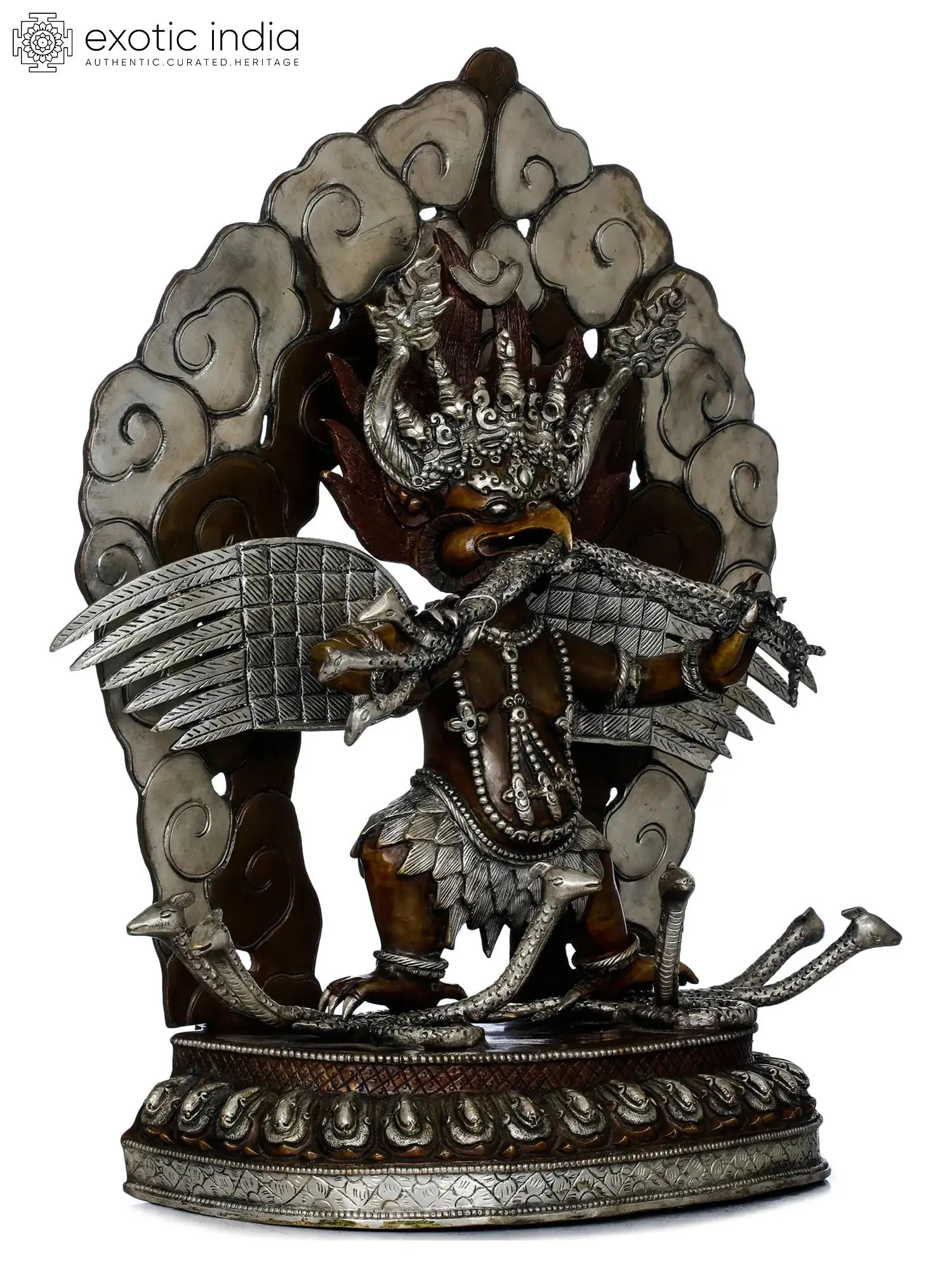 Garuda, the divine Vahana of Vishnu, is a revered figure in Nepal's Hindu culture, where devotees of the great preserver visit his shrines and statue in Darbaar Square with deep reverence. This statue from Nepal represents Garuda in a spirited mood, with his big wings flying in the air as he clutches his enemy- a Naga- in his pointed beak. Garuda is frequently portrayed in Hindu literature as an arch-rival of serpents or Nagas. Garuda's shape can be separated into two parts: human and bird. His body has a belly that resembles that of Kubera, while his wings and legs are feathered. Garuda's face is inspiring awe in the heart with its three animated eyes, horns, and fire halo, all embellished with an aesthetic silver tone.