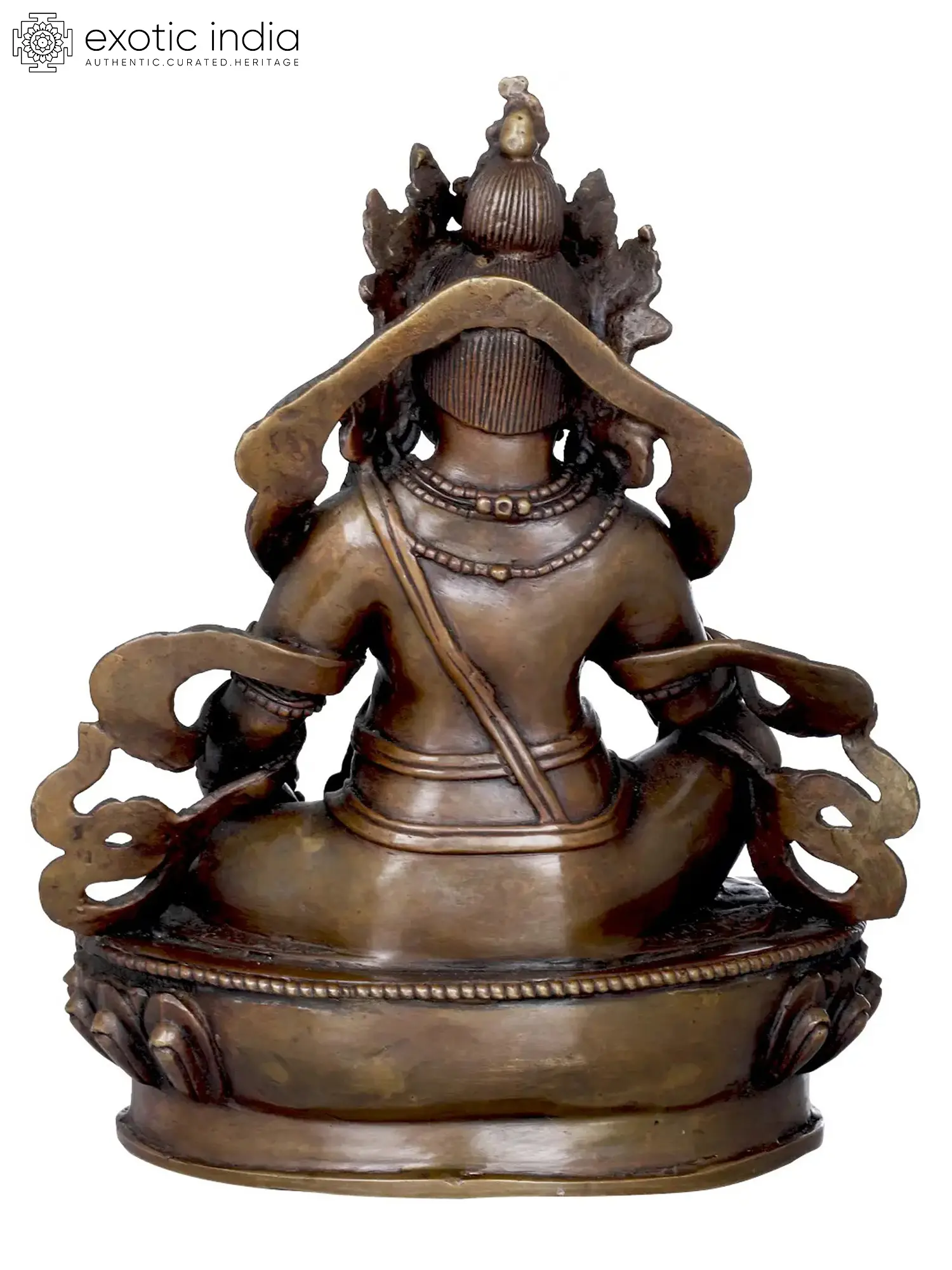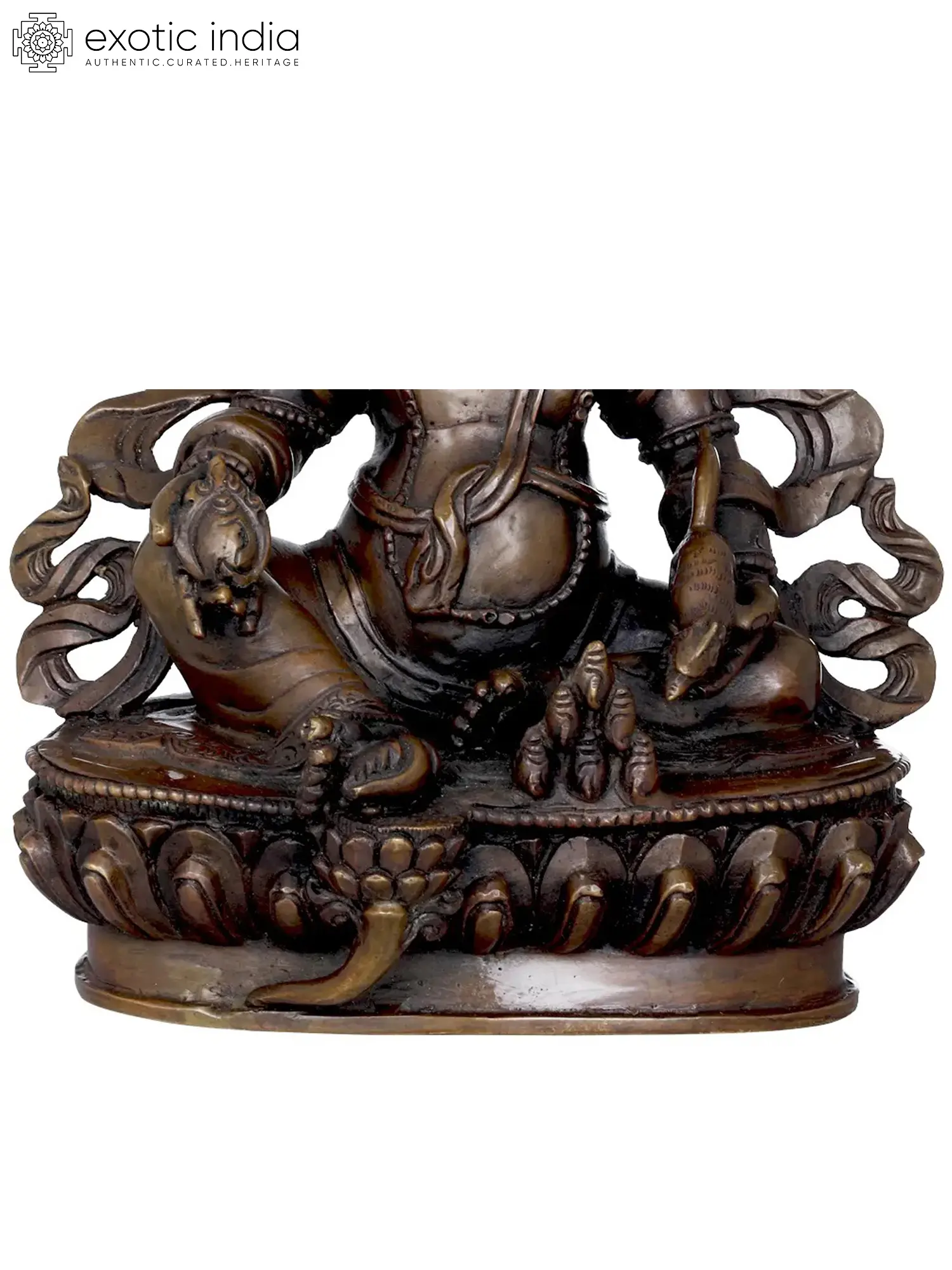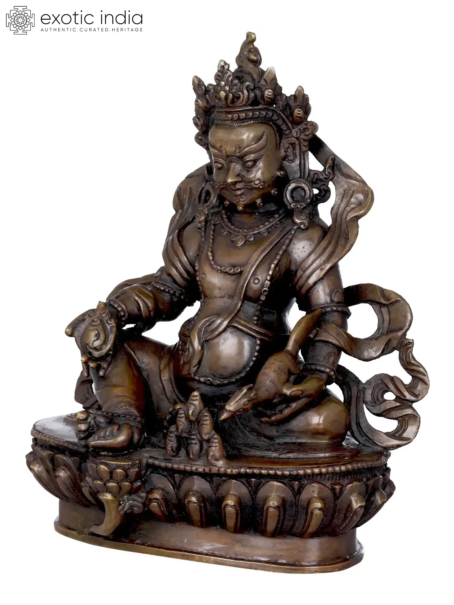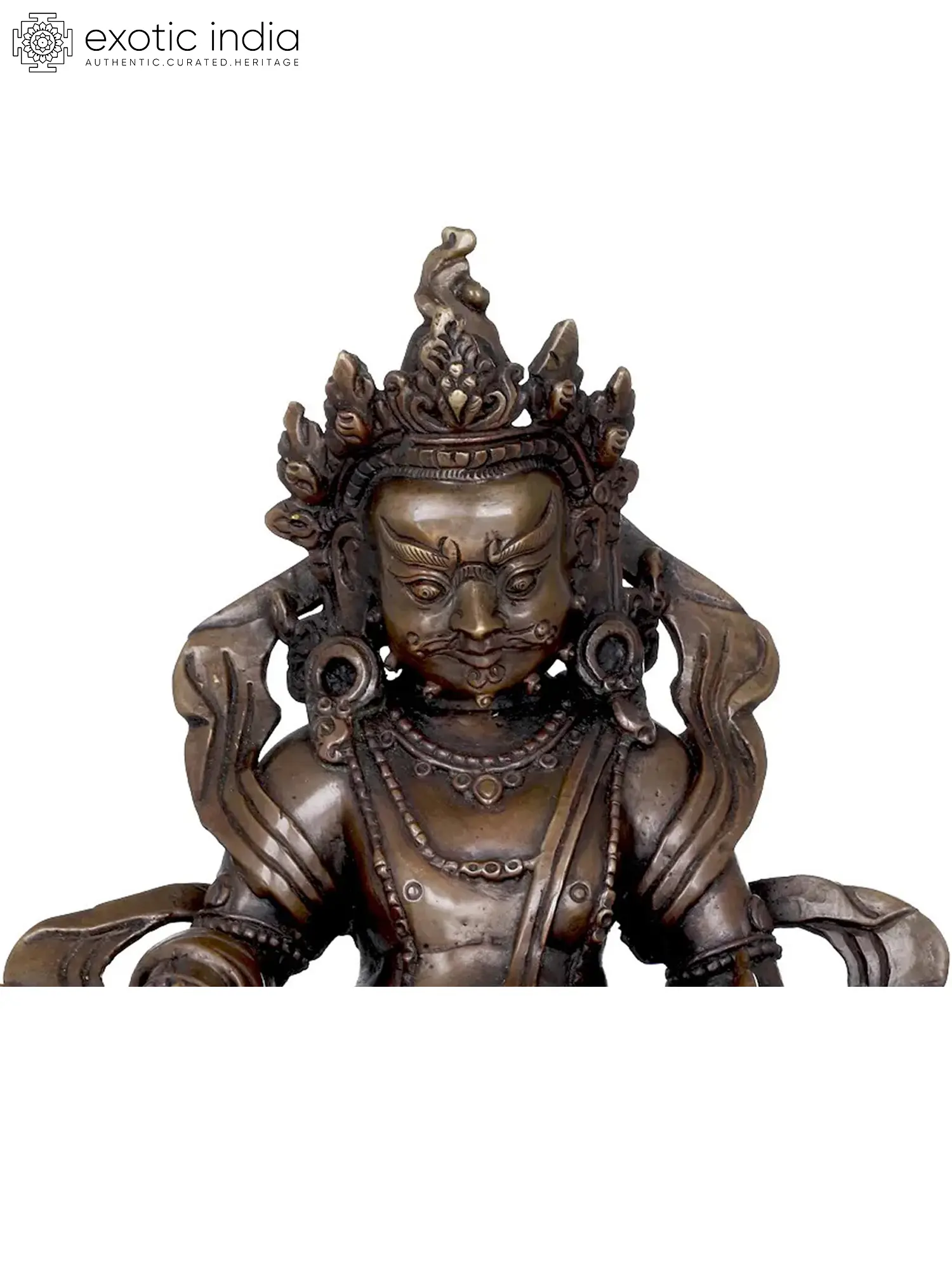 This copper statue from Nepal depicts Kubera, the ruler of the Yakshas and Lord of the North, sitting in the lavish Maharajalilasana. The trimness of Kubera's accessories and clothing, as well as the magnificent crown on his head, draw attention to the roundness of his torso and body. The mongoose Kubera holds in his hand releases jewels from its mouth, creating a mountain of gems in front of the Lord. Appearing paternalistically benevolent, Kubera in this form is adored for knowing where hidden wealth comes from and bringing it to the homes of his followers.