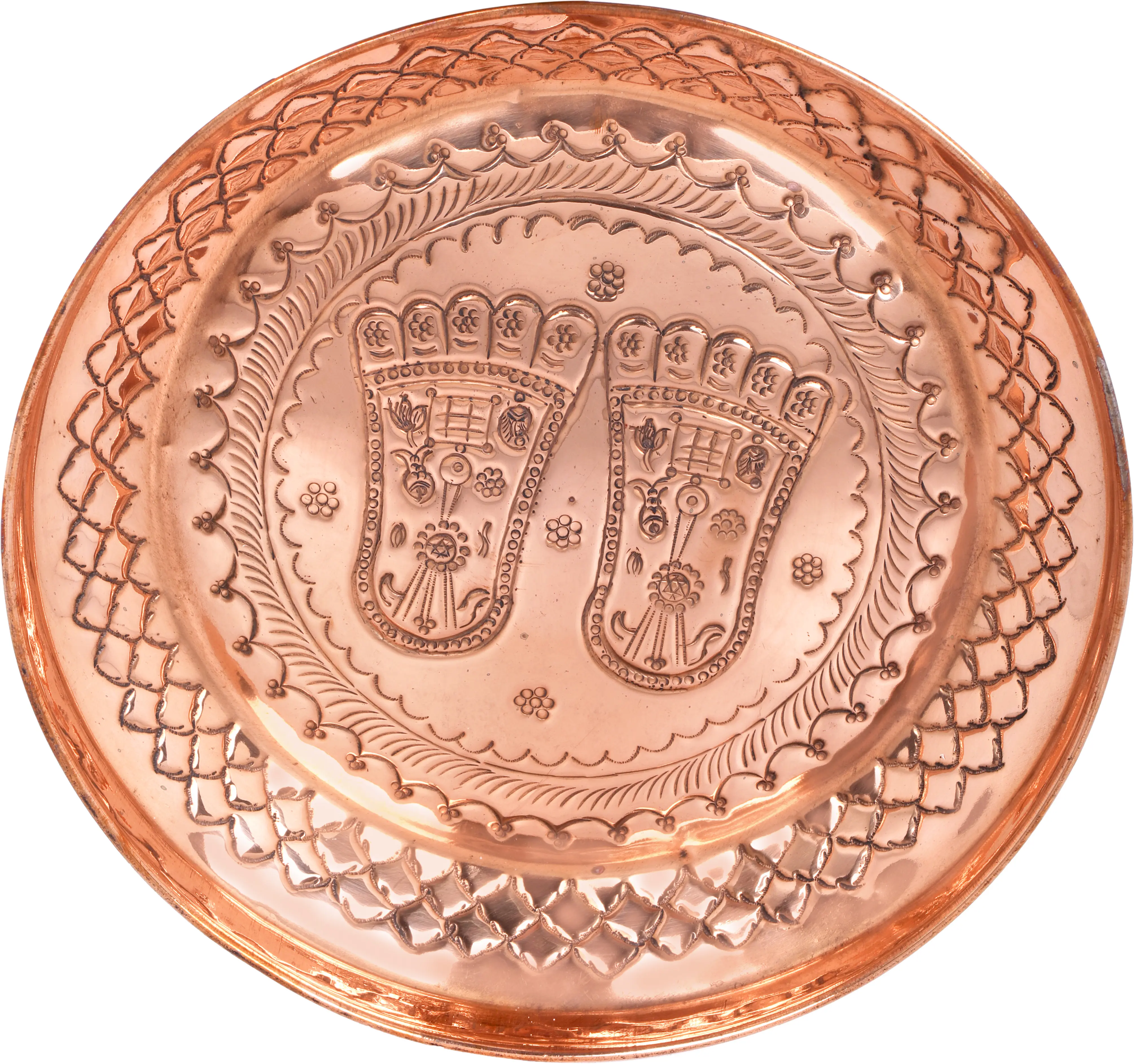 This exquisite copper thali, adorned with the sacred Vishnu Padam, is a beautiful and meaningful addition to any spiritual practice. Crafted from pure copper, renowned for its auspicious properties and its role in Hindu rituals, this thali serves as a conduit for divine energy and a symbol of devotion. The warm, radiant glow of the copper enhances its spiritual significance, creating an atmosphere of peace and reverence. The centerpiece of this thali is the intricately embossed Vishnu Padam, representing the divine footprints of Lord Vishnu. In Hindu tradition, the Padam symbolizes the omnipresence and benevolent grace of the deity. It is believed that the very presence of the Vishnu Padam invokes blessings, protection, and prosperity. Lord Vishnu, as the preserver of the universe, is revered for his role in maintaining cosmic order and for his numerous avatars that have graced the Earth to restore Dharma. The act of worshipping or acknowledging the Vishnu Padam is a way to connect with this divine energy and seek his guidance and blessings. The thali itself is designed with a traditional aesthetic, featuring a scalloped outer border and a delicate pattern of scales and floral motifs encircling the central depiction. These ornamental elements add to the visual appeal, making it not just a religious artifact but also a piece of art. The craftsmanship highlights the skill and dedication involved in its creation, ensuring that each detail contributes to the overall spiritual and aesthetic harmony of the piece. The robust copper construction promises durability and longevity, allowing this thali to be a cherished part of your spiritual journey for years to come. ––––––––––