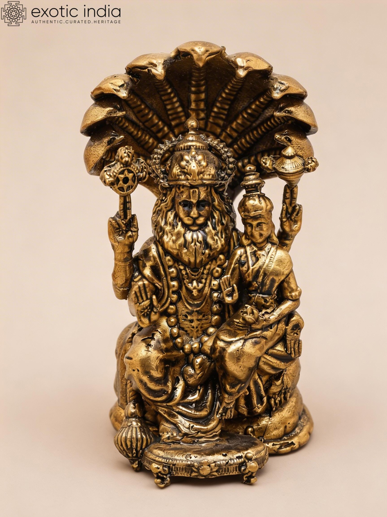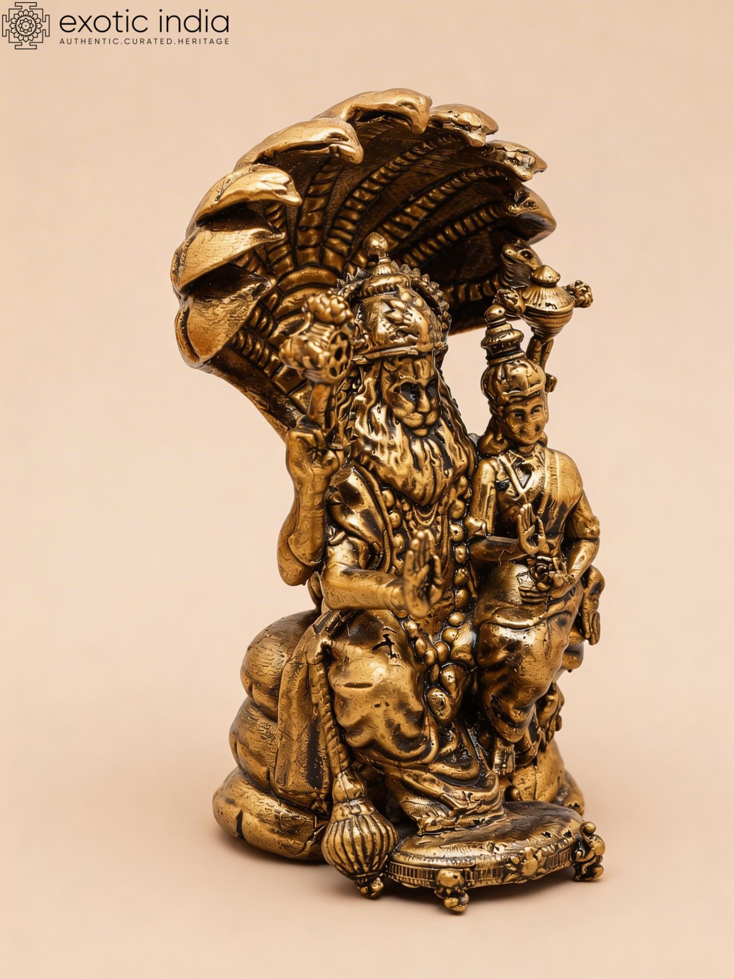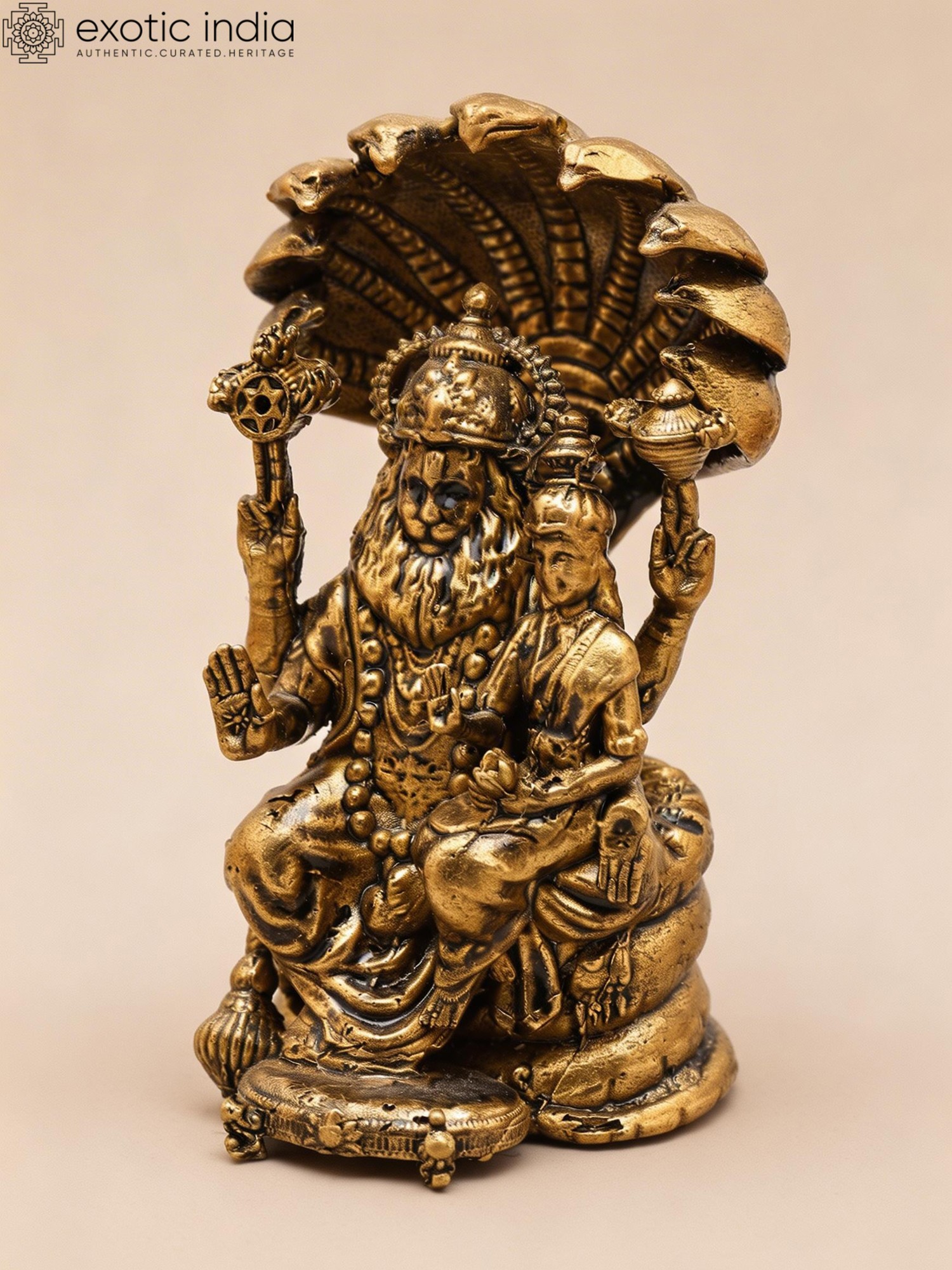 2" Lord Narasimha with Goddess Lakshmi Seated on Sheshnag Throne | Copper Statue | Made in India