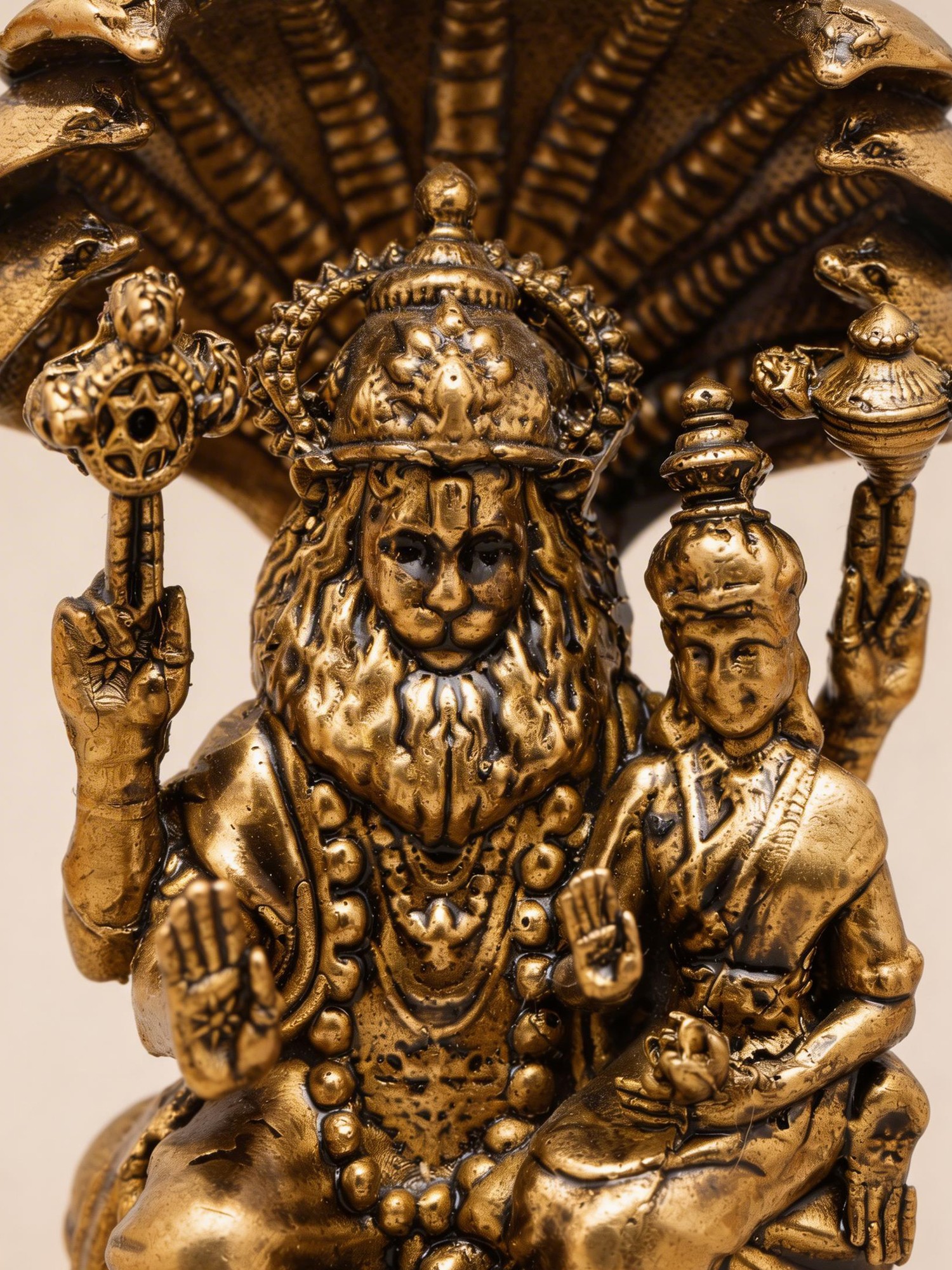 Depicts Narasimha, the half-man, half-lion avatar of Vishnu, seated serenely on the multi-headed serpent Sheshnag.