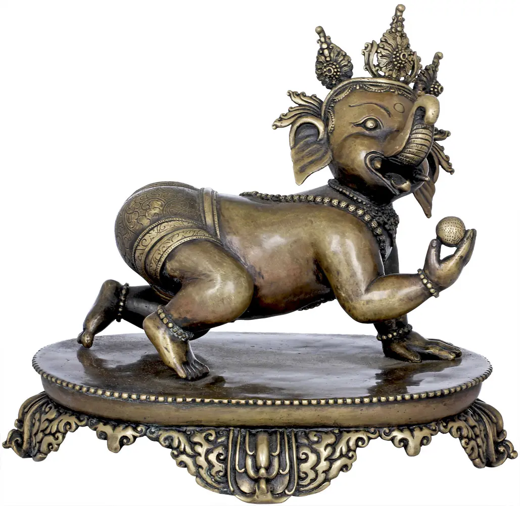Invoking the benevolent presence of Lord Ganesha, this exquisite copper statue captures the deity in his charming infant form, poised as if on the cusp of his first steps. In Hindu tradition, Ganesha, the elephant-headed god, is revered as the remover of obstacles, the patron of arts and sciences, and the intellect personified. His image is invoked at the commencement of any significant undertaking, ensuring smooth passage and success. This particular depiction, with the baby Ganesha in a crawling posture, embodies the purity and potential of new beginnings, symbolizing the early stages of growth and the boundless promise of the future.