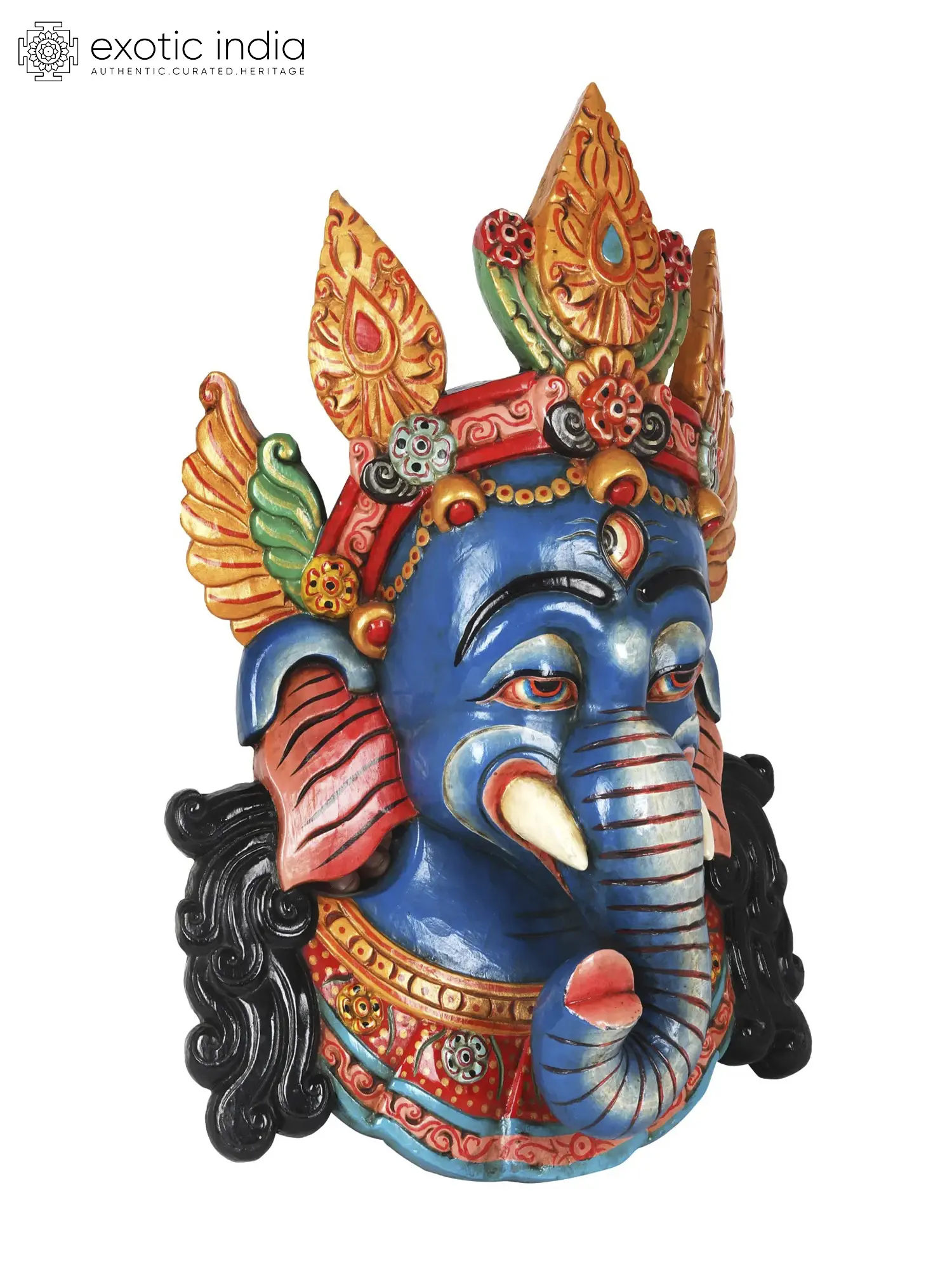 With magnetic and meditative eyes, Ganesha has three eyes and Tripunda, symbolizing his supreme wisdom. He wears a traditional Nepalese crown and ornaments and has long black tresses charmingly delineated in the artwork. A union of Hindu and Buddhist philosophies and iconography, this Ganesha mask is a heavenly piece of art from Nepal.