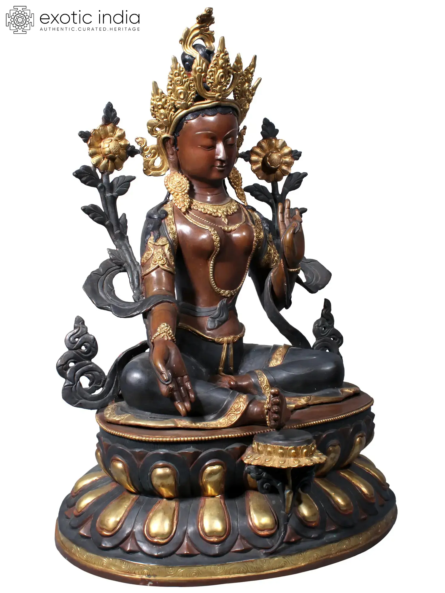 Endowed with a breathing, earthy physique, and adorned with mystical black garments beautified by glowing golden, the great Bodhisattva Green Tara appears to his devotees like a heavenly queen in this gilded copper Nepalese statue. With expressions and limbs as soft as the petals of the lotuses held in her hands, Green Tara is a picture of motherly affection in this statue. Framed by her crown and dark tresses, Tara’s face seems lively yet still. Exquisitely ornamented, Tara has her hand in the gesture of patience, telling her followers to hold patience in their hearts.