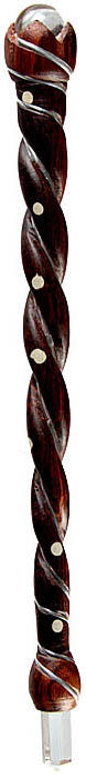 This beautifully crafted piece stands approximately 9.3 inches in length, making it easily wieldable and transportable for practitioners. It features a dark, lustrous wood, carved in an elegant, spiraling pattern. The wood has been smoothed and polished to a fine sheen, enhancing the natural grain and creating a tactilely pleasing surface. Interwoven with the wood is a delicate silver wire, adding both visual contrast and potentially enhancing the rod's conductivity. At the top of the staff is a sphere made of what looks like the same lustrous wood. The bottom is finished with a clear crystal for directing the energy.