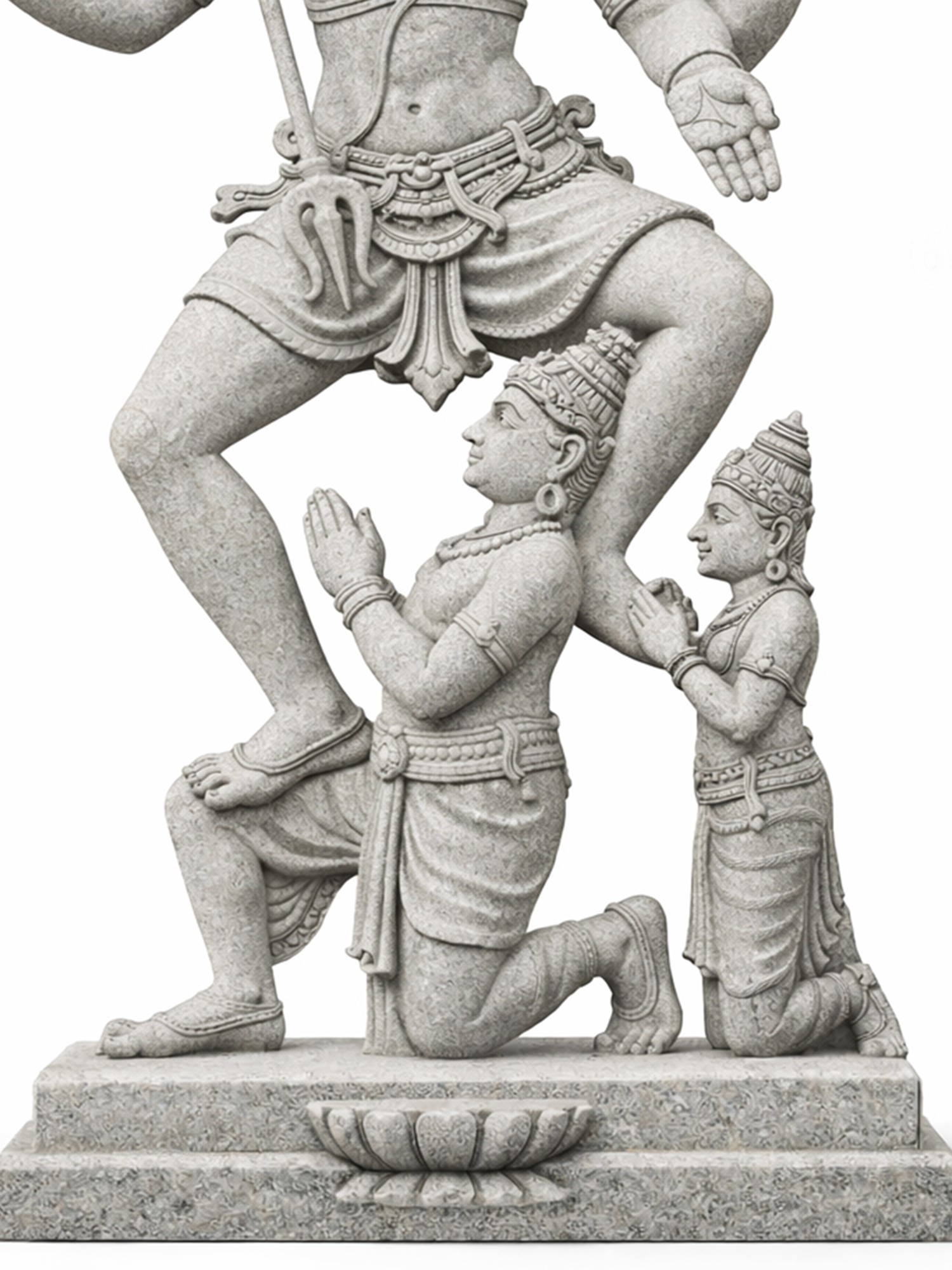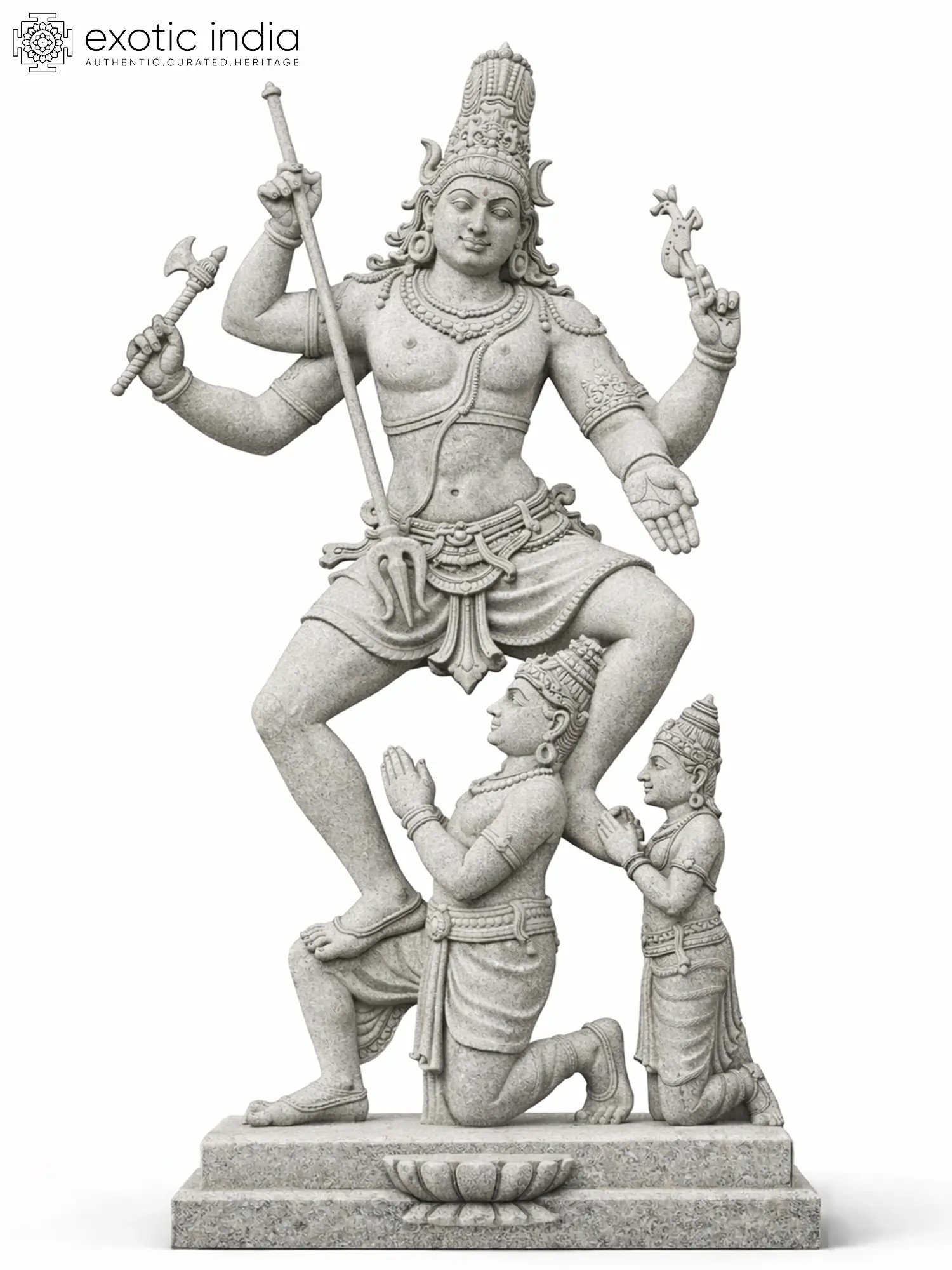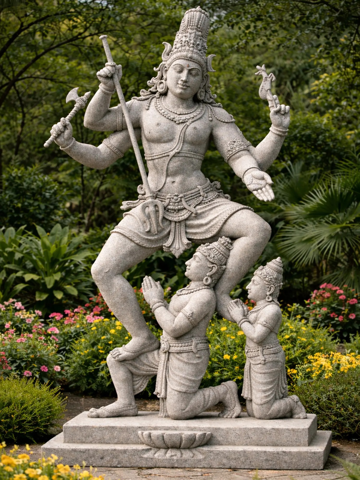 Standing at an impressive height, this monumental work draws the eye with its dynamic posture and commanding aura. Lord Shiva is depicted with multiple arms, each holding symbolic implements that represent his vast powers and roles in the cosmic order. The serene yet resolute expression on his face conveys immense wisdom and authority, while the surrounding figures, rendered with utmost devotion, add layers of narrative depth to the composition.