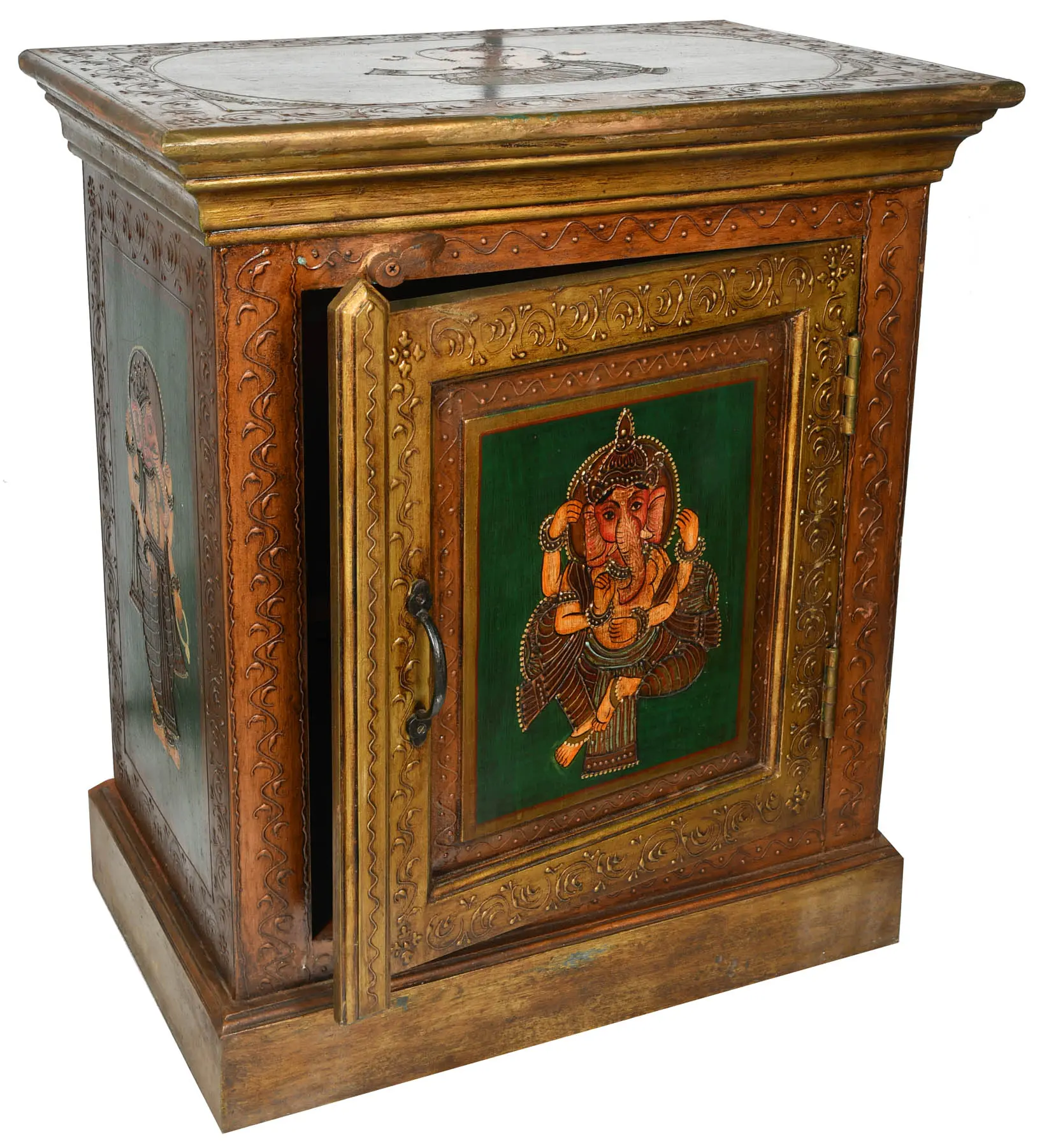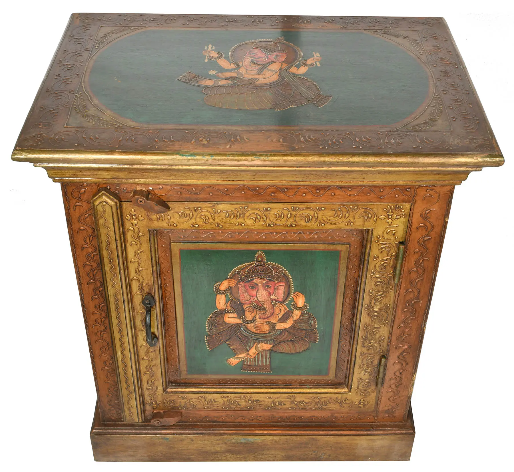 Embrace the auspicious presence of Lord Ganesha, the remover of obstacles and the bestower of wisdom and good fortune, with this exquisitely crafted chest. More than just a storage solution, this piece is a vibrant testament to Indian artistry and spiritual devotion, designed to bring blessings and beauty into your home. The central panel features a captivating depiction of Ganesha in his joyful dancing form, a motif often associated with his victory over obstacles and the celebration of life's moments. In Hindu mythology, Ganesha's dance is said to have reverberated with cosmic energy, filling the universe with rhythm and auspiciousness. This depiction captures that divine energy, making the chest a focal point of positive vibes.