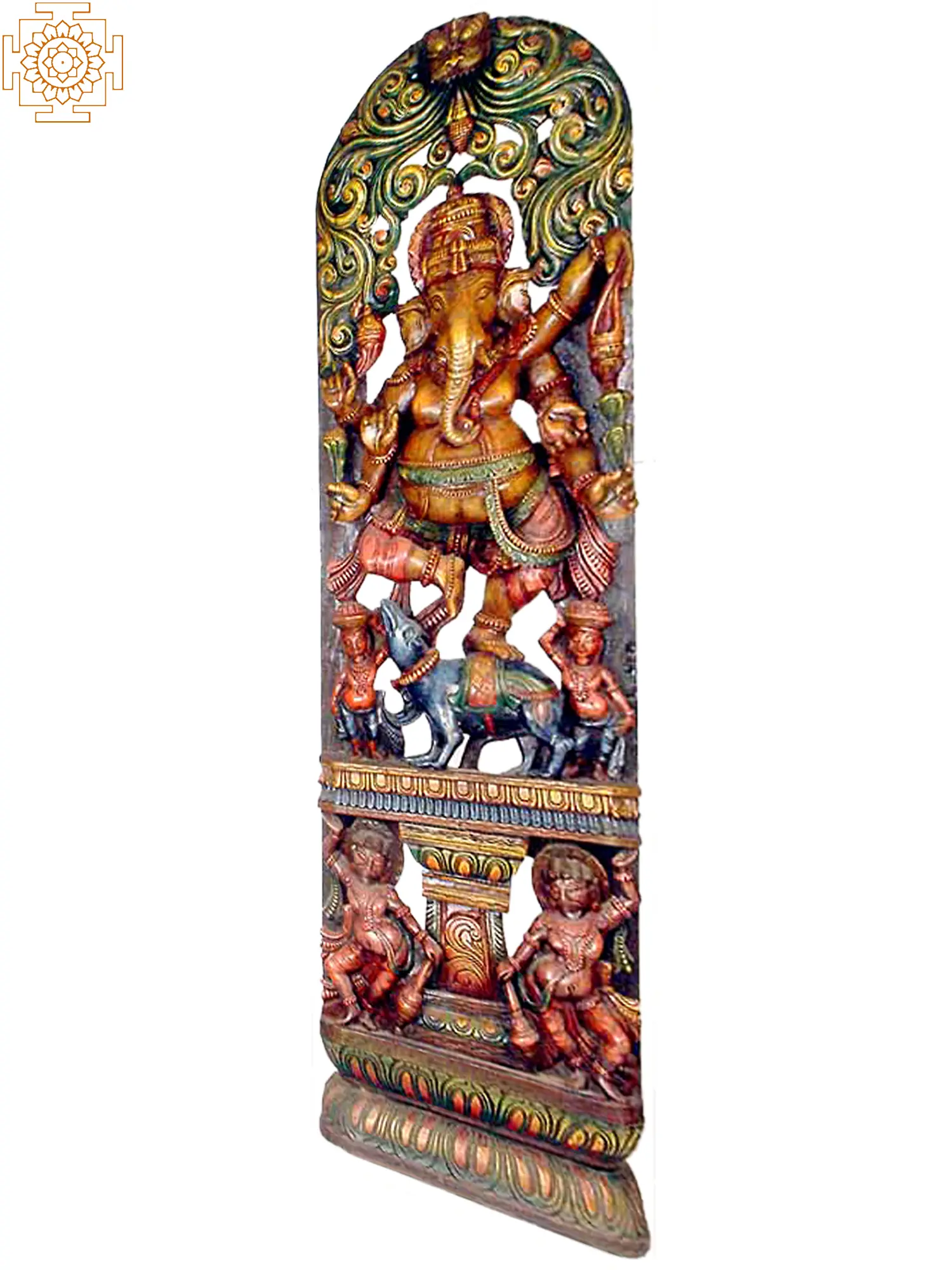 This impressive panel, measuring 5.1 x 1.5 x 0.5 feet, exemplifies the traditional techniques of South Indian temple wood carving. Every curve and contour has been meticulously shaped by skilled artisans, drawing upon centuries of inherited knowledge. This art form, deeply intertwined with temple architecture, employs complex patterns and iconography, transforming wood into a medium of profound spiritual expression. Look closely, and you'll discern the subtle details that distinguish this piece. Intricate carvings depict attendants offering their services to Ganesha. The border is intricately carved to give the piece depth and complexity. The entire carving is a testament to the sculptor's patience, skill, and devotion. This carving offers a unique opportunity to own a piece of authentic South Indian cultural heritage, a statement piece that will inspire conversation and admiration for years to come. By adorning your space with this piece, you welcome the spirit of auspiciousness, wisdom, and joyful energy that Ganesha embodies.