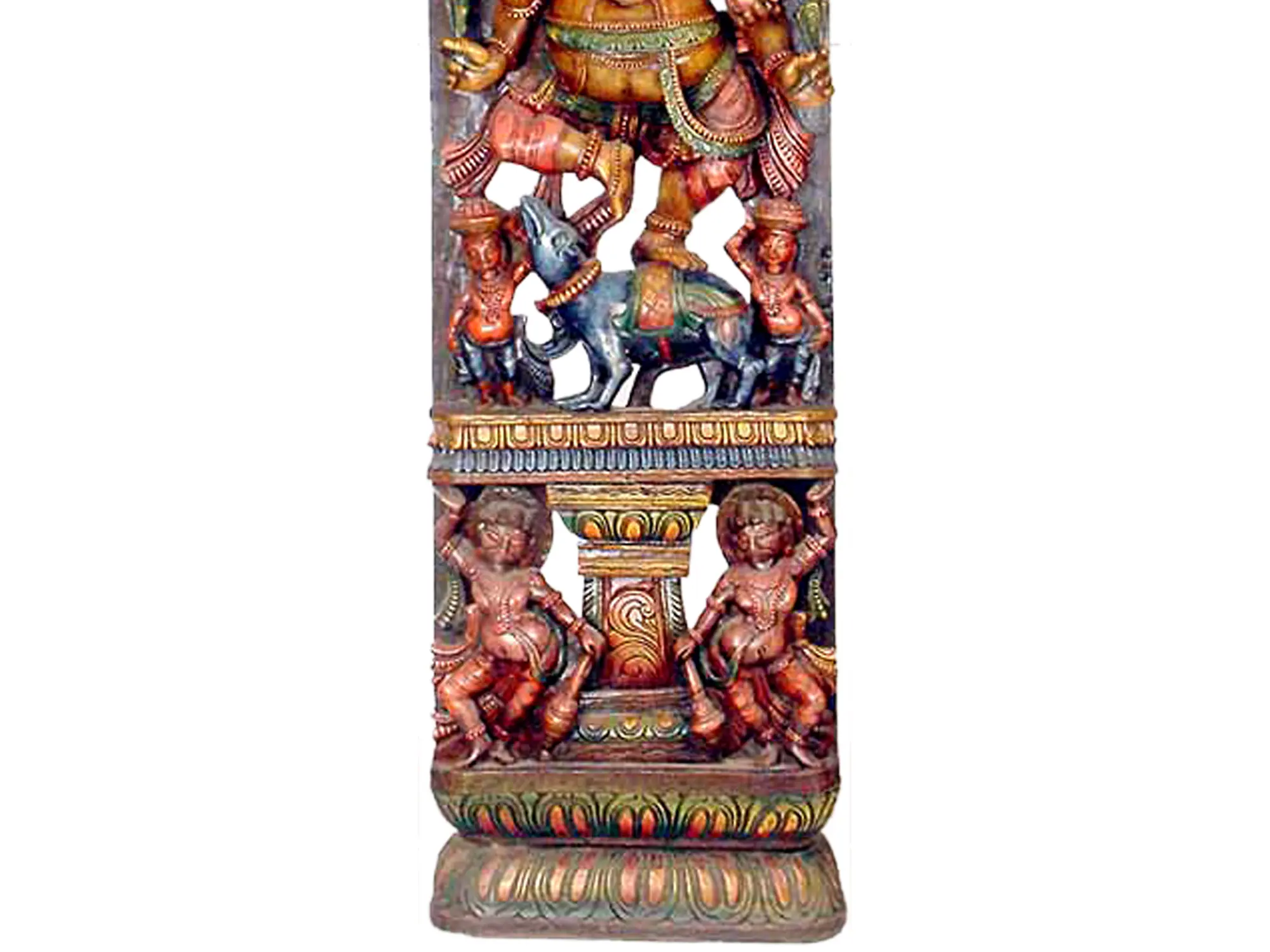 Behold a magnificent testament to South Indian artistry – a hand-carved wooden panel depicting a vibrant and dynamic scene of Hindu divinity. Crafted with meticulous detail, this piece is a window into the rich tapestry of Hindu mythology and the enduring legacy of temple art. The intricate carvings, rendered in rich, earthy tones, tell a story that resonates across generations. This piece is more than a mere decoration; it is a tangible connection to a world of gods, goddesses, and profound spiritual wisdom.