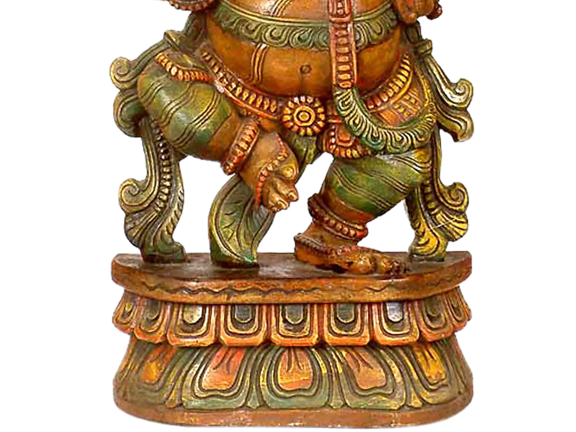 South India boasts a rich tradition of temple wood carving, a craft passed down through generations of artisans. These carvings, often adorning temple doors, chariots, and deities, are characterized by their intricate detail, vibrant colors, and deep spiritual symbolism. The wood used for these carvings is carefully selected and seasoned to ensure longevity and beauty. The artisan's skill and dedication bring the divine to life, creating works of art that inspire awe and reverence. This particular sculpture, measuring 23.6 inches in height, 12.0 inches in width, and 5.0 inches in depth, is a testament to this enduring tradition. The artist has skillfully captured Ganesha in a dynamic dancing posture, a form known as Nritya Ganapati, which represents the joy, rhythm, and harmony of the universe. It stands as a testament to skill and tradition. It is an exquisite addition to any sacred space.