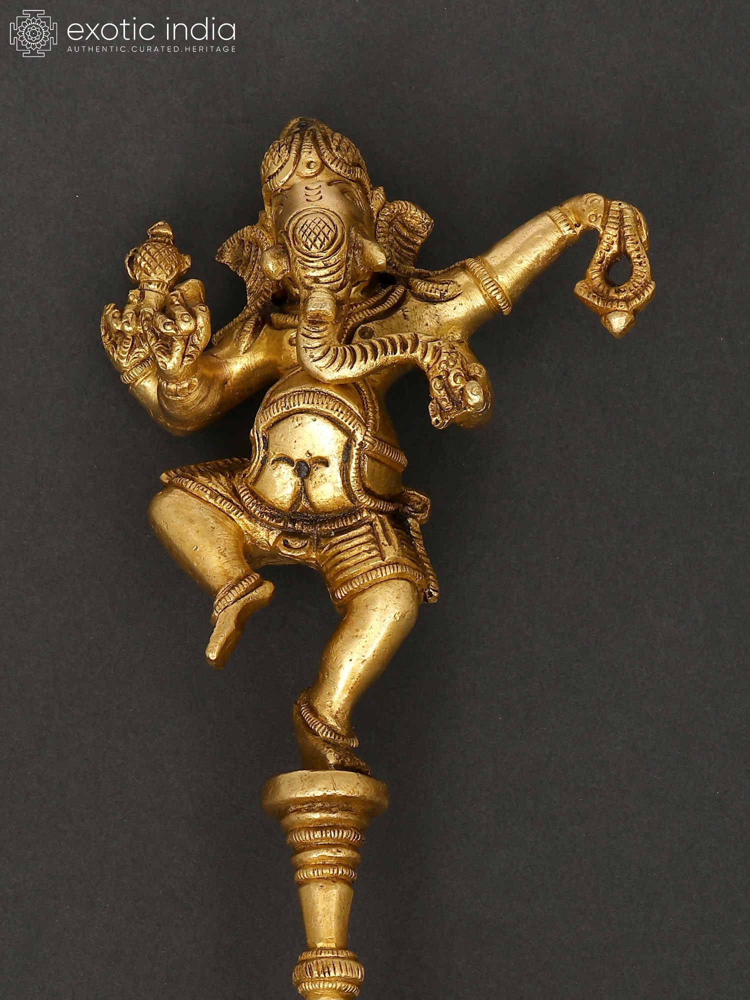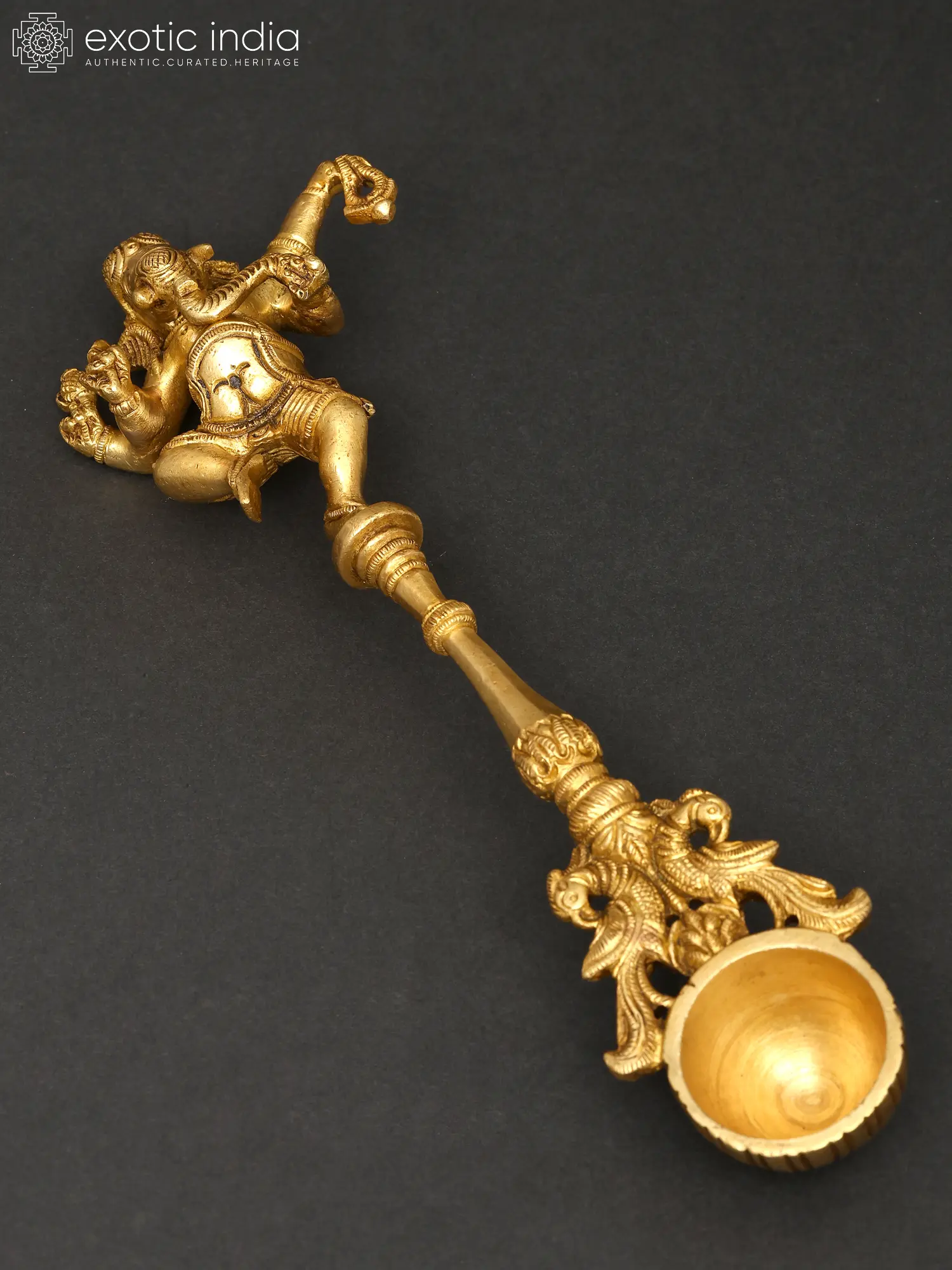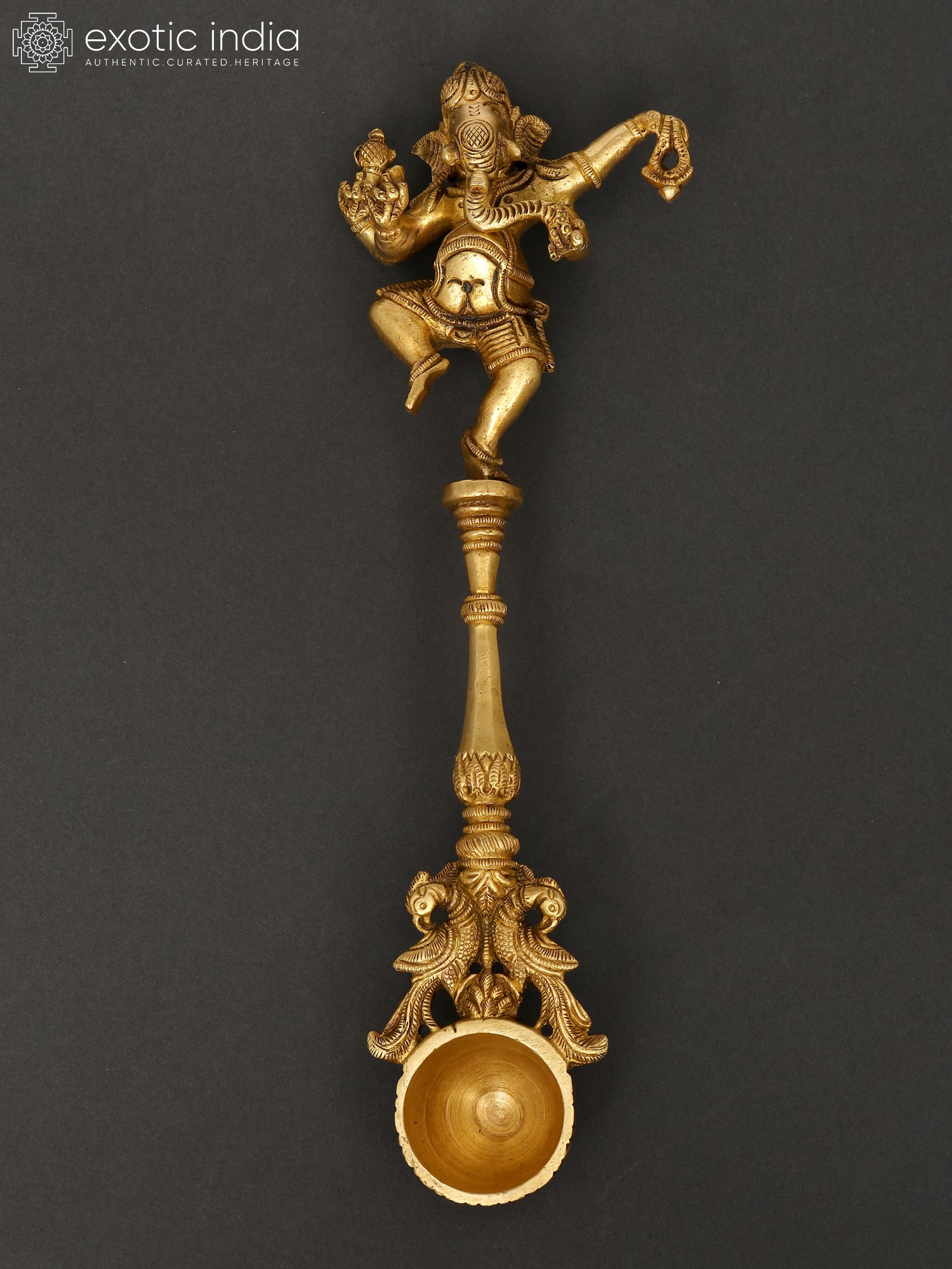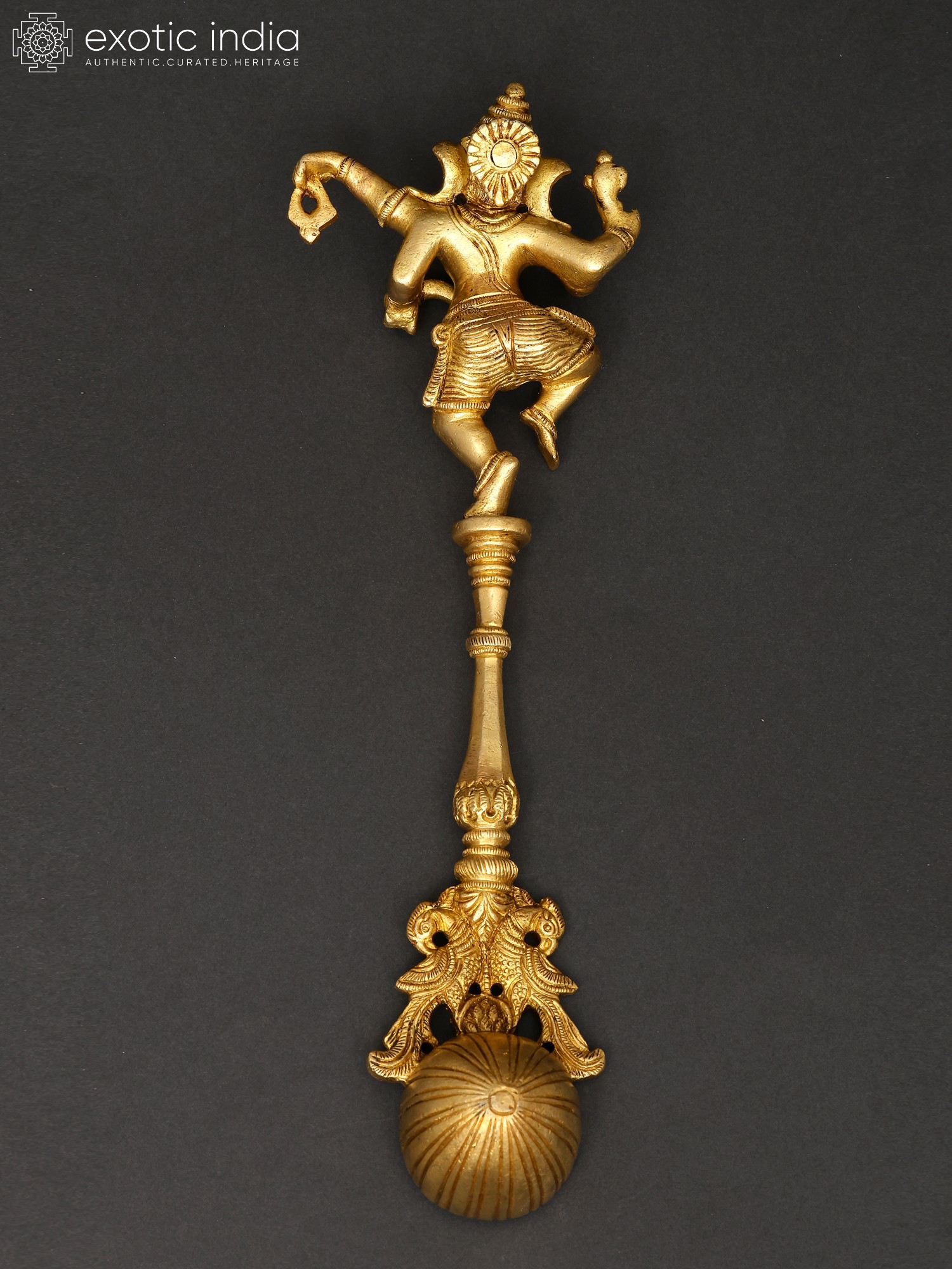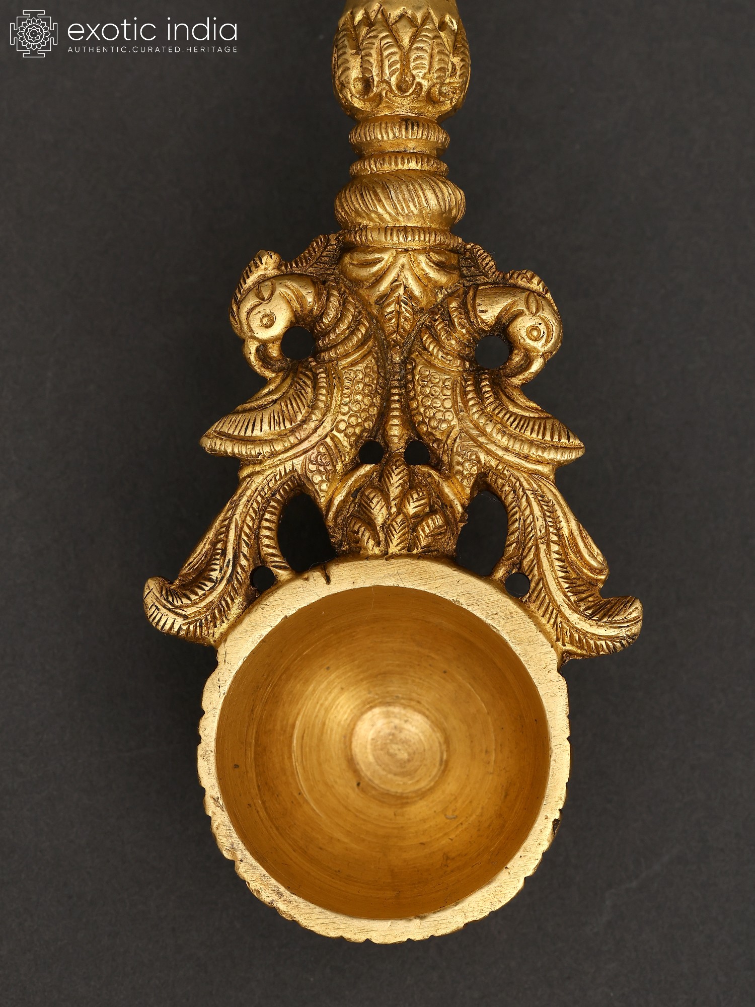 The Pali or Panchamrita spoon is another name for this bronze ceremonial spoon. It is commonly encountered in conjunction with the Panchapatra (container for Panchamrita). This spoon is crafted of high-quality brass, and the handle has a religious design of Dancing Ganesha. This spoon can also be used in Homa’s to offer ghee. Another appealing aspect of the spoon is the pair of peacocks affixed to it. This spoon has been used in ceremonies and as a vehicle for making offerings.