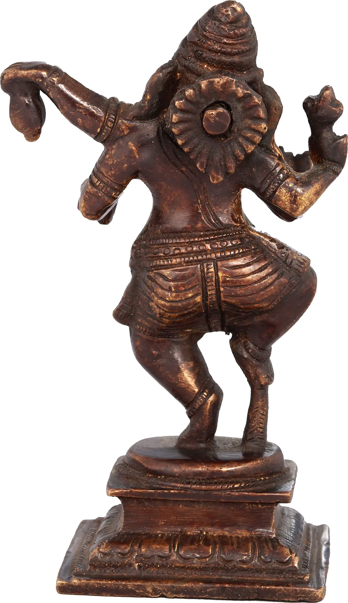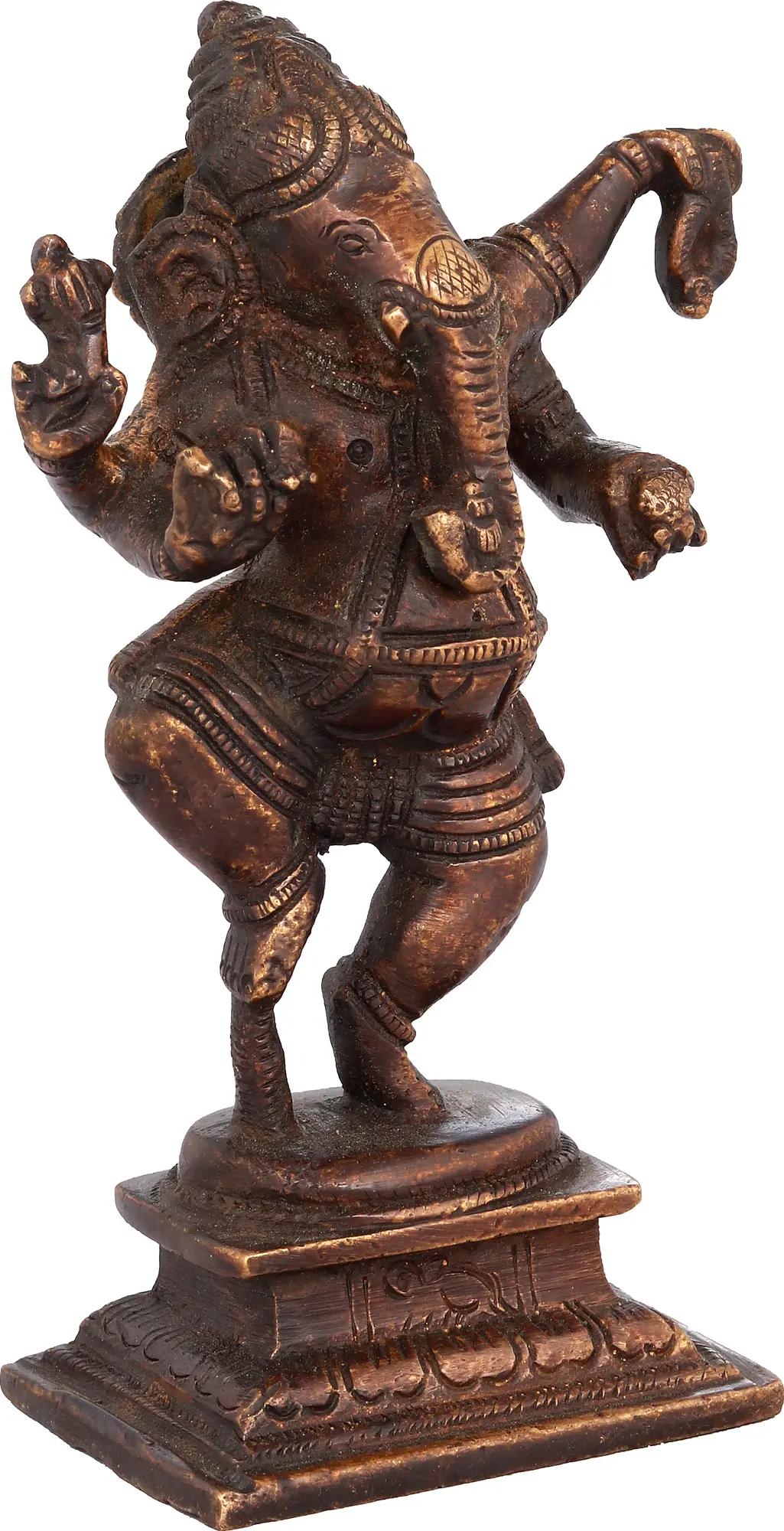 Behold this exquisite brass sculpture, capturing the effervescent energy of Lord Ganesha in a jubilant dance. Known as Vigneshwara, the remover of obstacles, and Ganapati, the leader of the ganas (celestial attendants), Ganesha is one of the most beloved deities in the Hindu pantheon. This particular depiction showcases his playful and dynamic aspect, often referred to as Nritya Ganapati, the dancing Ganesha. The intricate craftsmanship of this small statue brings to life the very essence of divine joy and auspicious beginnings.