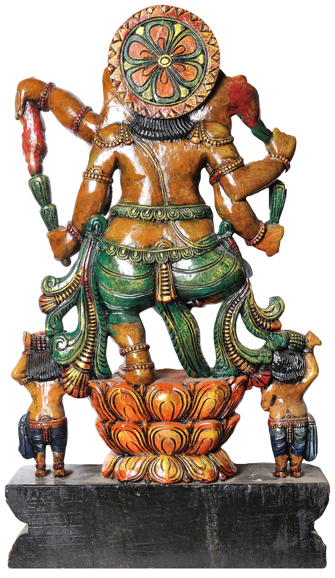 Behold a magnificent representation of Lord Ganesha, the beloved elephant-headed deity, in a vibrant and dynamic dance. This exquisite South Indian temple wood carving captures the joyous exuberance of Ganesha as he performs his celestial dance, symbolizing the rhythm of the universe and the removal of obstacles. His numerous arms are outstretched, each holding a symbolic item, a testament to his multifaceted powers and divine attributes. The intricate details of the carving, from the delicate ornamentation adorning his trunk and ears to the muscular definition of his form, showcase the masterful artistry of traditional Indian wood carving. ––––––––––––––––––