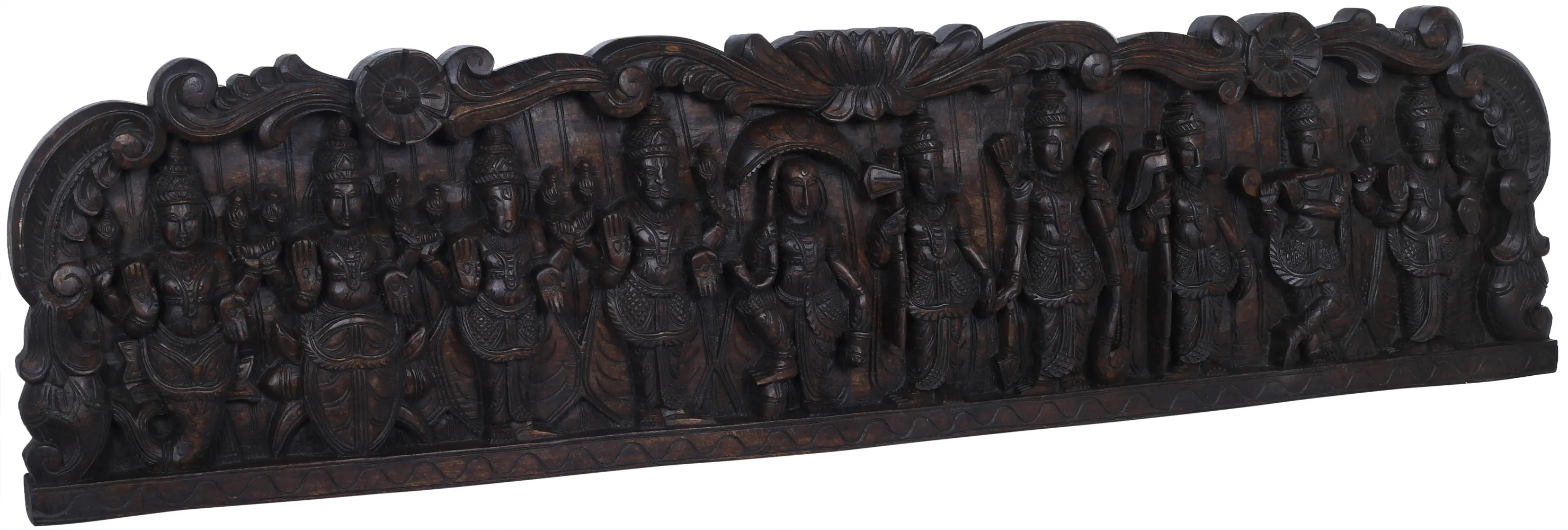 This panel is a masterful display of traditional South Indian temple wood carving. The dark, rich wood has been expertly shaped and detailed, bringing each avatar to life with distinct features and symbolic attributes. The flowing lines, intricate patterns on the garments, and the serene yet powerful expressions of the deities speak volumes about the skill and devotion of the artisan. The artistic flourishes and the overall composition create a sense of grandeur and spiritual depth, making this piece a focal point for any sacred space or art collection. It is a tangible connection to ancient lore and a celebration of the enduring power of faith.