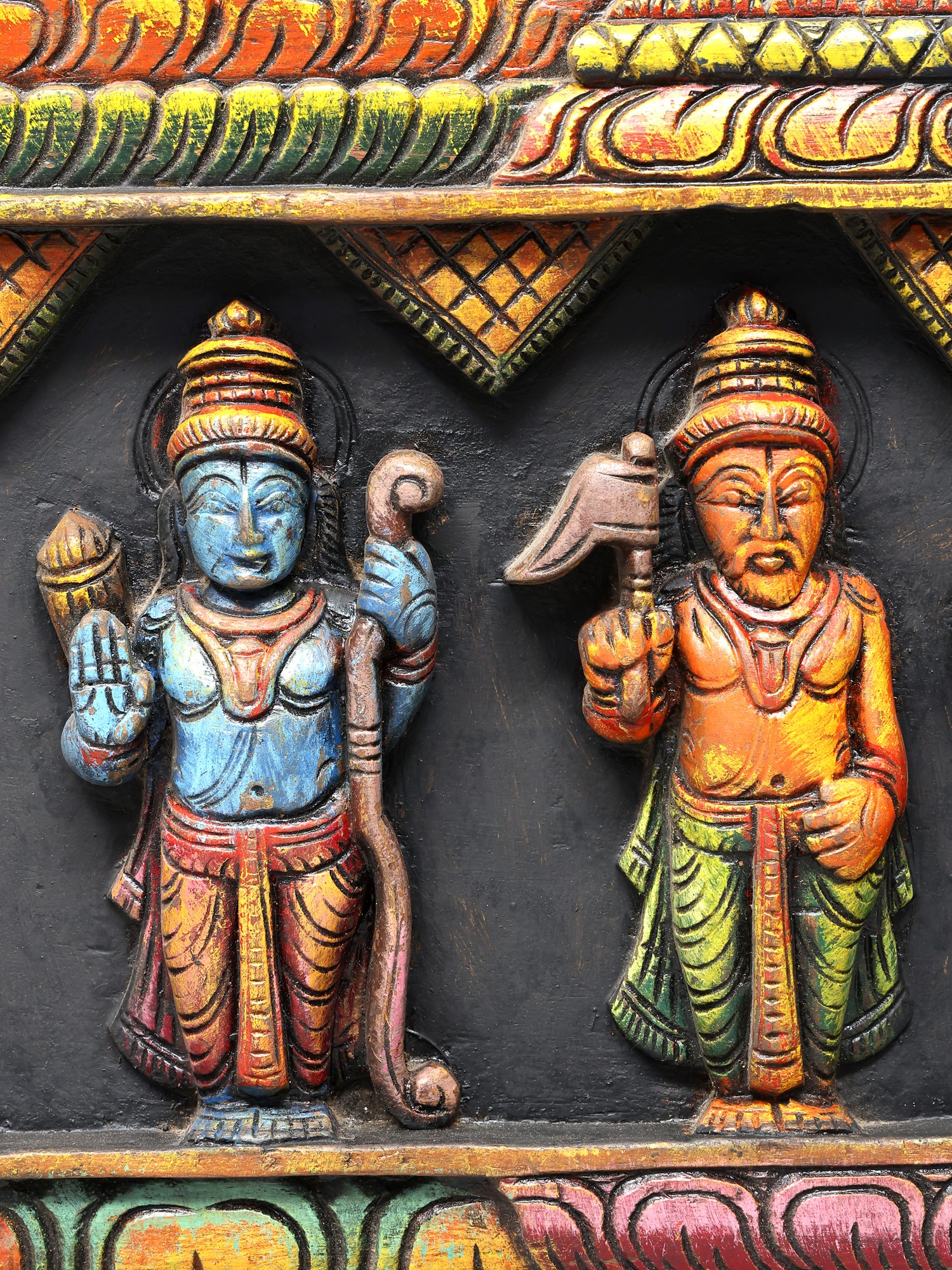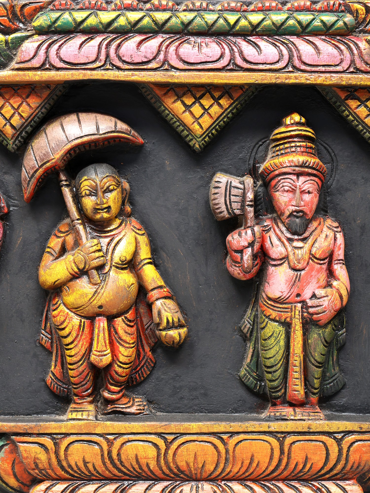 This striking work originates from a rich tradition of South Indian temple art. Wood carving has been an integral part of temple architecture and devotional practices for centuries in this region. Artisans, often belonging to families with generations of experience, imbue their creations with spiritual significance and technical mastery. The use of wood, carefully selected and skillfully shaped, creates a warm, natural aesthetic that resonates with the earth. The intricate details, the smooth finish, and the vibrant colors all reflect the dedication and artistic expertise invested in its creation. This piece carries within it the echoes of ancient temples, the scent of incense, and the spirit of devotion.
