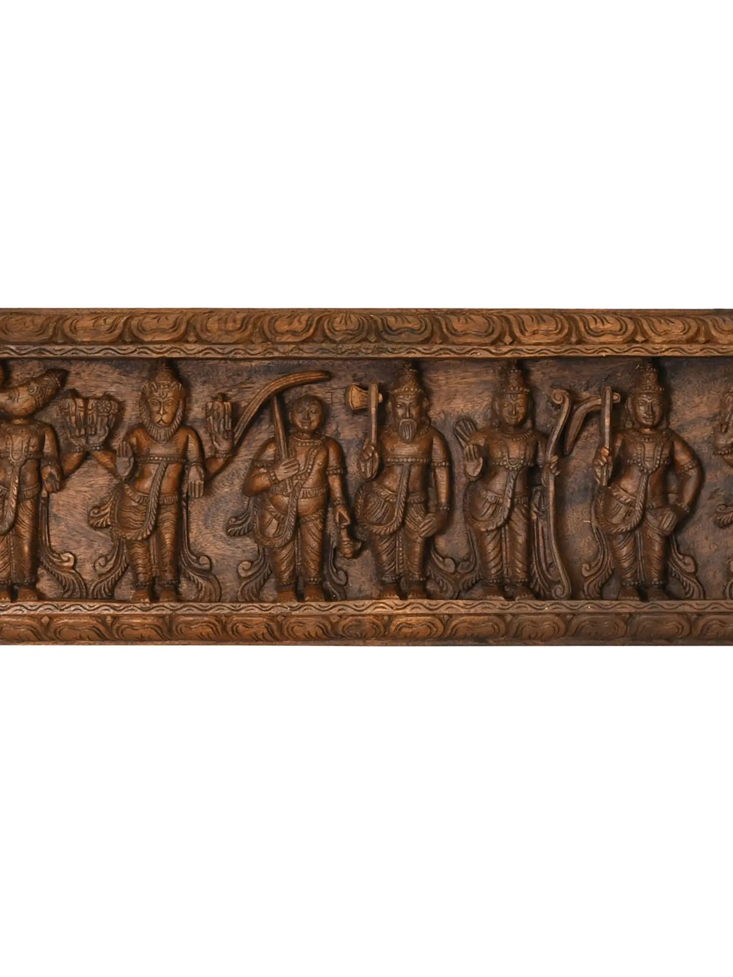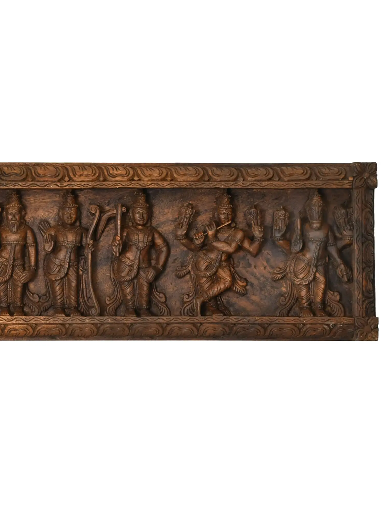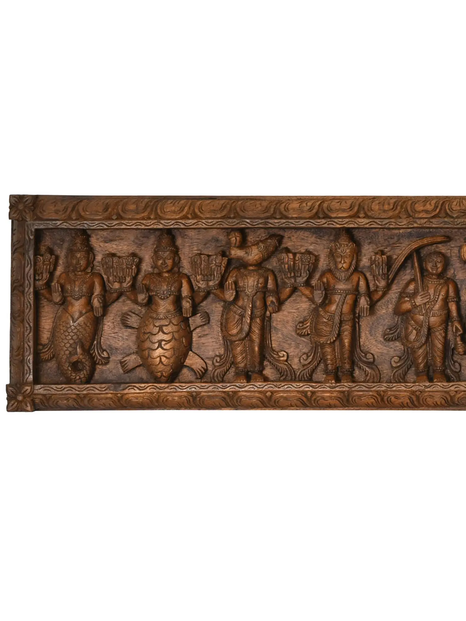 Crafted with exceptional skill and deep reverence, this panel showcases the artistry characteristic of South Indian temple wood carving. The intricate details of each divine form, the subtle expressions, and the flowing drapery speak to generations of tradition and spiritual devotion passed down from master to apprentice. The warm, natural tones of the wood bring a palpable sense of life and sacredness to the carving, making it a focal point of spiritual and aesthetic appeal for any space. This piece is a direct link to the sacred art of India, bringing the power and grace of the Dashavatara into your home.