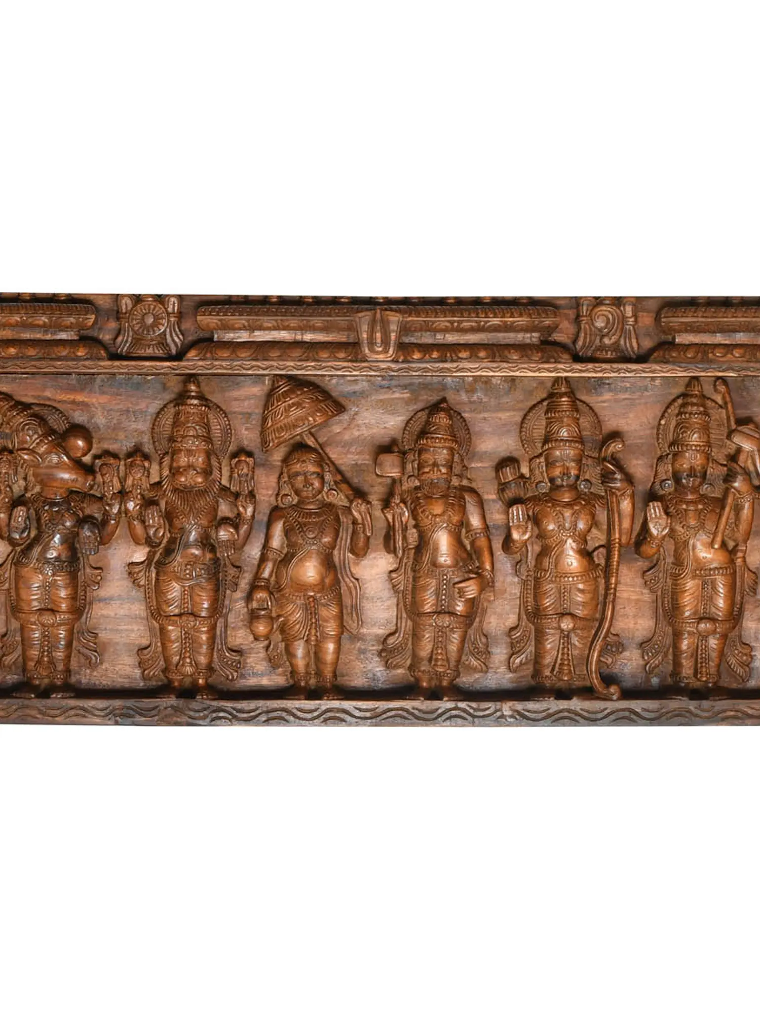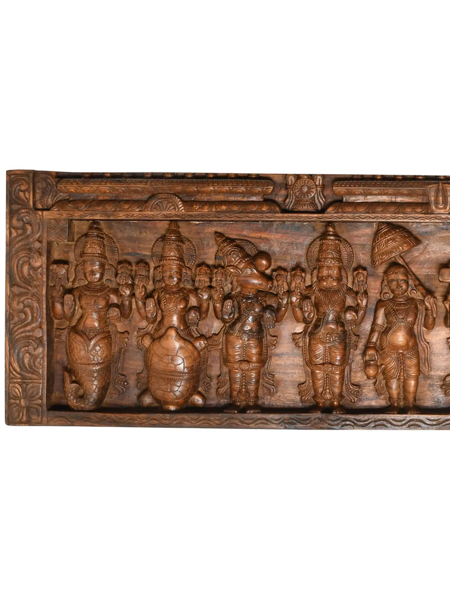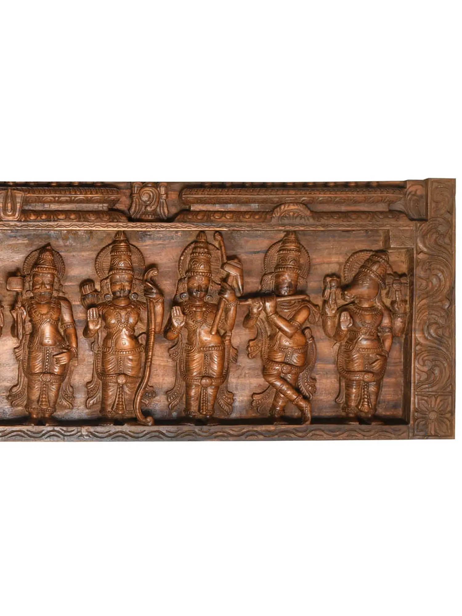 Crafted with the traditional techniques of South Indian temple wood carving, this panel is a testament to the skill and devotion of its creators. The rich grain of the wood lends a timeless quality to the artwork, while the intricate carvings bring each avatar to life with dynamic poses and expressive features. The artistic style is characteristic of the sacred spaces from which such craftsmanship originates, designed to inspire awe and devotion. Owning this panel is not merely acquiring a decorative piece, but embracing a piece of living heritage, a tangible connection to ancient stories and divine wisdom. The sheer scale and detail suggest it was designed to adorn a significant space, perhaps a temple hall or a grand dwelling, where it could serve as a constant reminder of the divine presence and its cyclical intervention in the world. The decorative border framing the avatars further enhances the sense of grandeur and ritualistic importance, drawing the viewer's eye to the sacred tableau within.