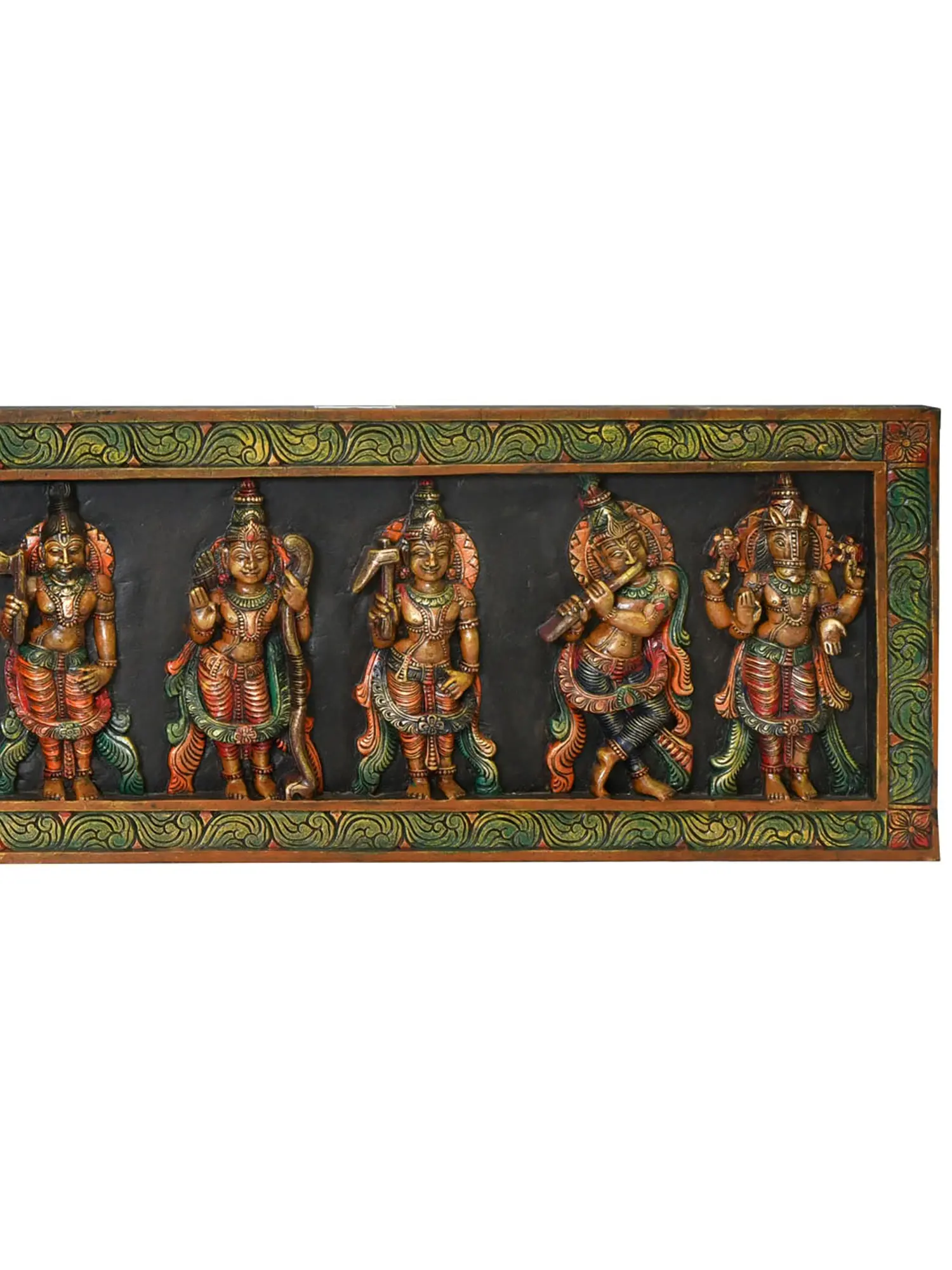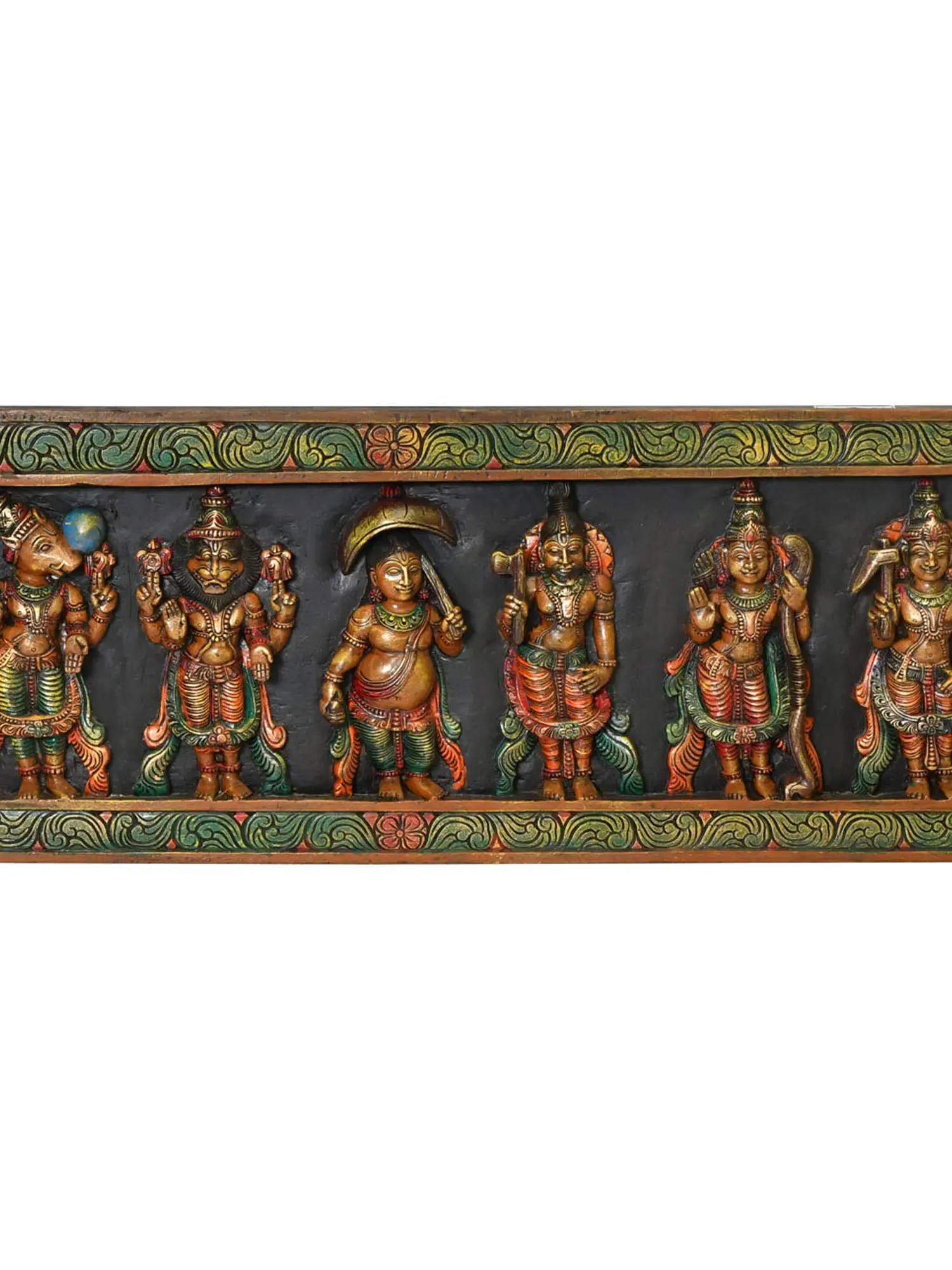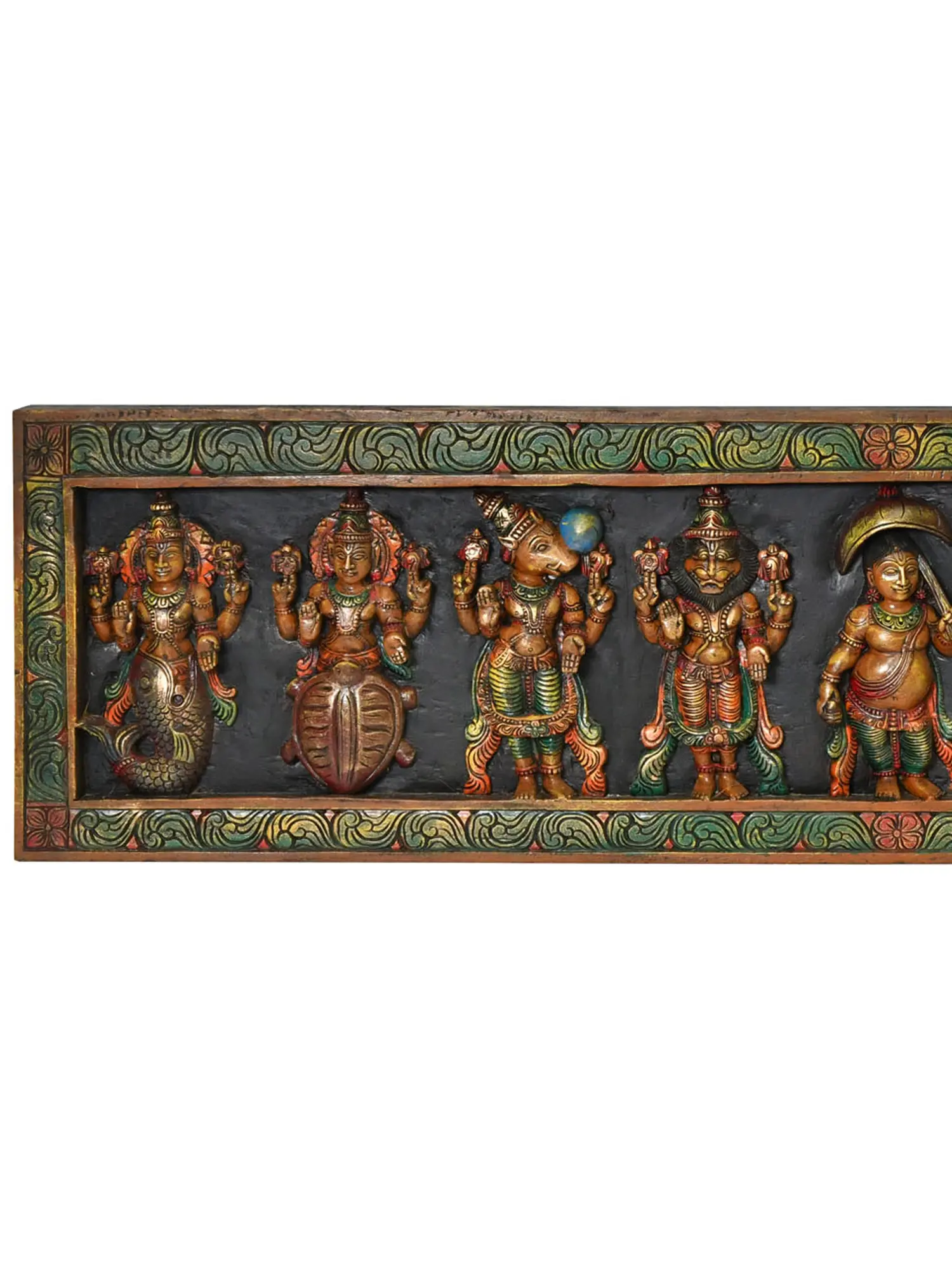 This exquisite panel is a magnificent testament to devotion and artistry, meticulously carved from South Indian temple wood. It portrays the Dashavatara, the ten principal avatars or incarnations of Lord Vishnu, the preserver and protector of the universe in Hindu cosmology. Each figure, rendered with remarkable detail and vibrant color, tells a story of divine intervention and cosmic balance. From the primordial waters to the future yet to unfold, this panel captures the essence of Vishnu's transformative power and his unwavering commitment to restoring dharma.