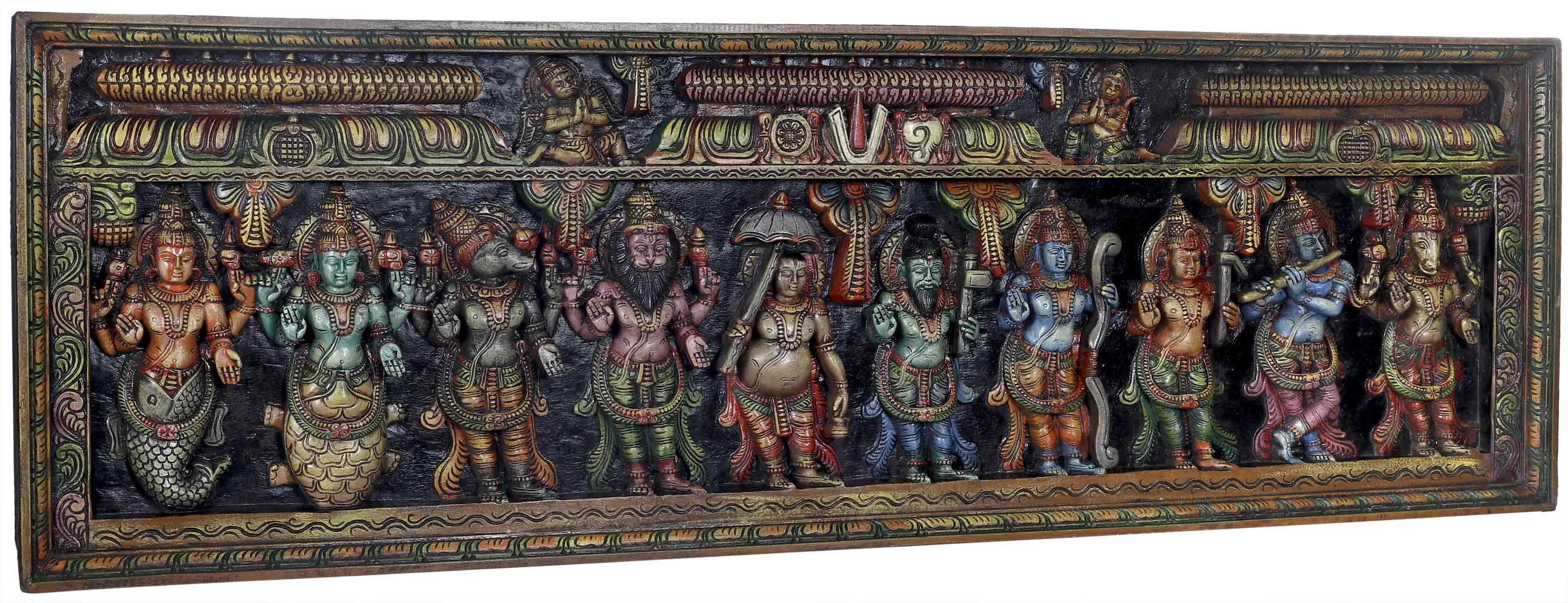 This magnificent wood carving brings to life the profound concept of the Dashavatara, the ten principal incarnations of Lord Vishnu, the preserver and protector of the universe in Hindu mythology. Each figure, meticulously carved and vibrantly painted, represents a pivotal moment in the divine cycle of creation, preservation, and destruction, essential for the cosmic balance. This piece is more than just a decorative item; it's a visual narrative steeped in ancient lore and artistic tradition. Originating from the skilled hands of South Indian temple carvers, this artwork embodies a rich heritage of spiritual expression. The intricate details and the rich, jewel-toned colors evoke the grandeur and divine presence associated with temple deities. The carving technique, honed over generations, allows the figures to leap from the wood, each with its distinct posture, expression, and symbolic attribute. ––––––––––