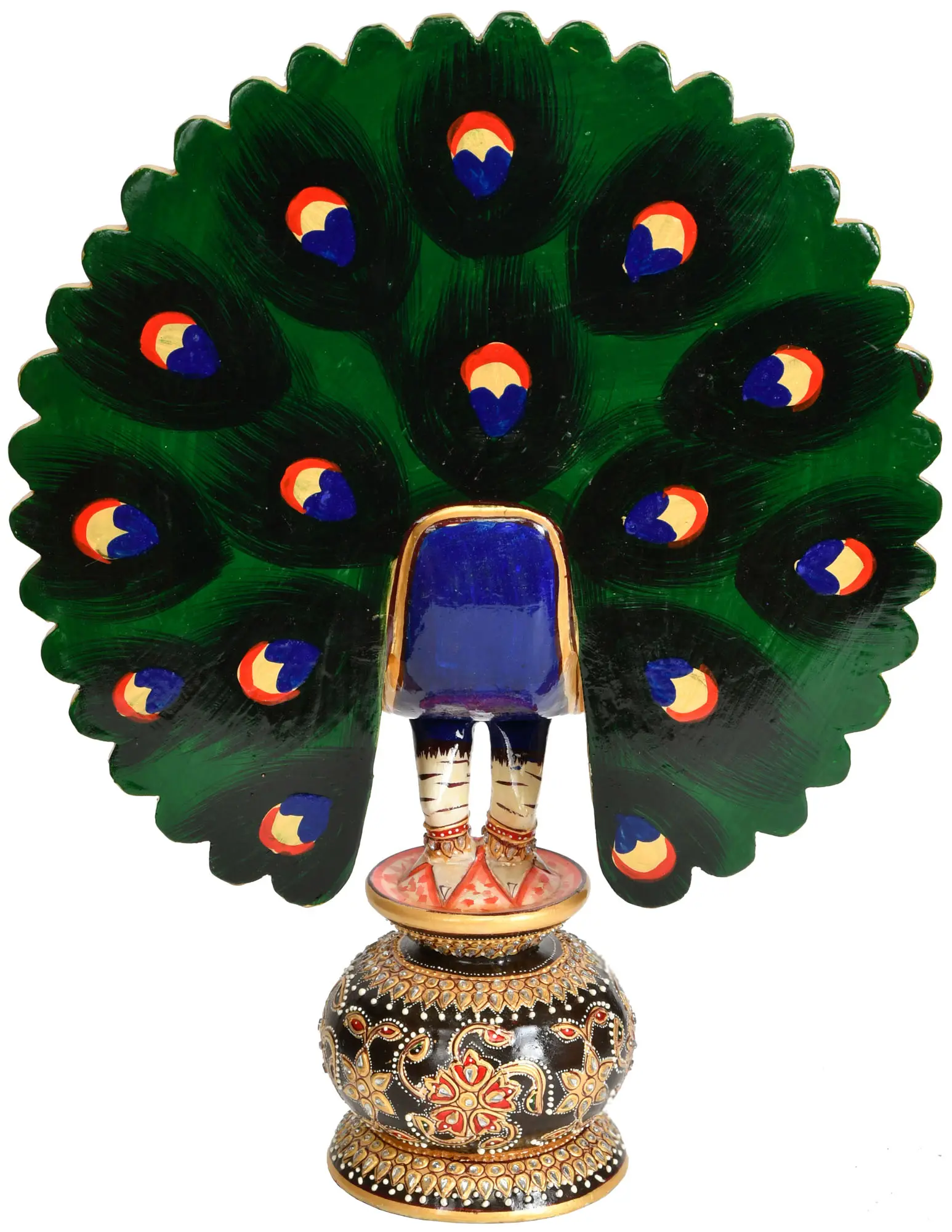 The body of the peacock is equally captivating. Delicate patterns in red, blue, and gold adorn its chest and neck, creating a sense of opulent attire. The legs, with their distinctive striped pattern, are grounded on a beautifully shaped pedestal. This base itself is a work of art, painted in a deep, lustrous black and embellished with a symphony of floral motifs and geometric designs in vibrant colors and gilded accents. The entire piece radiates a sense of celebration and divine presence, making it a truly remarkable addition to any space. Whether displayed as a spiritual artifact or a statement piece of decor, this dancing peacock is sure to draw admiration and evoke a sense of wonder.