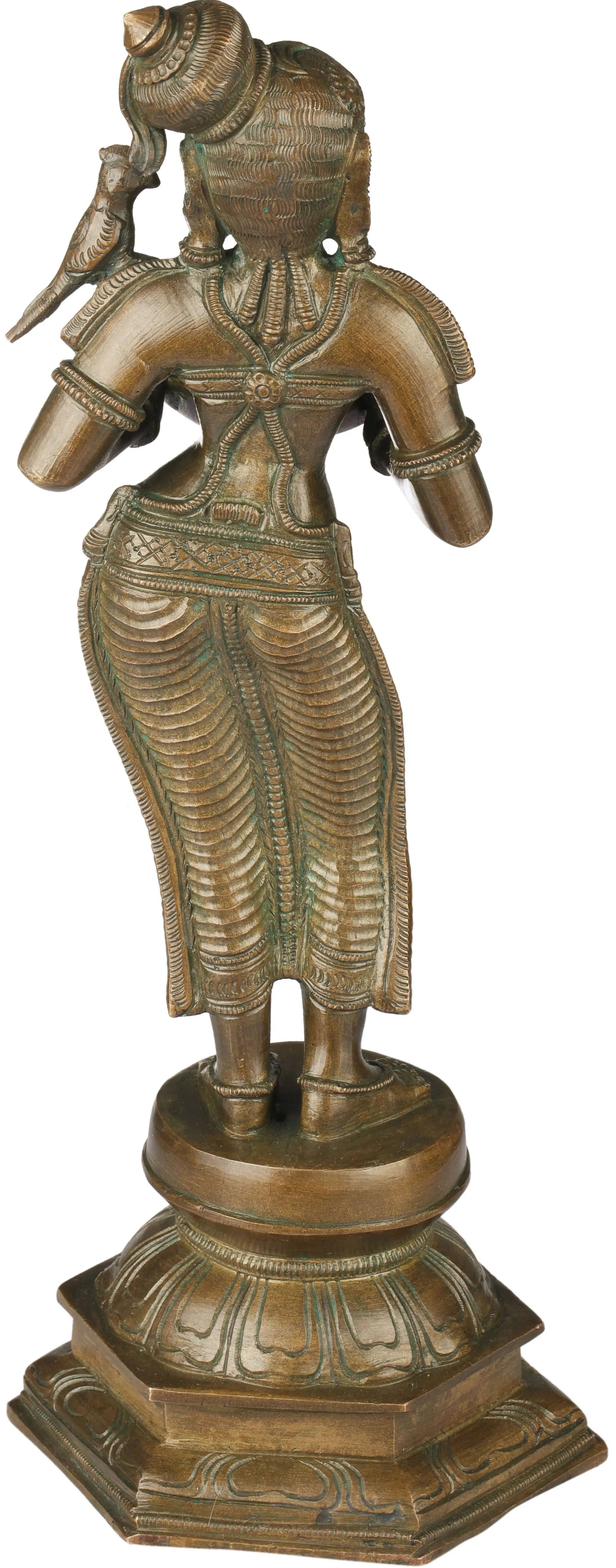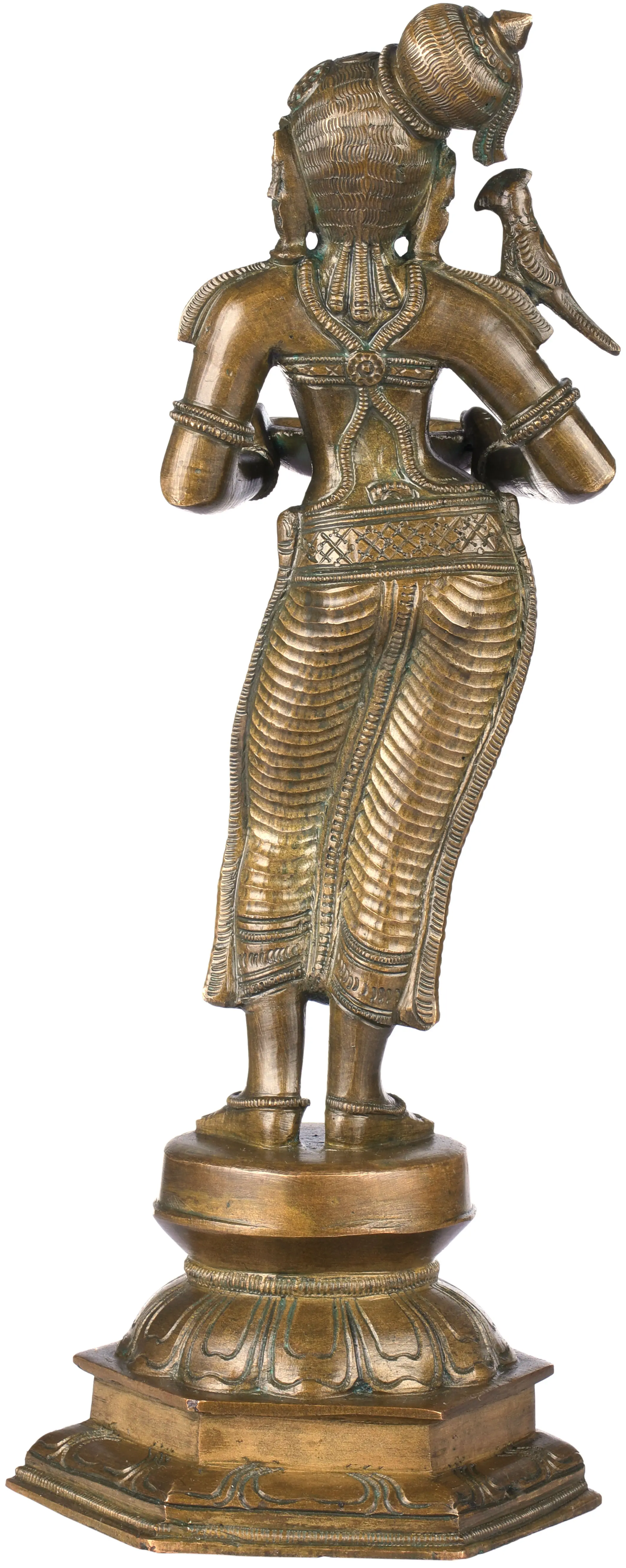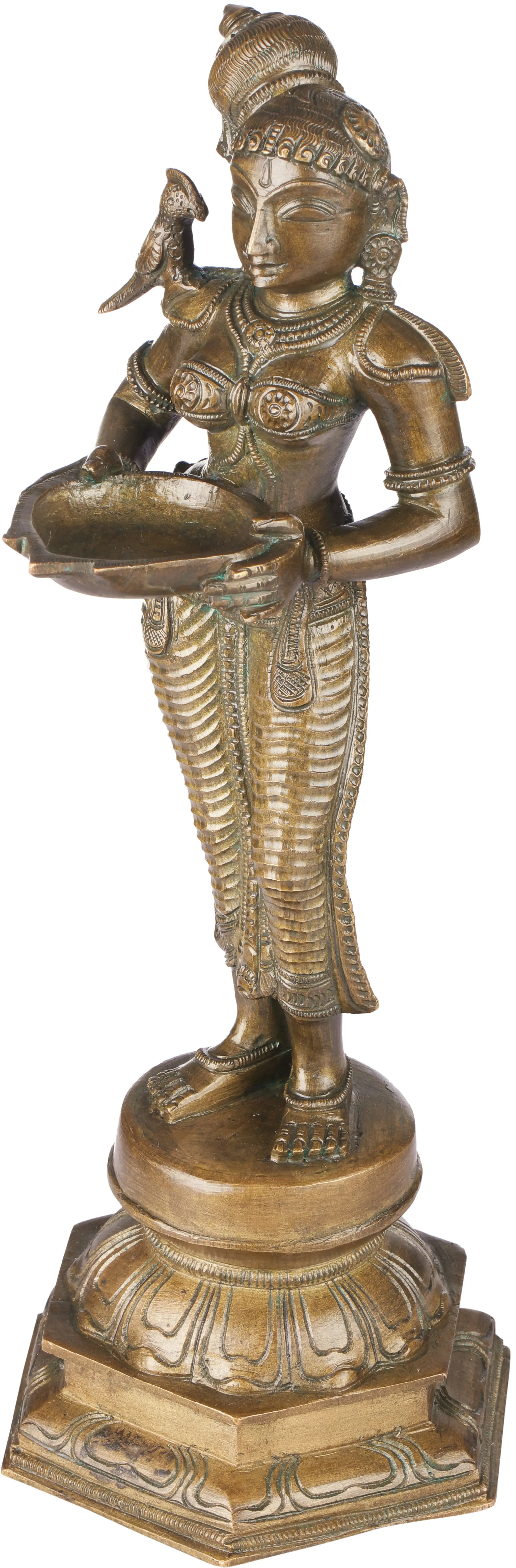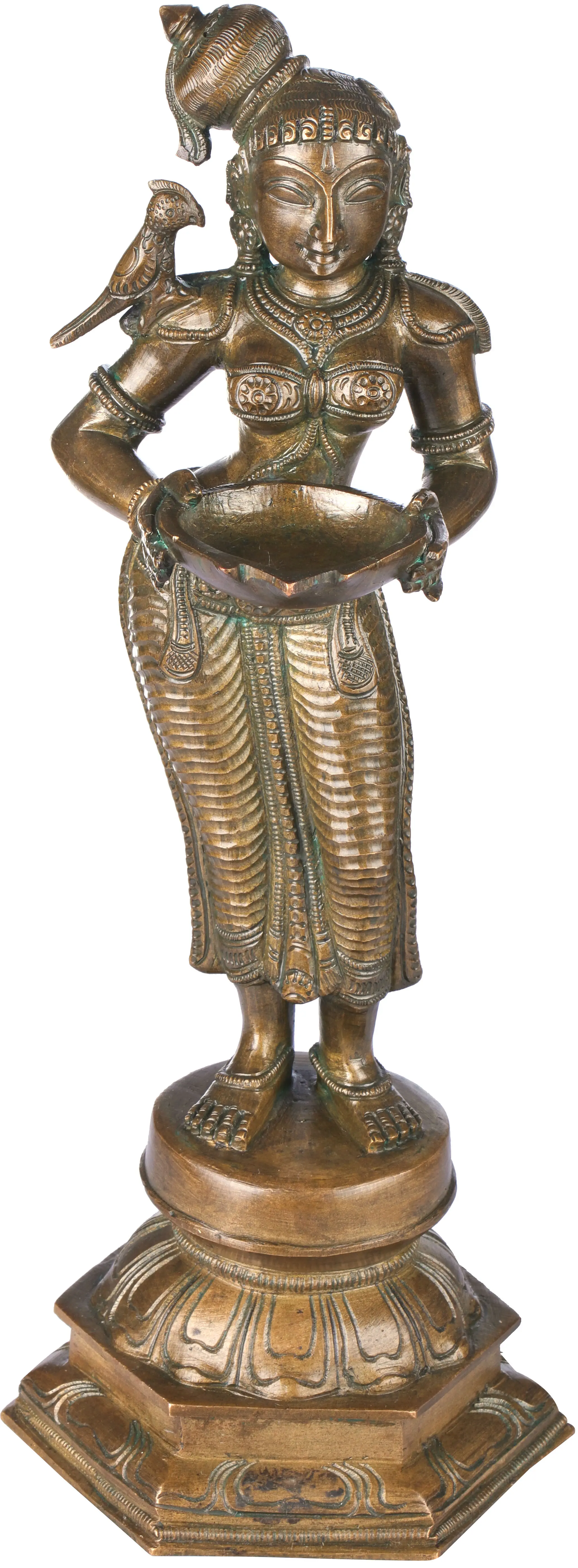 The deepalaskhmi figure is supposed to be placed at the entrance to one's home or office. These gorgeous ladies bear a welcoming stance. The thalis in their hands are designed to hold a number of ghee lamps to be lit shortly before the arrival of visitors. They are dressed in traditional Indian silks and wear a world of shringar. Their hips are jutting out, their faces bearing an infectious calm. A parrot is perched on the gracious shoulder of each of the deepalakshmis, which is considered a symbol of romance in Indian culture. Note the traditional Indian hats that rest at an angle on the lovely heads of the ladies, and the multi-lateral lotus pedestals they are propped up on.