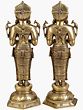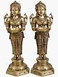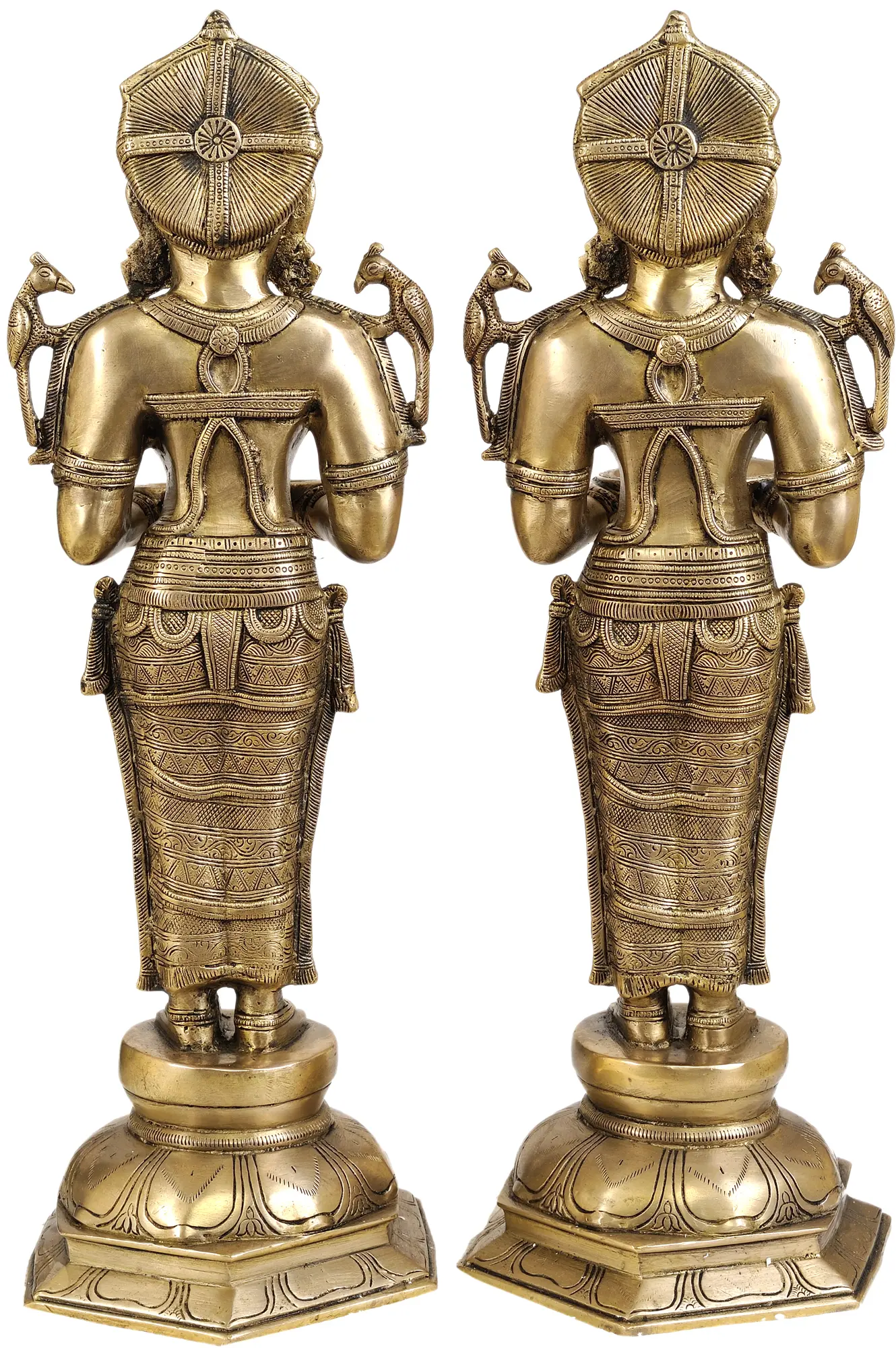 These striking figures stand at approximately 20.7 inches tall, commanding attention without overwhelming your space. Their elegant proportions are enhanced by the rich, warm luster of the brass. Notice the graceful stance, the serene expressions, and the symbolic peacocks adorning their shoulders, each a testament to divine beauty and vigilance. The intricately carved drapes and elaborate jewelry showcase a profound understanding of classical aesthetics.