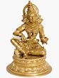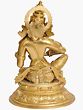 Since she is the source of fertility and nourishment, Maa Annapurna is shown as a young woman, endowed with all the signs of fecundity. She has pronounced breasts, highlighted by a flower-studded breast band, she wears royal jewellery and an imposing crown, all studded with priceless gemstones. A single string yajnopavita from her left shoulder diagonally crosses her body. Devi sits in Ardhaparyankasana, with one leg folded and the other slightly stretched, both made appealing by the designer fabric of her dhoti. Goddess Annapurna sits on a padmapeetha (lotus platform) and with a ladle, in one hand a bowl in the other, serves food imbibed with her affection and invites her children to partake in the divine feast.