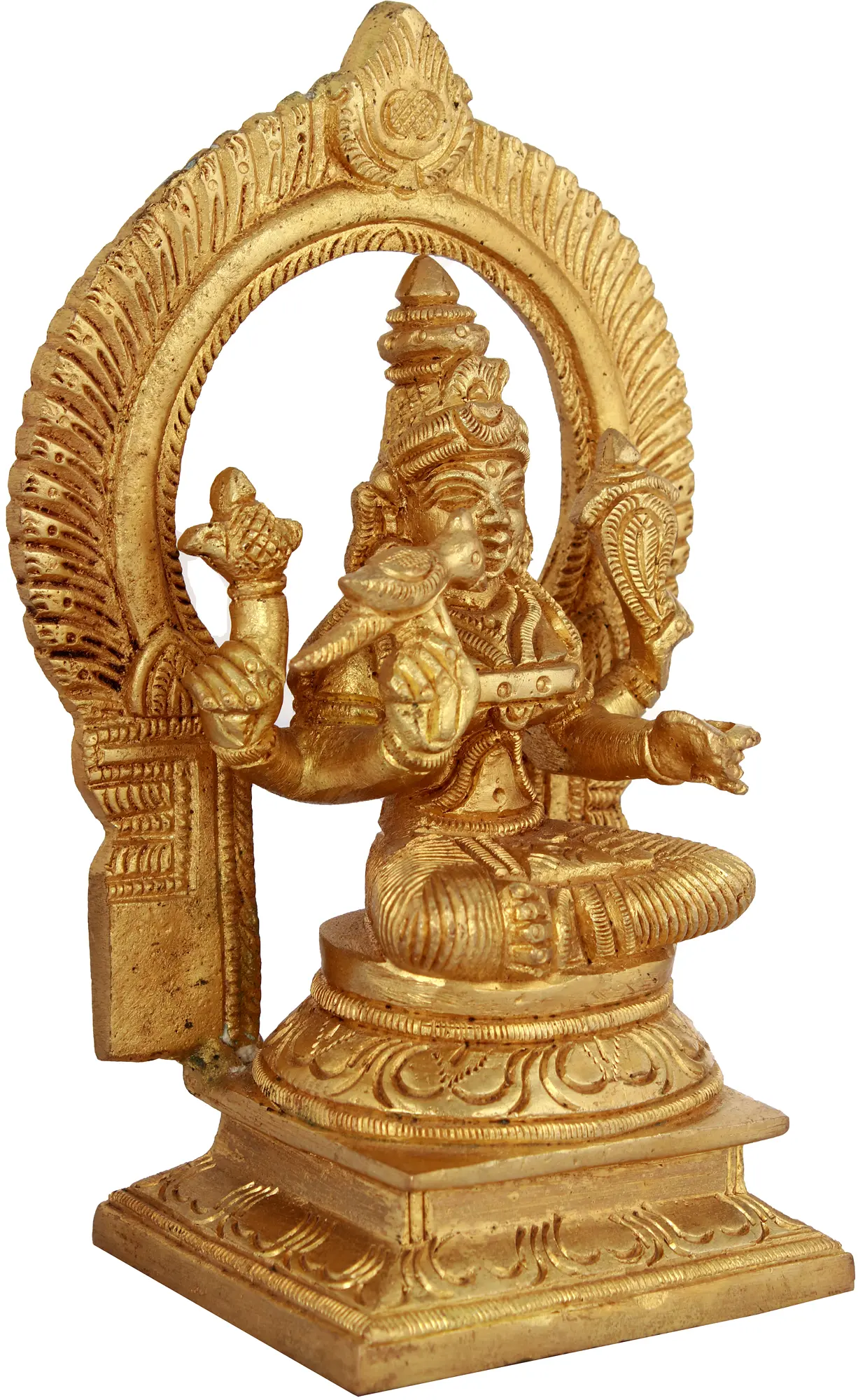 This exquisite brass statue depicts the revered Hindu goddess Kamakshi, a form of Parvati, in a posture of serene grace and gentle authority. Kamakshi, whose name translates to "the one with loving eyes," is particularly worshipped in Kanchipuram, an ancient city renowned for its temples and spiritual significance. She is the presiding deity of the city and is believed to bestow prosperity, auspiciousness, and the fulfillment of desires upon her devotees. This meticulously crafted idol captures her divine essence, making it a perfect addition to any sacred space or home altar.