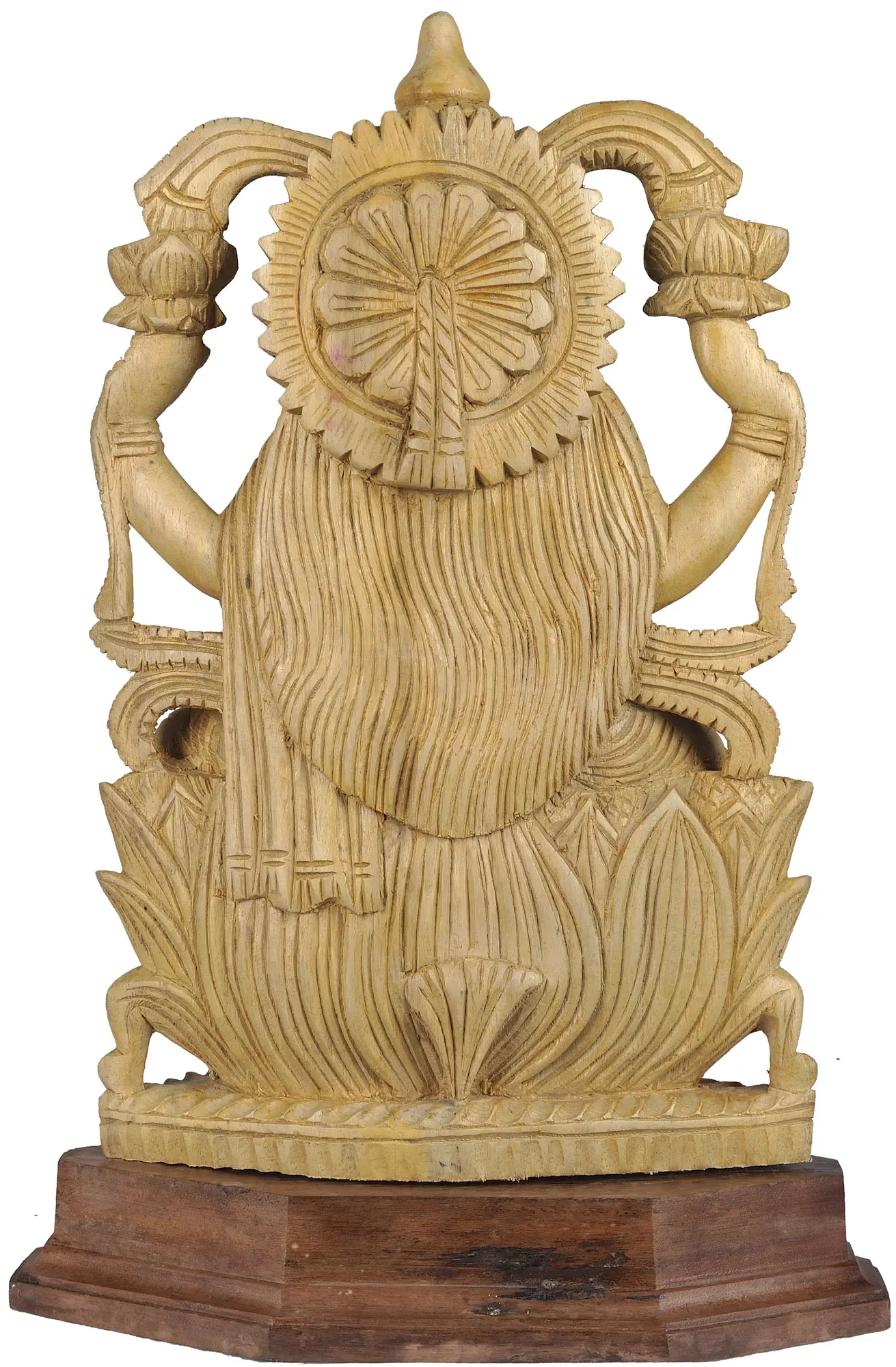 Behold the exquisite artistry of this handcrafted statue, depicting the revered Hindu Goddess, a symbol of abundance, prosperity, and fortune. Every curve and contour is meticulously carved from white cedar wood, a testament to the skill and dedication of artisans in Trivandrum, a region renowned for its rich tradition of wood carving. The statue captures the divine essence of the goddess, representing not only material wealth, but also spiritual fulfillment and inner peace. Her serene expression radiates compassion and grace, reflecting her role as the bestower of blessings and the embodiment of beauty. The intricate details showcase the devotion and artistry that went into creating this sacred representation. Bring the presence of Lakshmi into your home or sacred space and invite the energies of prosperity, good fortune, and spiritual growth into your life.