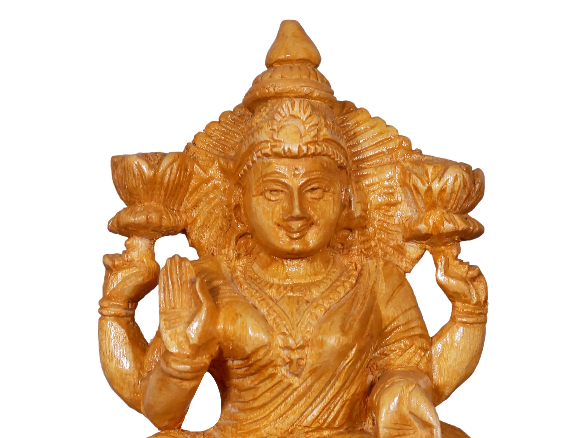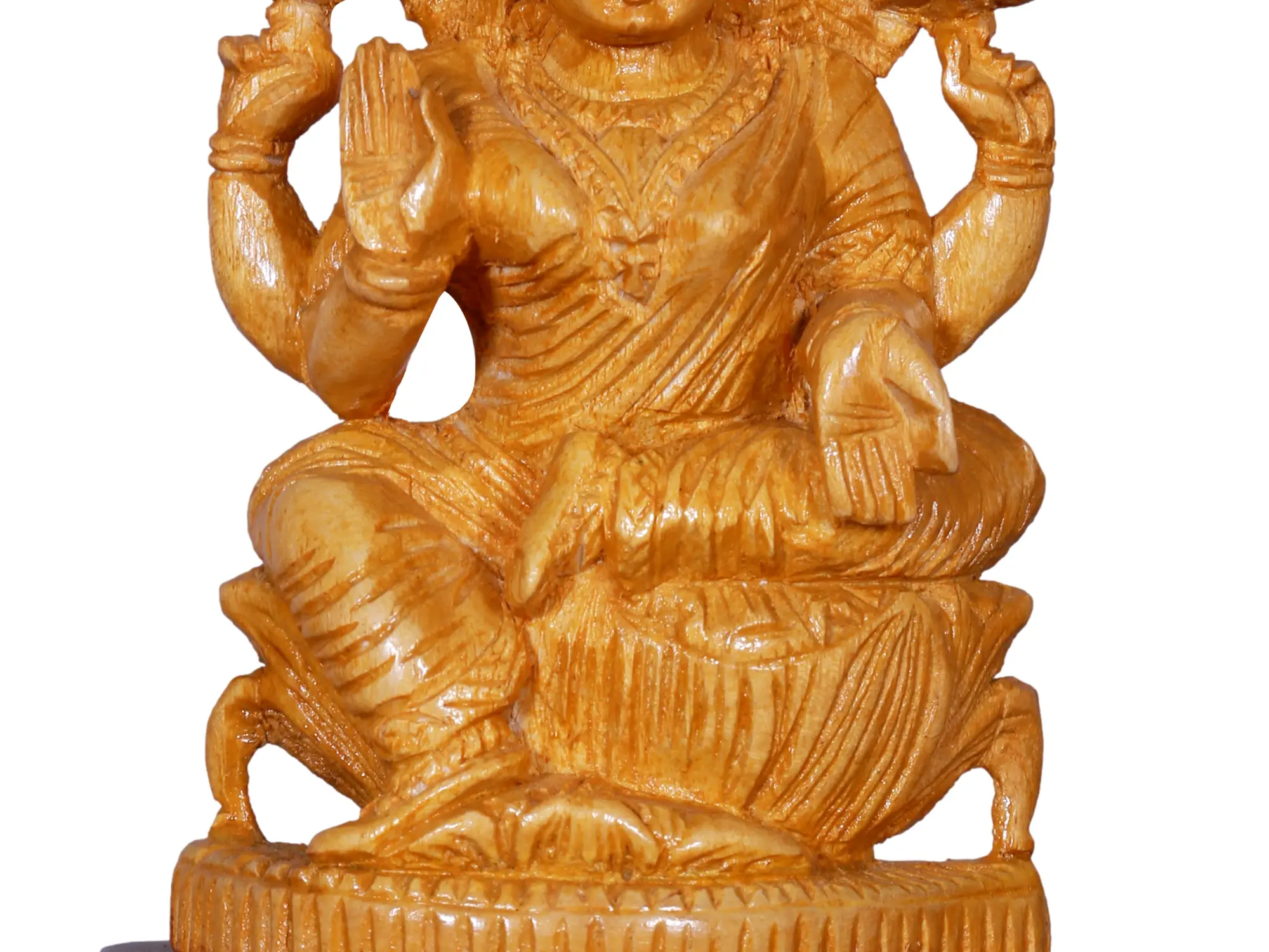 Graceful and majestic, Goddess Lakshmi, also known as “Shri”, sits enthroned in Lalitasana, her form an epitome of elegance and benevolence. The very essence of serenity is captured in her countenance, a tranquil smile playing on her lips. Her right hand extends in the “Abhaya Mudra”, offering assurance and fearlessness to all who gaze upon her. In her left hand, poised in “Varada Mudra”, She bestows blessings, an endless cascade of benevolence. Adorned in regal attire, her majestic presence is accentuated by intricate jewellery and a royal crown. Holding lotus flowers aloft in her upper hands, she exudes purity and abundance. This wooden masterpiece evokes a sense of divine serenity and boundless prosperity.