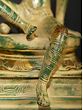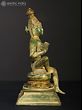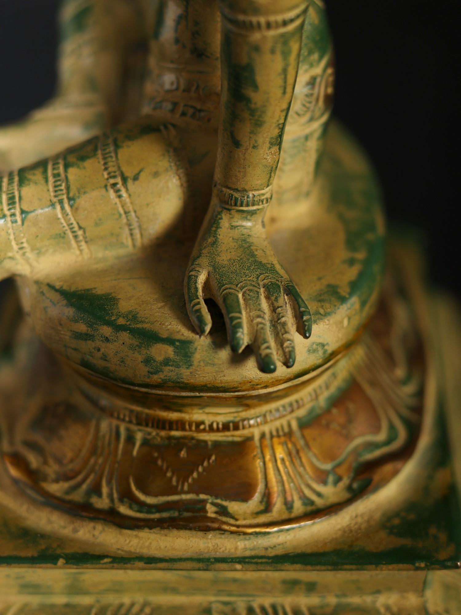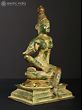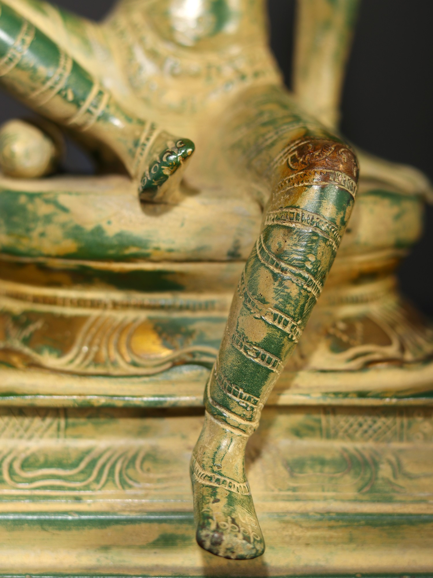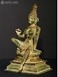 This exquisite brass statue depicts Devi Parvati in her Lalita form, a captivating embodiment of beauty, power, and divine grace. The intricate details and rich patina showcase the artistry of traditional Indian craftsmanship. Parvati, the daughter of the Himalayas, is one of the most revered goddesses in Hinduism, representing the feminine principle, Shakti. This statue captures her in a moment of serene elegance, radiating a divine aura that will grace any space. The 8.8 x 5.25 x 4.75 inch dimensions make it a perfect addition to home altars, meditation corners, or as a striking piece of decorative art. Crafted from high-quality brass, this statue is not only visually stunning but also durable, promising to be a cherished heirloom for generations to come. The exquisite green and gold patina adds depth and visual interest.