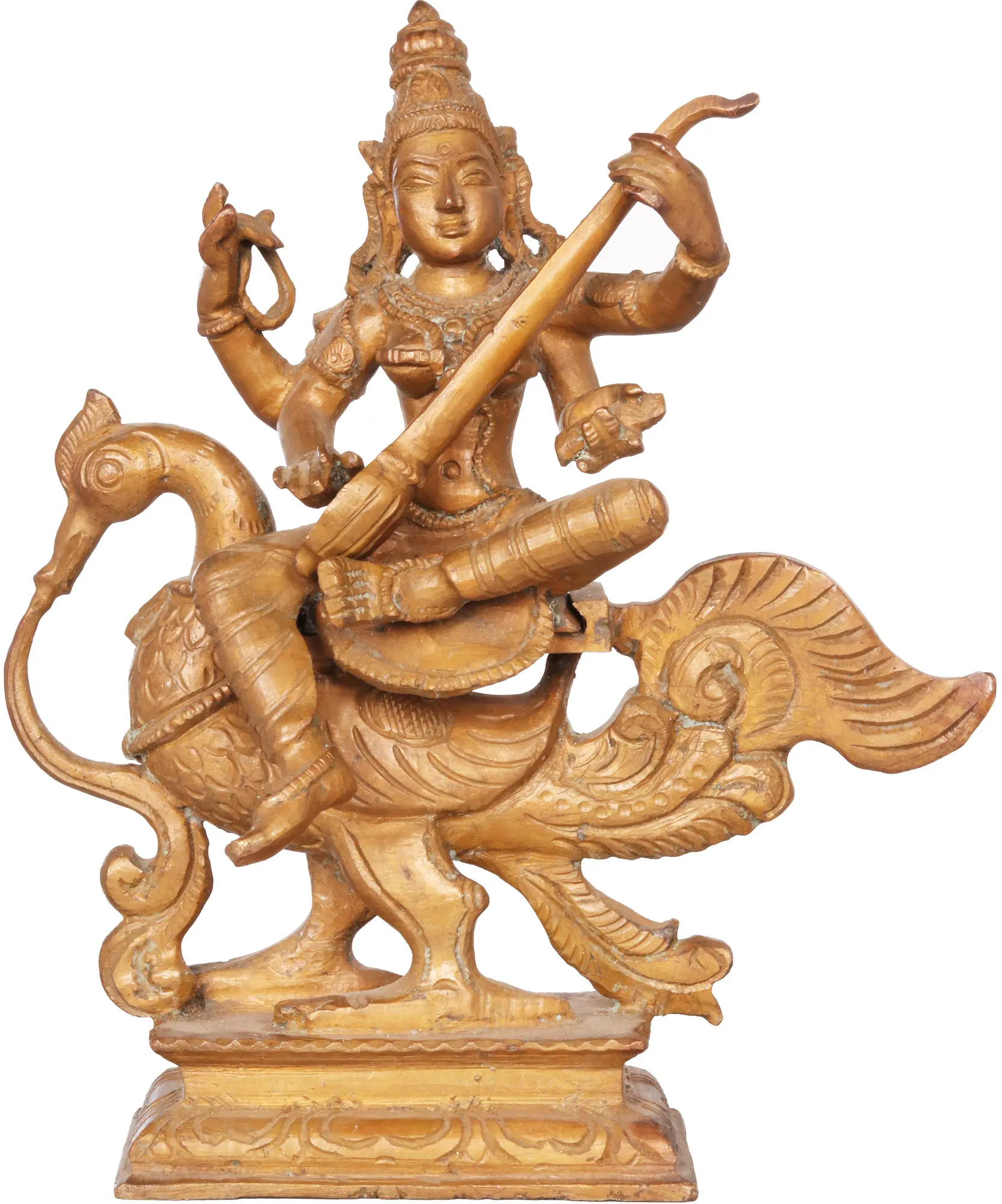 This exquisite bronze statue captures the divine essence of Devi Saraswati, the Hindu goddess of knowledge, music, art, speech, wisdom, and learning. Seated gracefully upon her celestial vahana, the peacock, this piece is a testament to the rich artistic traditions of Swamimalai, renowned for its mastery in metal craftsmanship. The vibrant, golden hue of the bronze evokes a sense of divinity and enduring beauty, making it a truly captivating centerpiece for any sacred space or discerning collection.
