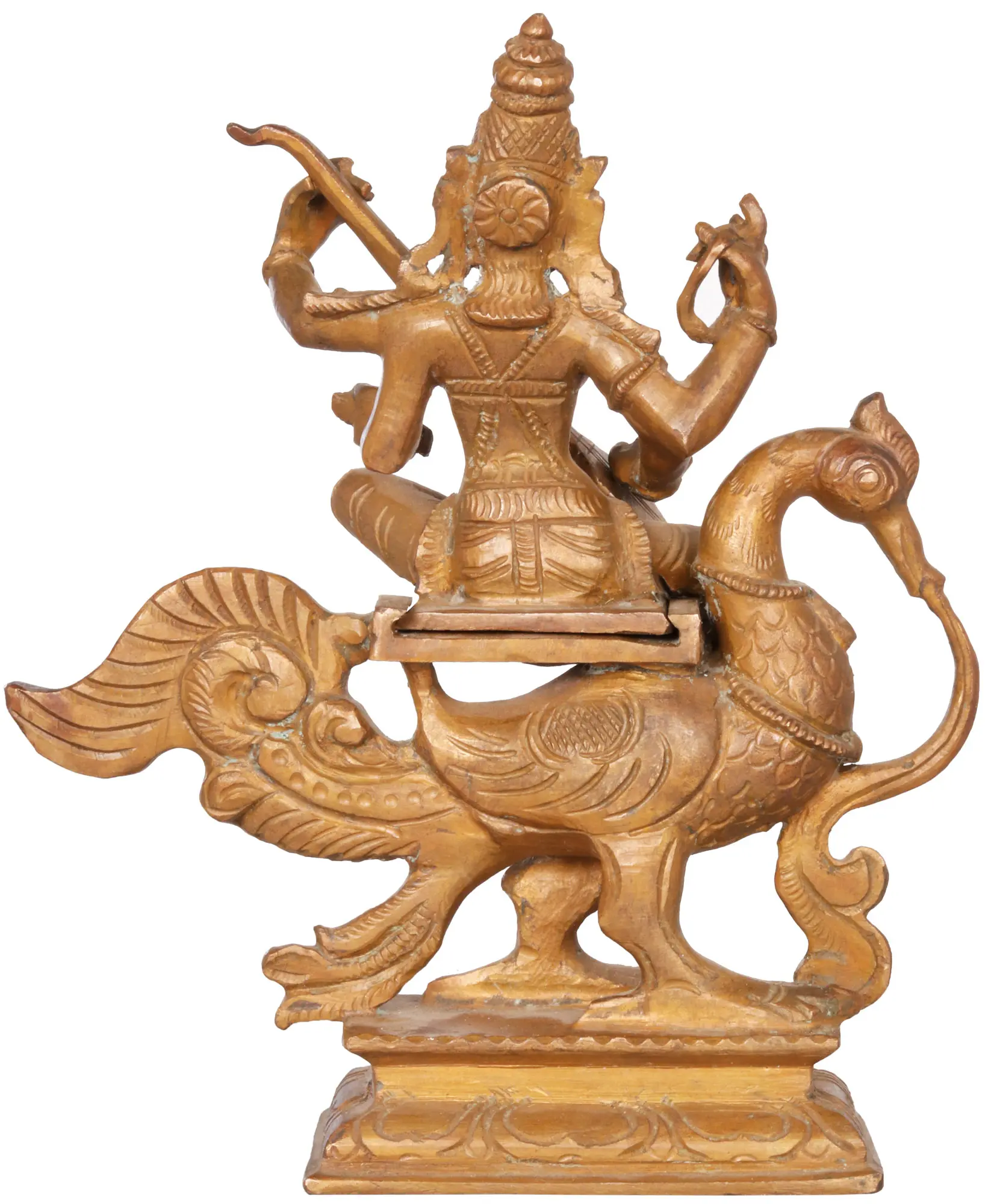 The goddess is depicted in a serene posture, her hands gracefully adorned with symbolic gestures and holding the veena, the ancient Indian stringed instrument. The veena, a symbol of Saraswati's mastery over music and the arts, appears to hum with an ethereal melody, resonating with the very air around the sculpture. Her flowing garments and intricate jewelry speak of her regal stature and her boundless grace. The peacock, a creature of unparalleled beauty and pride, is rendered with remarkable detail, its majestic form complementing the divine presence of the goddess. The peacock's iridescent plumage, though captured in solid bronze, seems to shimmer with life, symbolizing wisdom, enlightenment, and the triumph of knowledge.
