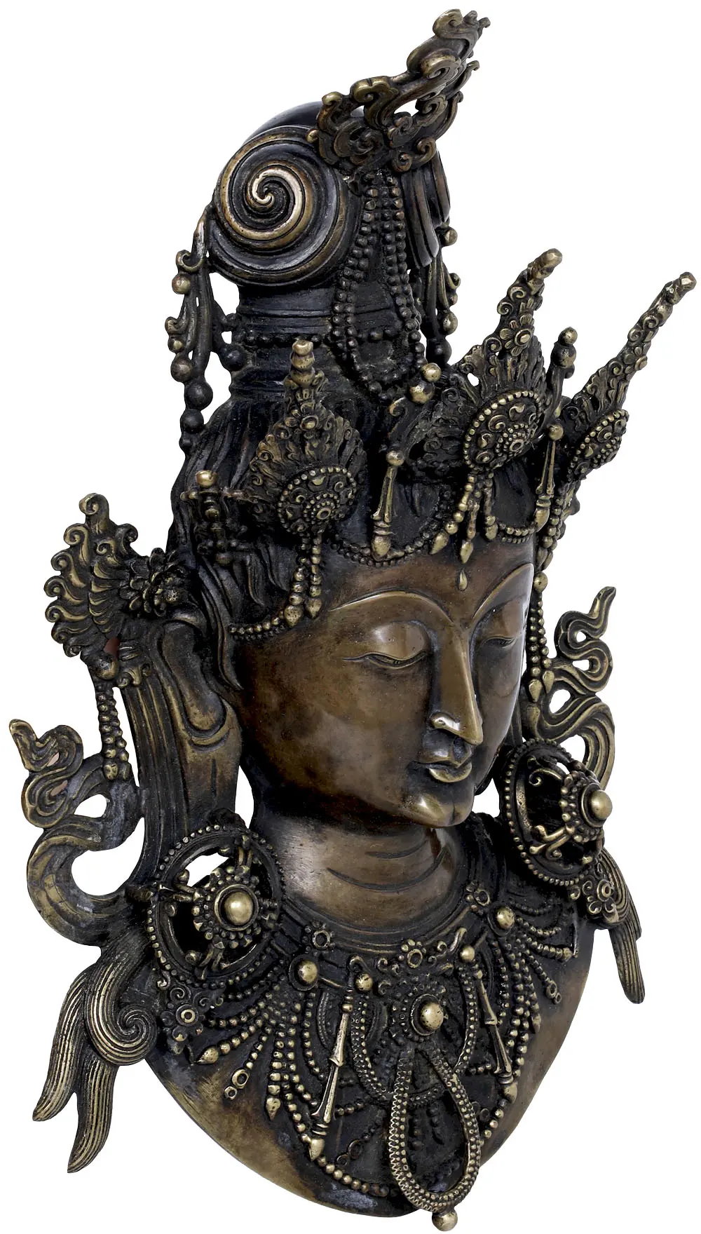 The Nepalese sculptural tradition has a taste for unusual media, to which this work of art stands testimony. She is sculpted from copper, Her burnished skin glowing under the faintest hint of light. From Her long, sharp nose to the brow that resembles the gracious wings of an albatross, Her beauty is enough to stun the onlooker and make them stop dead in their tracks. Such beauty and, more importantly, such a stance could belong to none other than Devi Tara of the Buddhist pantheon.