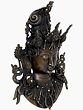 This mask of the Devi has been handpicked for the sheer devotion that has been poured forth into the make. It is the sculptor’s shraddha that reflects in the complex crown that towers over Her head and the bejewelled tassels that rest on Her brow. Flaming kundalas flank Her face, and a necklace of gold completes the composition.