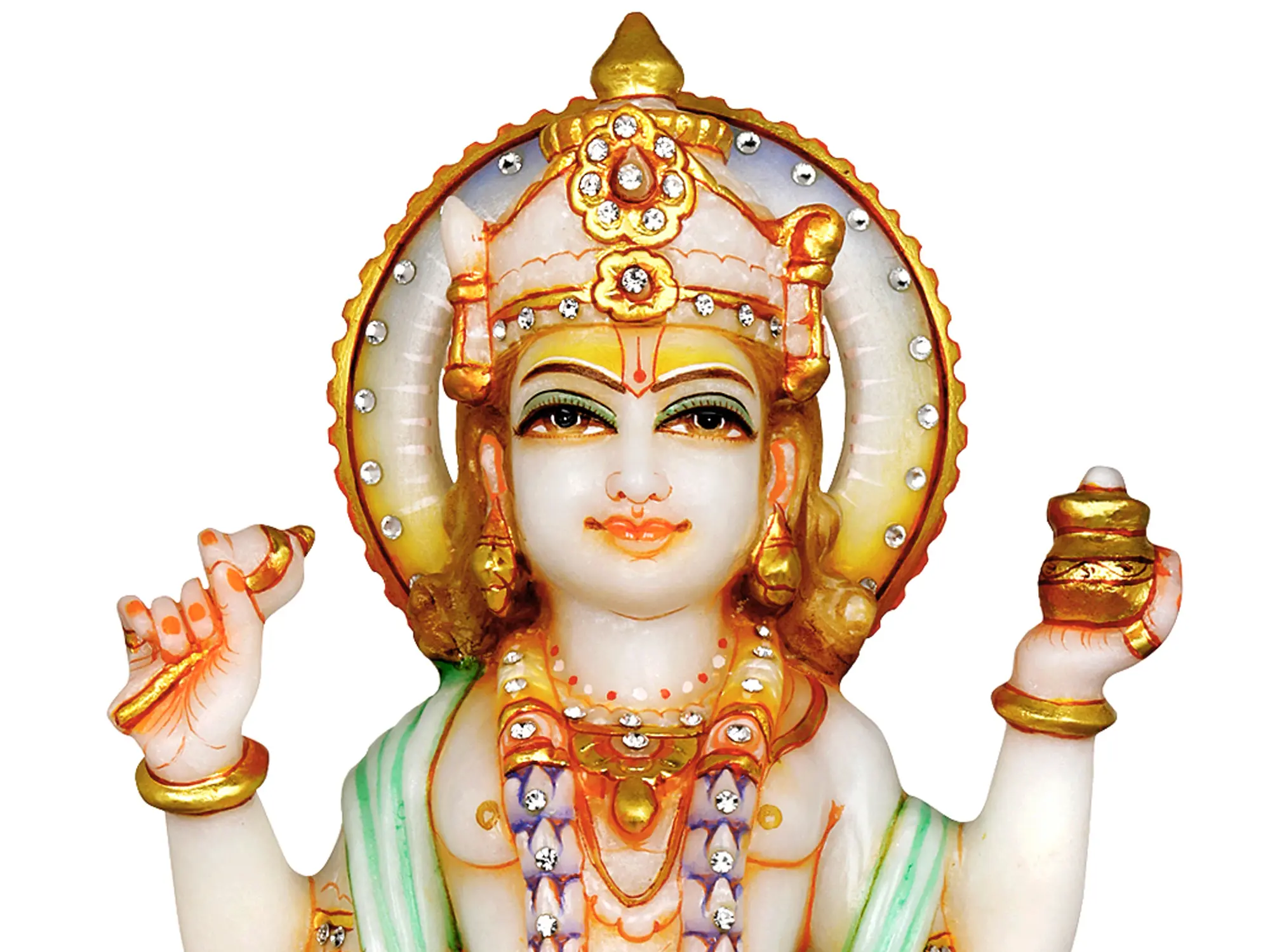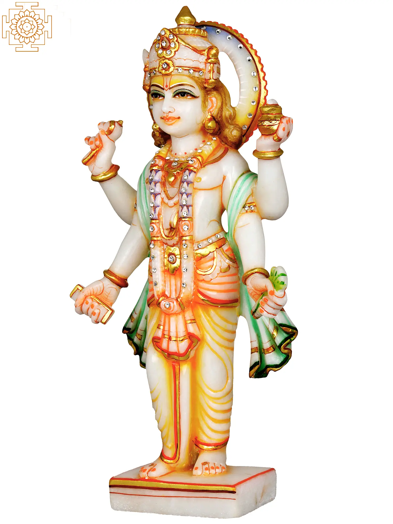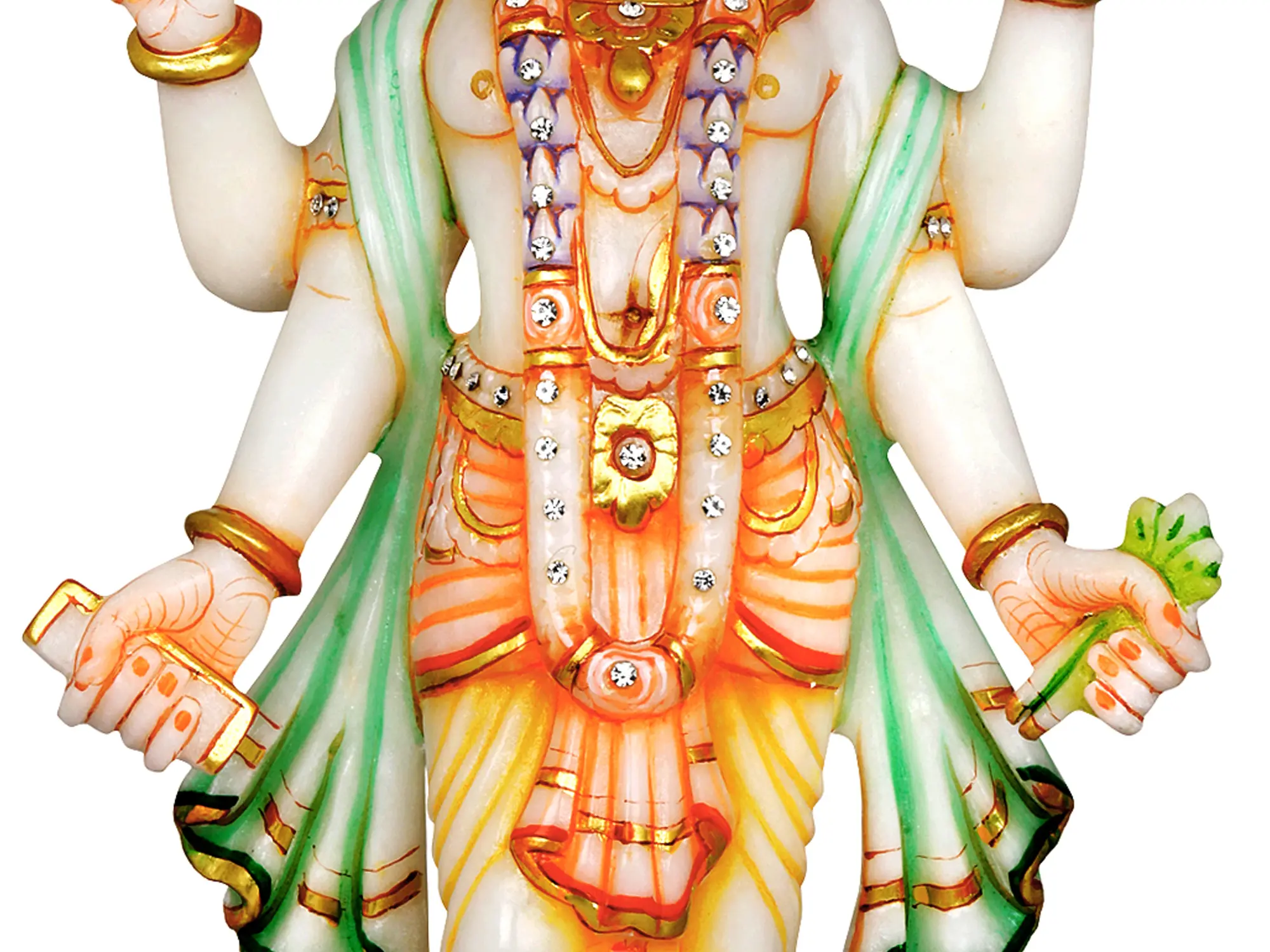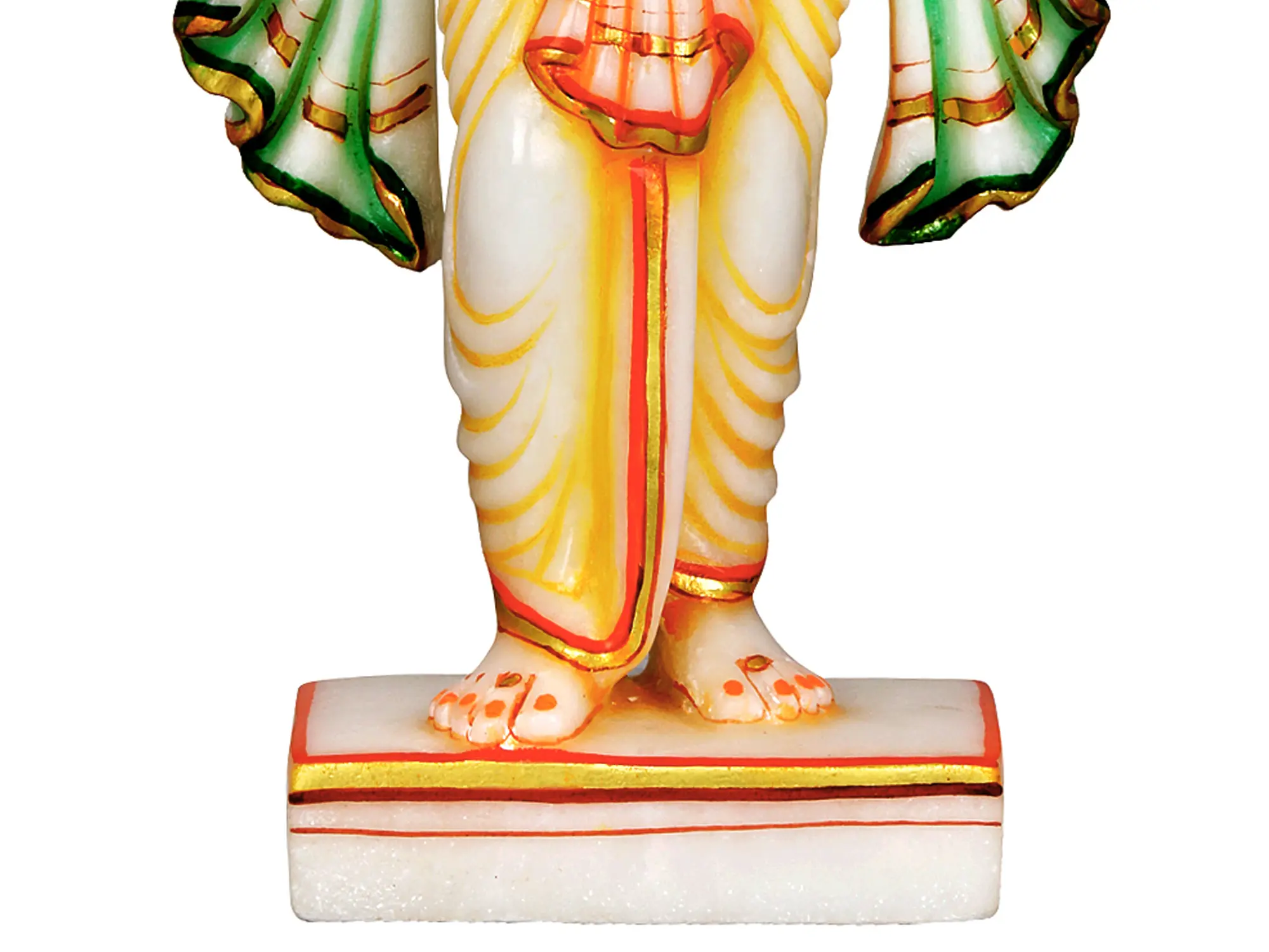Crafted from pristine white marble, this statue embodies purity and divinity. The inherent beauty of the marble, combined with the skilled craftsmanship, brings the divine form of Dhanvantari to life. The subtle painting and embellishments highlight the divine aura and radiant energy of the deity. This statue serves not only as a beautiful piece of art but also as a powerful symbol of hope, healing, and the enduring quest for well-being. It is an ideal addition to any home, temple, or meditation space, inviting blessings of health and prosperity.