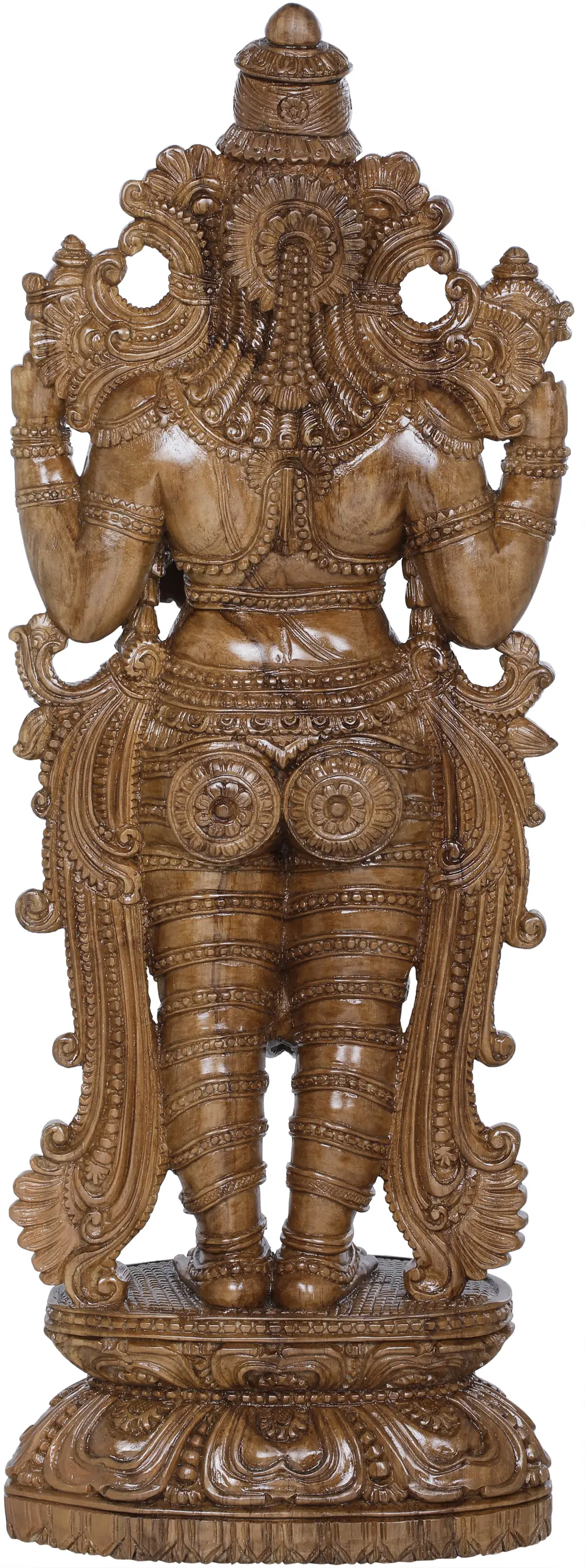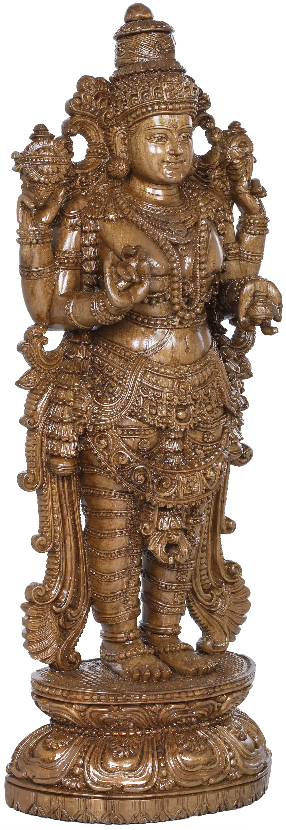 Teak is the most popularly used form of wood for making sculptures as its solid marble base and rot resistant characteristic makes it long lasting and gives a natural appeal to the statue. This statue shown here is carved out by the best artisans from South India pertaining to its beautiful look and glossy lustre. Lord Dhanvantari is the physician of gods, both in vedas and puranas and is revered as an incarnation of Lord Vishnu. He arose from the Ocean of Milk during Samudra Manthan with the pot of amrita in his hand.