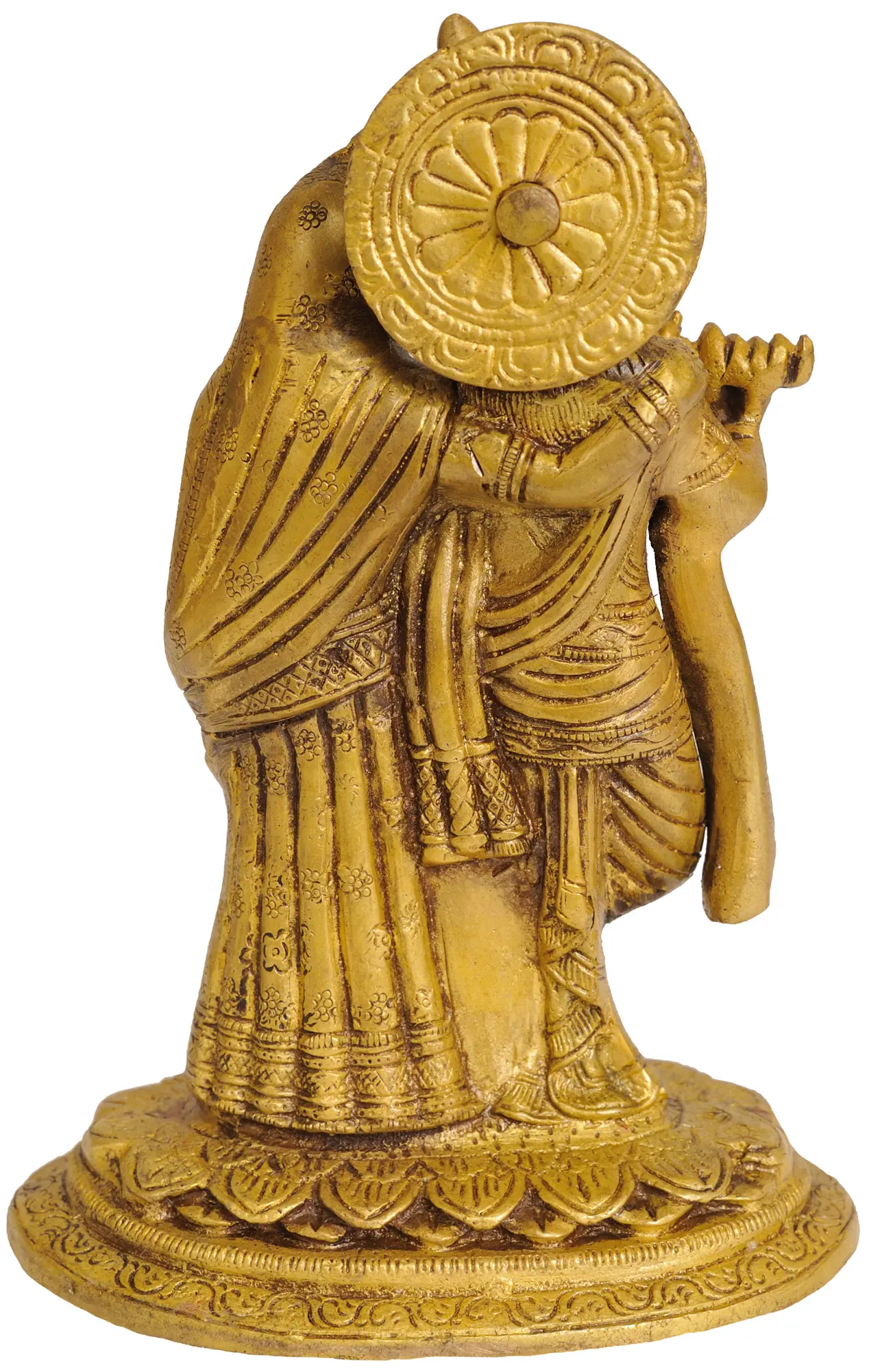 The artists have meticulously rendered every detail of this brass masterpiece. Krishna, with his characteristic serene expression, holds his flute to his lips, as if conjuring a melody that captivates all hearts. His divine presence is further accentuated by the peacock feather adorning his crown and the gentle curves of his form. Radha, depicted with graceful poise and a radiant smile, embodies selfless love and unwavering faith. Her gentle touch upon Krishna's arm signifies their inseparable connection, a bond transcending time and space. The flowing garments, adorned with delicate patterns, add a touch of opulence and artistic finesse, showcasing the skill of the artisans who have breathed life into this sacred representation. The circular aureole behind Krishna's head symbolizes his divine effulgence, while the intricately designed base provides a stable and elegant foundation for this divine tableau.