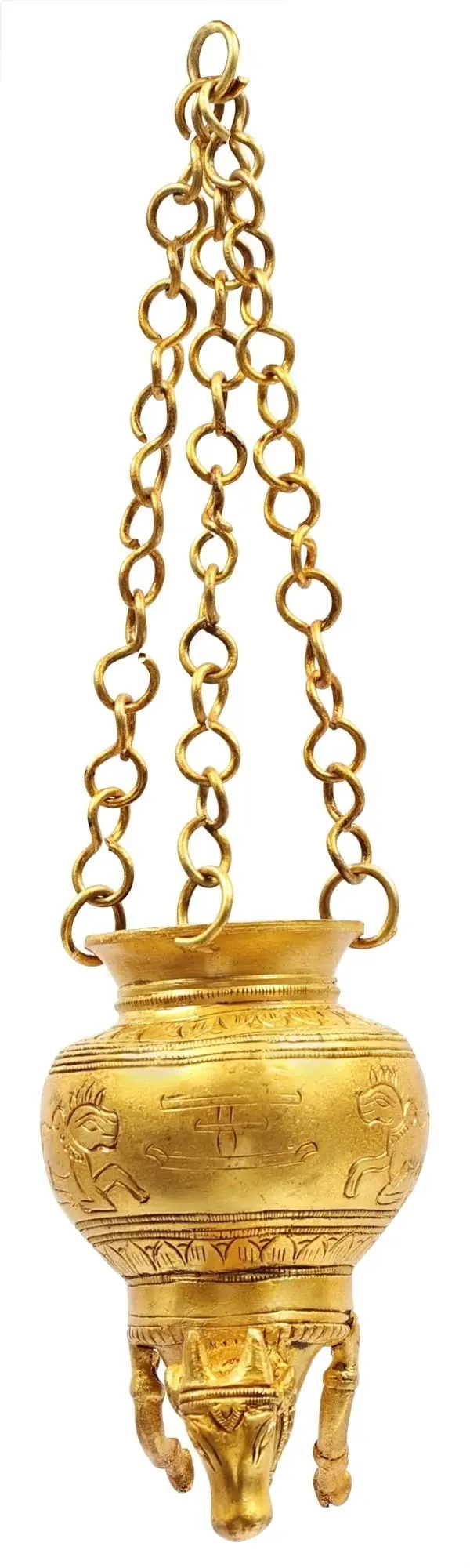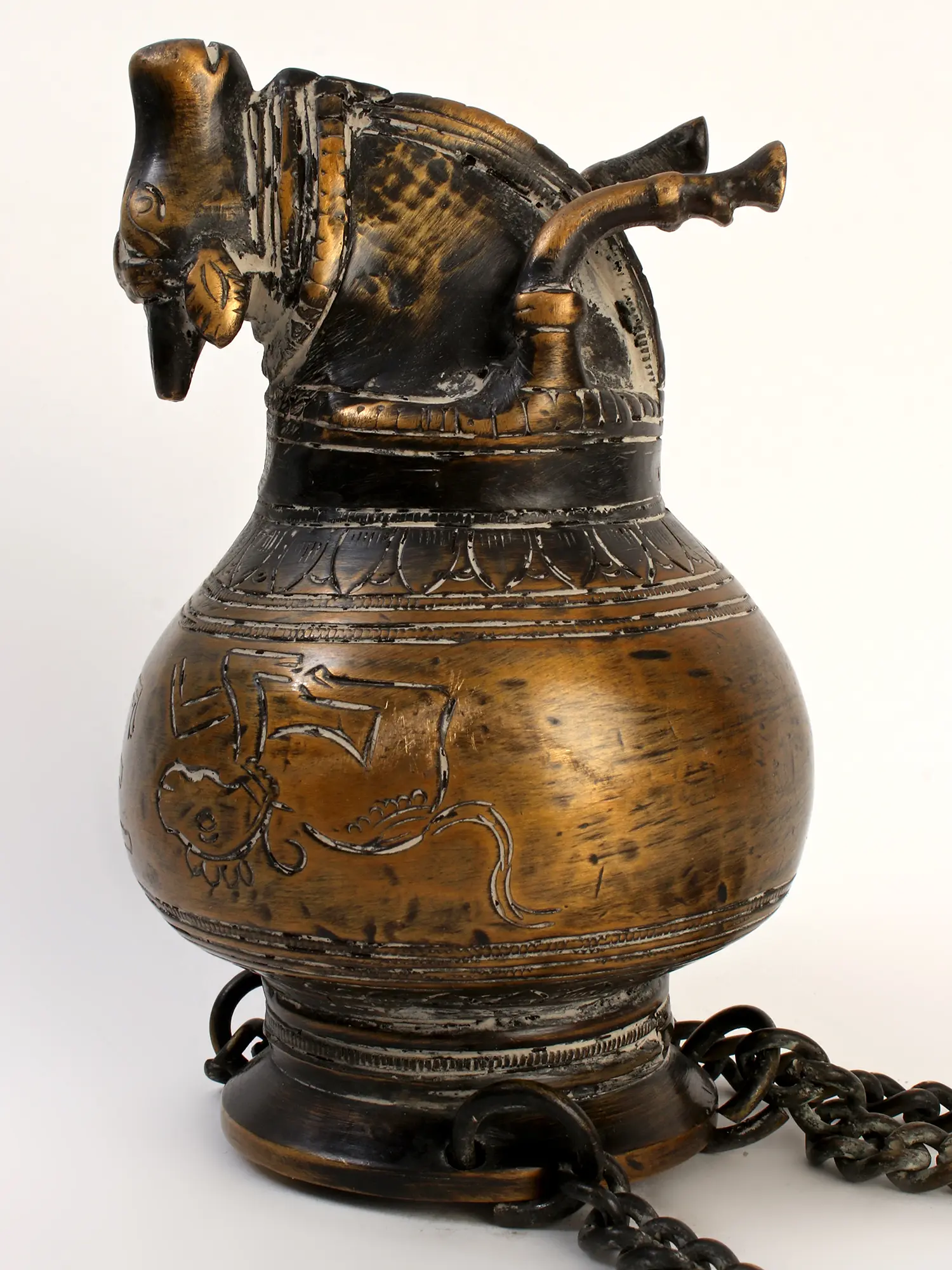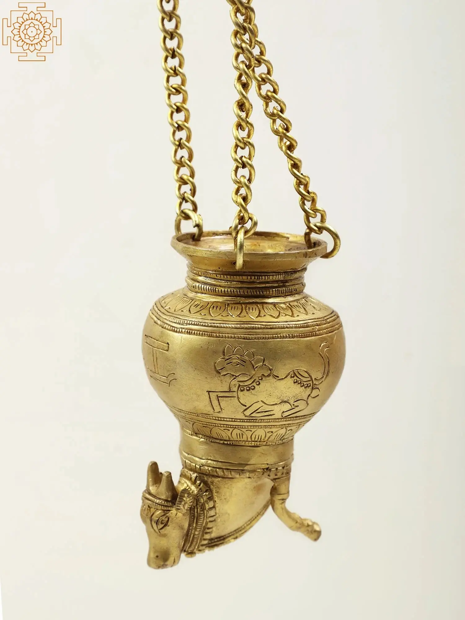 This brass vase is more than a functional piece; it is a conduit for the ancient ritual of pouring milk, the purest offering, over the revered Shiva Linga. Adorning this vase are intricate carvings of Nandi, Lord Shiva's loyal vehicle and divine steed. Nandi is not just a symbol; he is the embodiment of unwavering devotion and pure surrender to the divine. His presence on this vase amplifies its sacred significance.