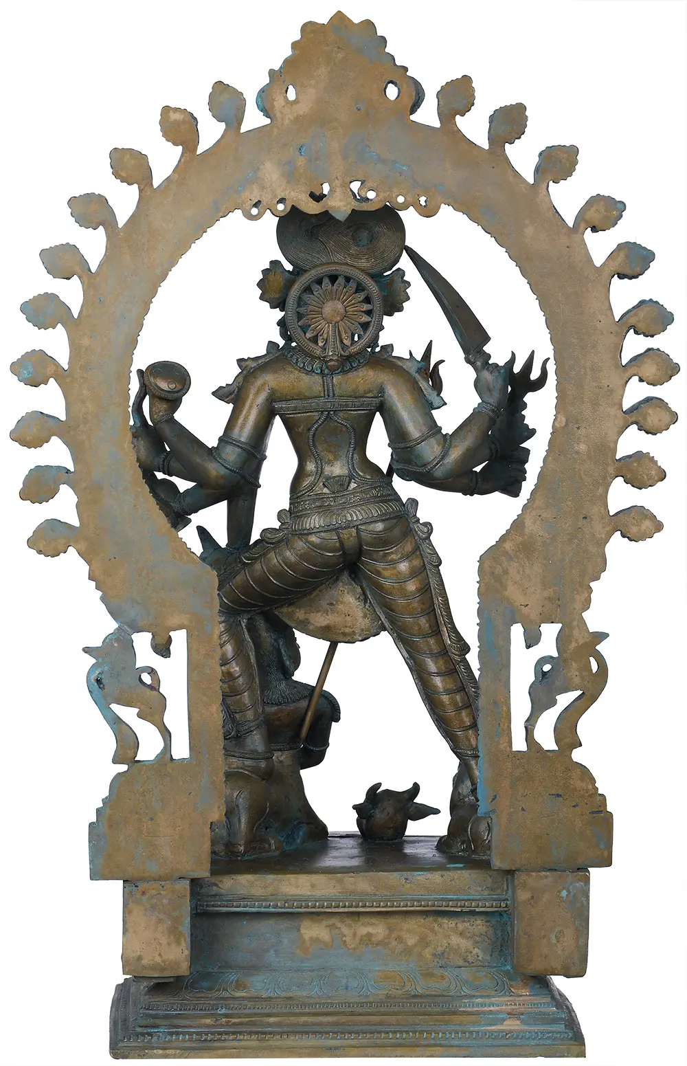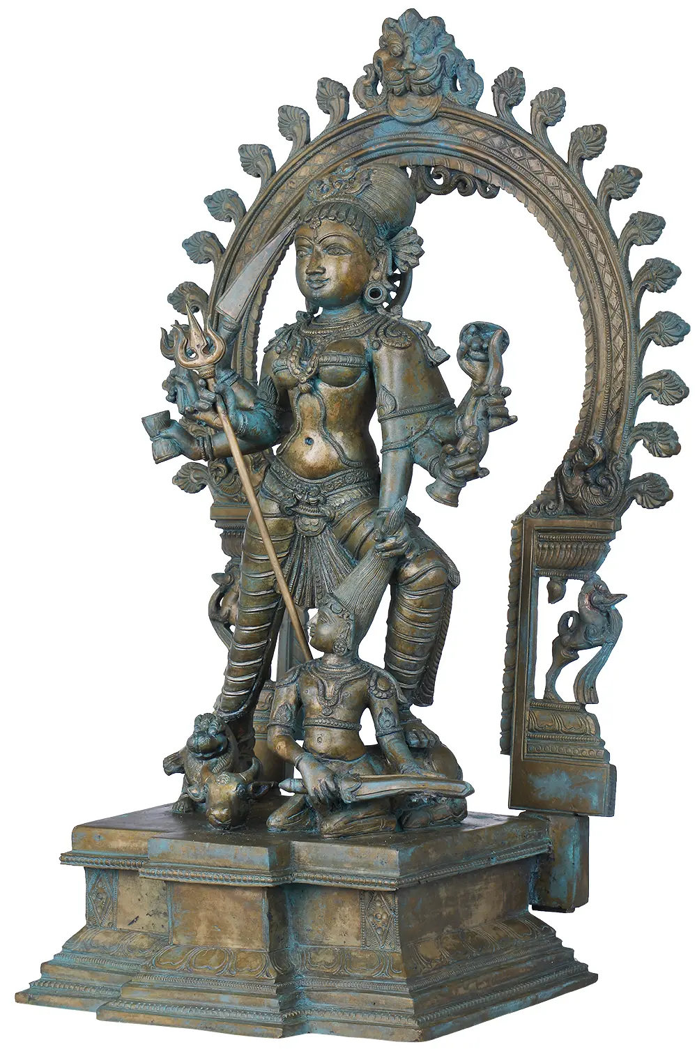 The aureole that surrounds Her is indicative of the traditional style of the composition. Multiple concentric circles, the innermost one engraved with lotus petals. Diamond-like engravings and a ring of fire flaming outwards in all directions, symbolic of the power and glory of Devi Mahishasuramardini. Finally, the Kirtimukham at the zenith of the aureole betrays the Southern heritage of this work of art.