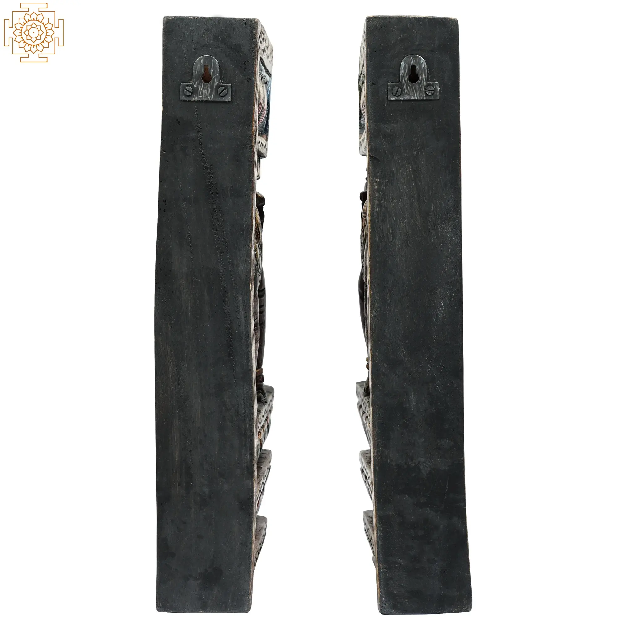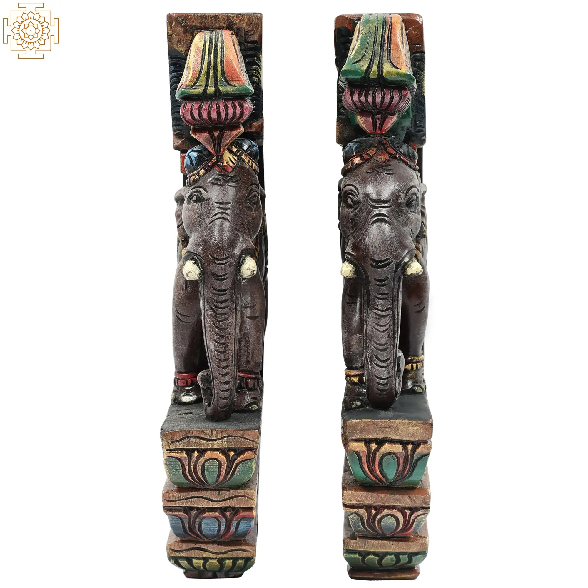 These exquisitely carved wooden brackets are more than just decorative elements; they are a testament to the enduring symbolism of the elephant in Indian culture and Hindu mythology. Each bracket features a majestic elephant, meticulously rendered with lifelike detail, standing proudly beneath an ornate, vibrantly colored canopy. The rich, earthy tones of the wood are complemented by splashes of red, blue, green, and gold, evoking a sense of opulence and spiritual significance.