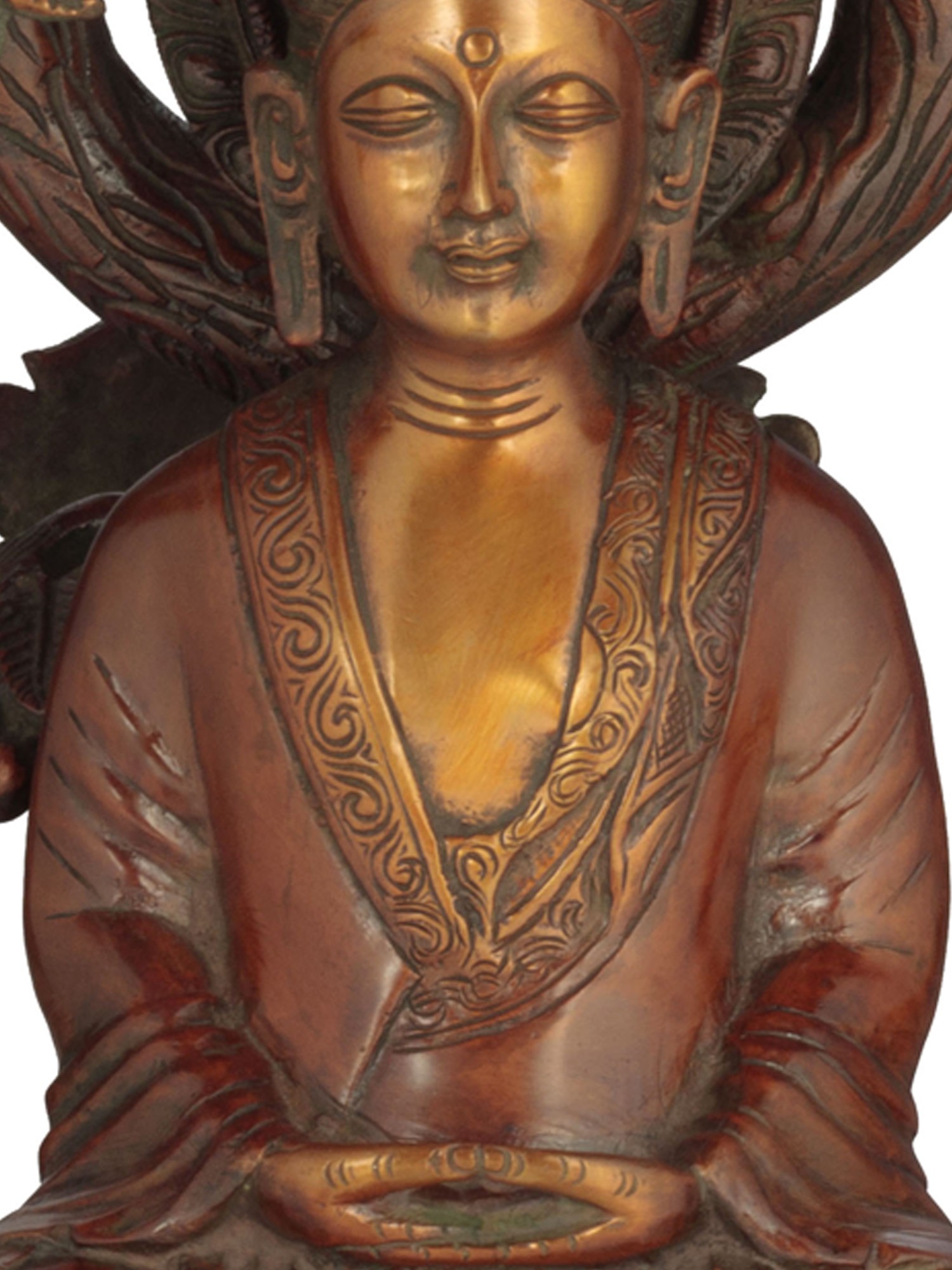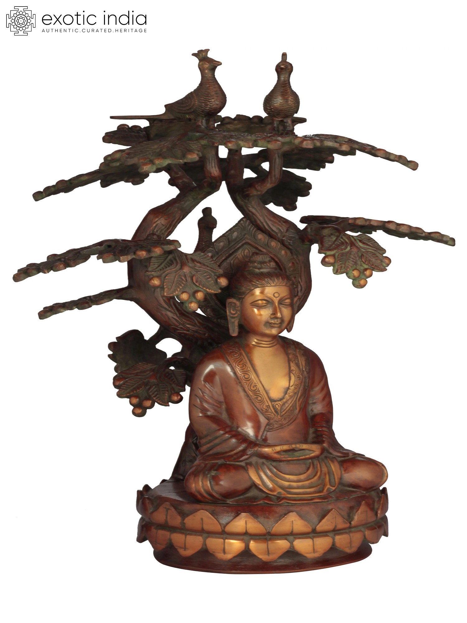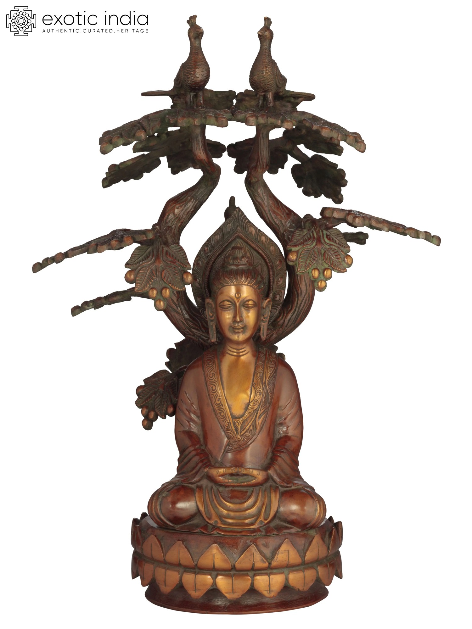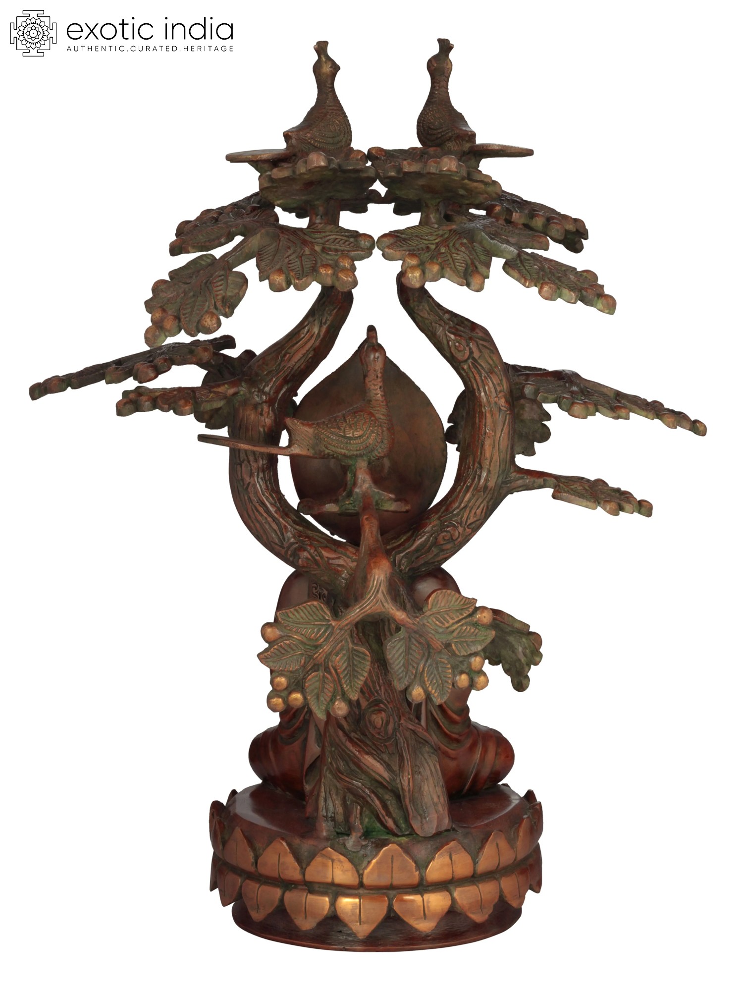 As shown in this sculpture, Gautama Buddha is in his meditation posture on a balanced double lotus pedestal called Visvapadmasana under the famous enlightened tree with two peacocks sitting at the top; these, apart from being symbolic of peace and prosperity also add to the beauteous detail of the revered sculpture.
