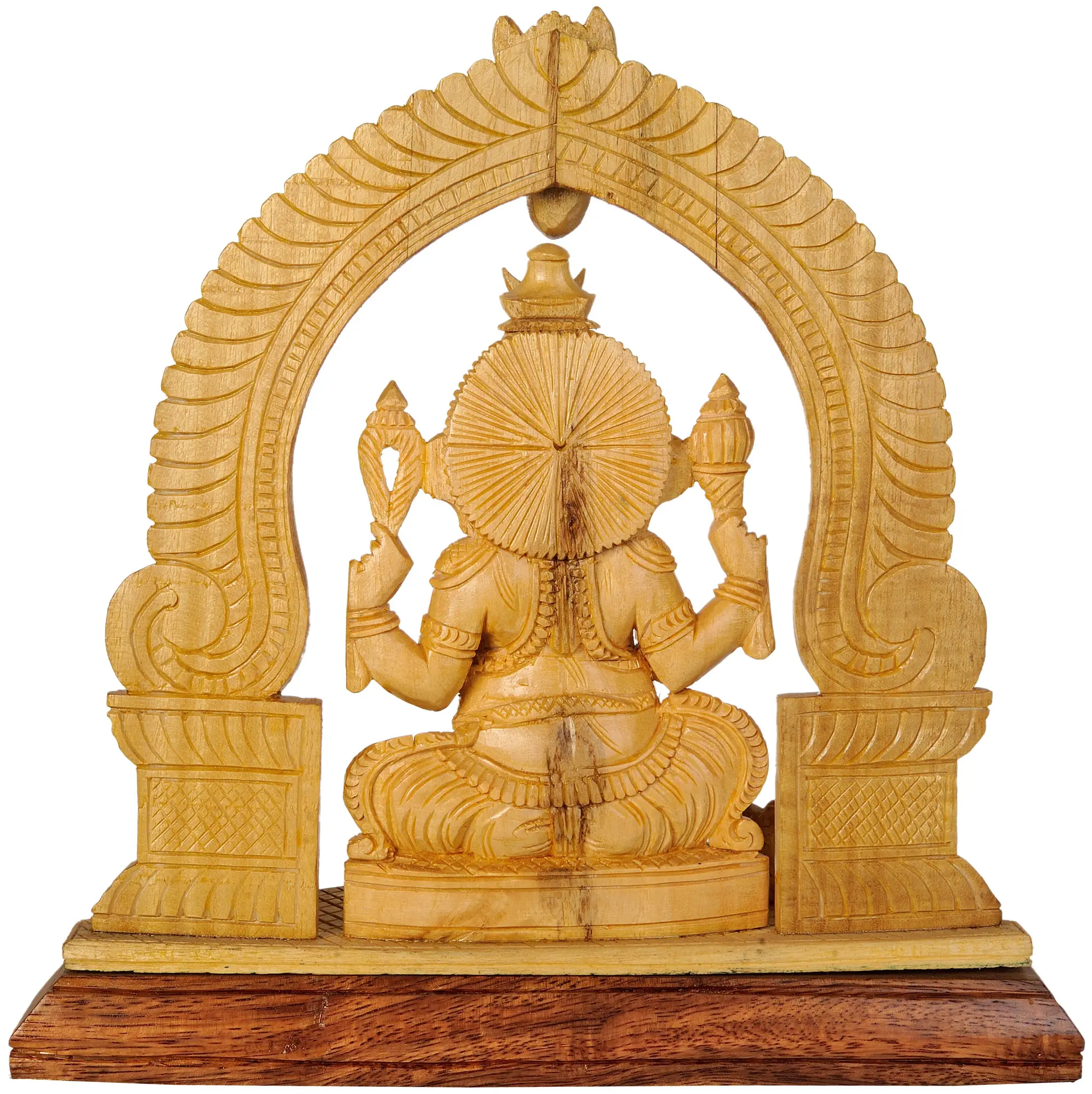 This meticulously carved representation captures Ganesha in a pose of serene authority, seated upon an elevated platform. The artist's skilled hand has rendered every detail with loving care. The statue is fashioned from White Cedar wood, sourced directly from the lush landscapes of Trivandrum, Kerala. This wood is favored for its fine grain, workability, and natural luster, rendering the detailing stand out. Notice the intricate archway framing Ganesha, crowned by the face of a *Kirtimukha*. A fierce yet benevolent guardian, *Kirtimukha* is a symbol of triumph over negativity, warding off evil and protecting the sacred space. Ganesha is depicted holding his traditional attributes, the *modak* (sweet dumpling), and the *ankusa* (goad). The *modak* represents the sweetness of inner realization, while the *ankusa* symbolizes control and direction. At his feet sits his loyal mount, the mouse, symbolizing the ability to overcome obstacles, and signifying that even the smallest creature can achieve great things with wisdom and devotion. Every element contributes to the overall sense of peace, power, and divine presence. This piece is more than just a decorative object; it is an embodiment of faith, artistry, and cultural heritage. The warm, natural tones of the wood add to its inviting presence, making it a suitable centerpiece for your home, meditation space, or office.