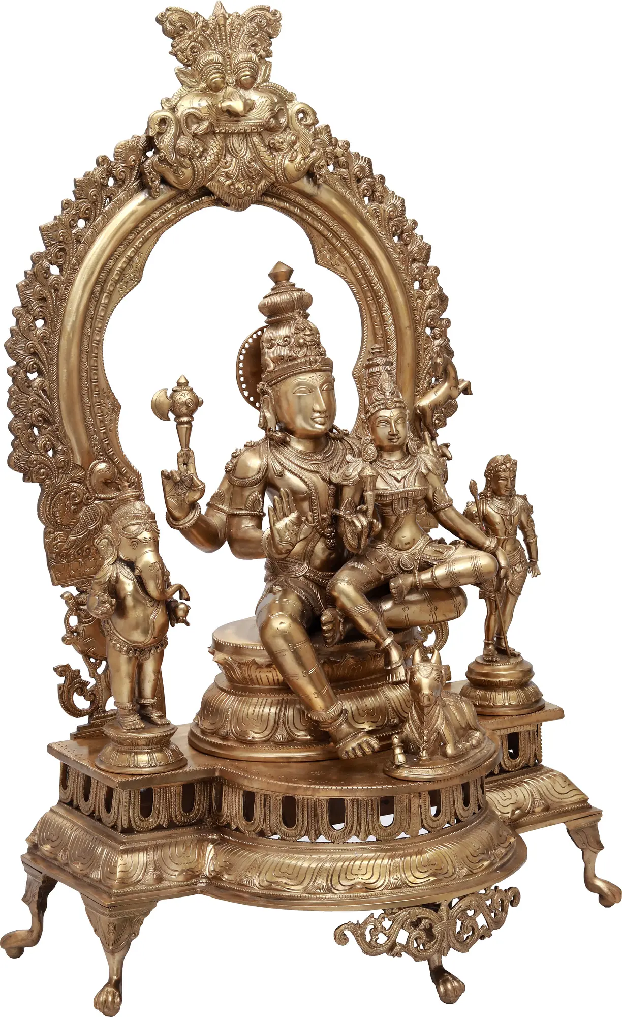 The much-revered Shiva parivar comprises of His wife, Parvati, and Their 2 sons, Ganesha and Kartika. Shiva Himself takes centrestage. His two posterior arms are holding divine weapons to battle adharma; He raises one anterior hand in blessing, while with the other He secures the lovely Parvati on His lap. She is also seated in lalitasana, and holds in Her hand a weapon. The harmonious, self-sufficient unit of life that They form together is superbly expressed in the way Their respective silhouettes have been made to align with each other by the artisans. Their intricately crafted, perfectly symmetrical crowns tower above Their heads, Their silk dhoties and ample shringar fit for the celestial realm They belong to. Seated in union on a layered lotus pedestal, with the graceful much-devoted Nandi sitting at the base, They form a complete picture of blissful togetherness.