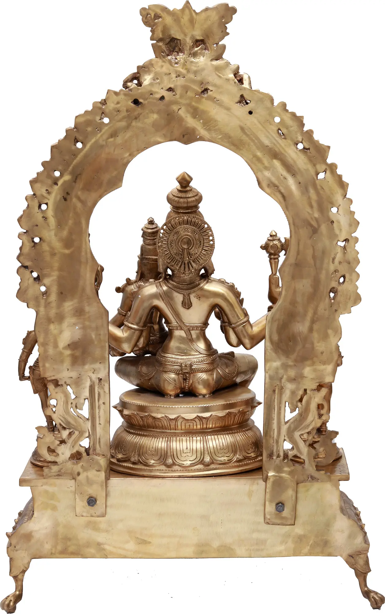 They are flanked by Ganesha and Kartika, each of Whom has been sculpted with Their iconographies intact. From Ganesha's adorable elephant head, the baby fat on His form, and the humungous laddoo in His hand; to Kartika's radiant handsomeness and the sublime proportions of His form. Like Their parents, Their shringar is flawless and Their stance that of great benevolence and blessing. They are each on a much smaller layered lotus pedestal, which together with Shiva-Parvati's seat are placed on an elaborate stand decorated with petal engravings. The aureole equals it in maginificence. The sheer detailing on each layer - the outermost wave-like curves, followed by the twisted lotus petals, the smooth rim as if of a halo, more twisted petals, and two rings engraved with rangoli-esque motifs - sets this ensemble apart from run-of-the-mill enshrined Shiva-parivar statues.