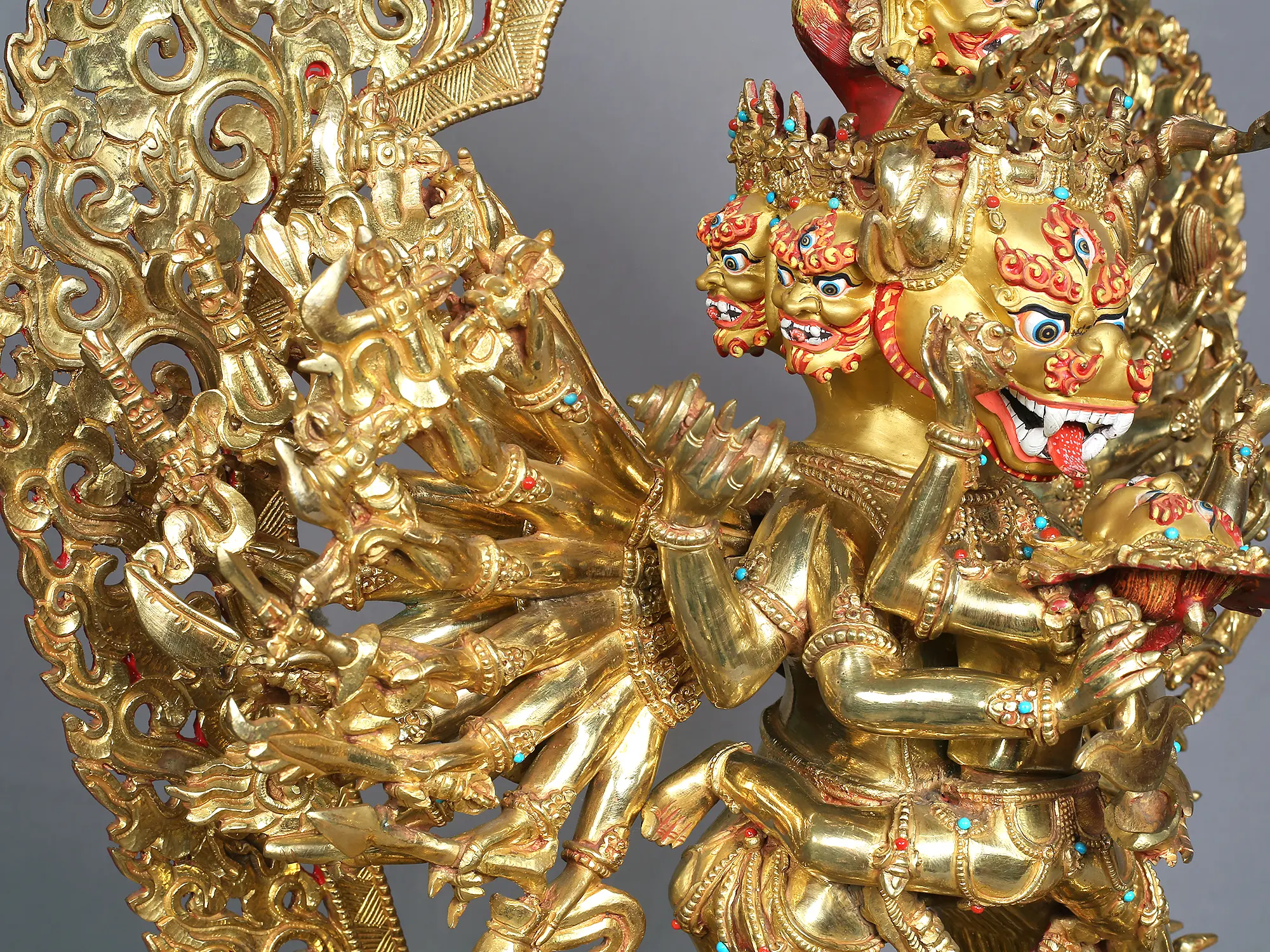 A majestic expansion of the powers of Bodhisattva Manjushri, this gilded copper statue from Nepal depicts Megh Sambara, a potent Vajrayana guardian deity, worshipped by his followers for protection against worldly and otherworldly troubles. The buffalo-headed god is in a dynamic Yab-Yum (father-mother) posture with his Shakti, haloed by his multiple hands and fires representing pure wisdom. Various demons and obstacles in the path of dhamma lie in his feet, prostrating in front of Megh Sambara’s unfathomable greatness.