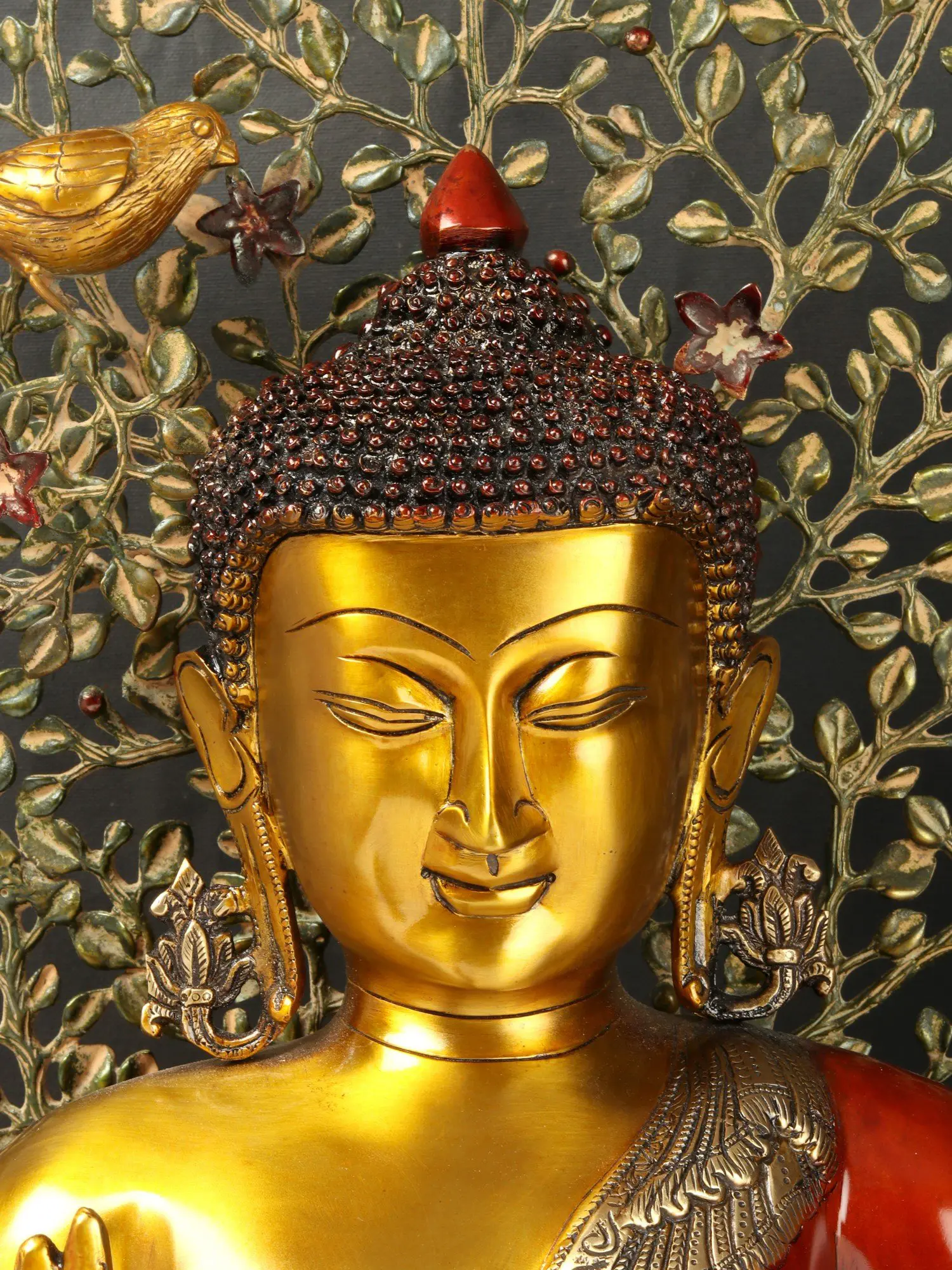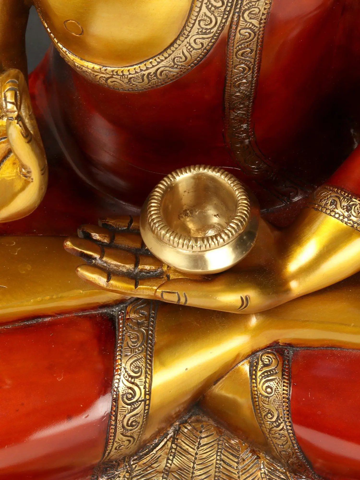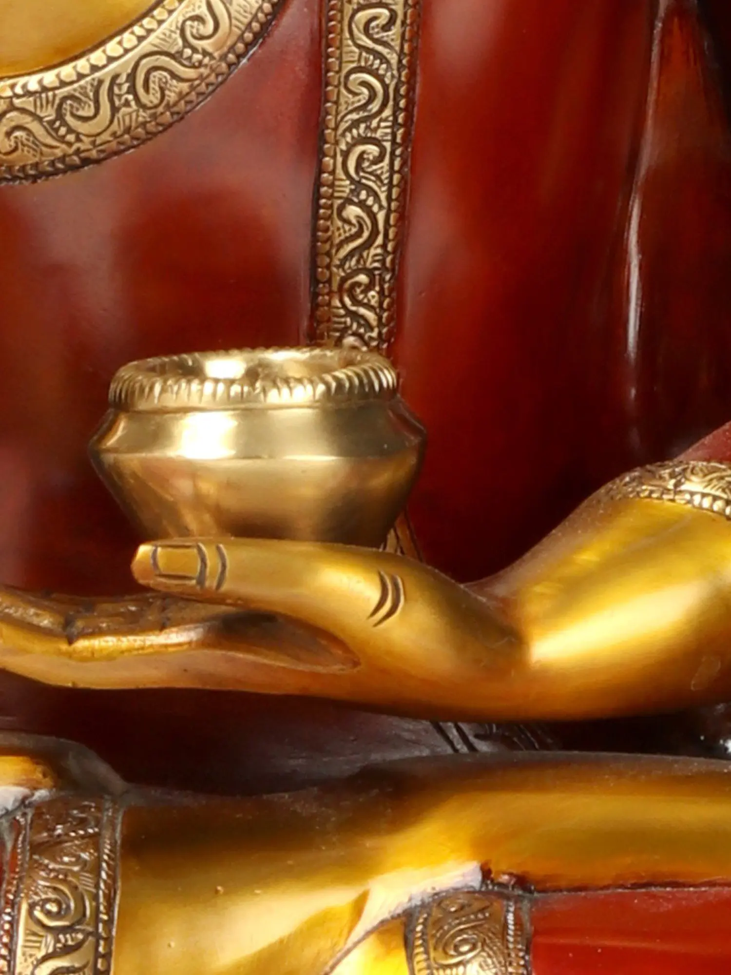 This seated Buddha murti comes in 2 colour finishes. One features a solid gold colour palette, while the other is clad in a strikingly coloured robe of molten crimson. In the case of the latter, the same colour has been introduced in the lotus throne as well as in the canopy.