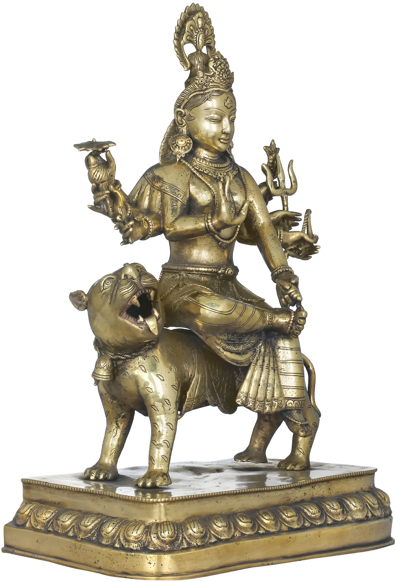 This magnificent brass statue showcases meticulous craftsmanship. The intricate details of Durga's divine adornments, her serene yet resolute expression, and the fierce majesty of her lion vahana are all rendered with remarkable precision. The warm, lustrous sheen of the brass adds a timeless elegance, making this piece a treasured artifact. The symbolism is profound: the lion represents ego and power, which the Goddess has mastered, while her multiple arms signify her omniscience and omnipresence. Owning this statue is not just acquiring an object of art; it is inviting a divine presence that inspires bravery, dispels fear, and embodies the ultimate power of good. It serves as a constant reminder of the divine mother's watchful gaze and her protective embrace, offering solace and strength to all who behold her.
